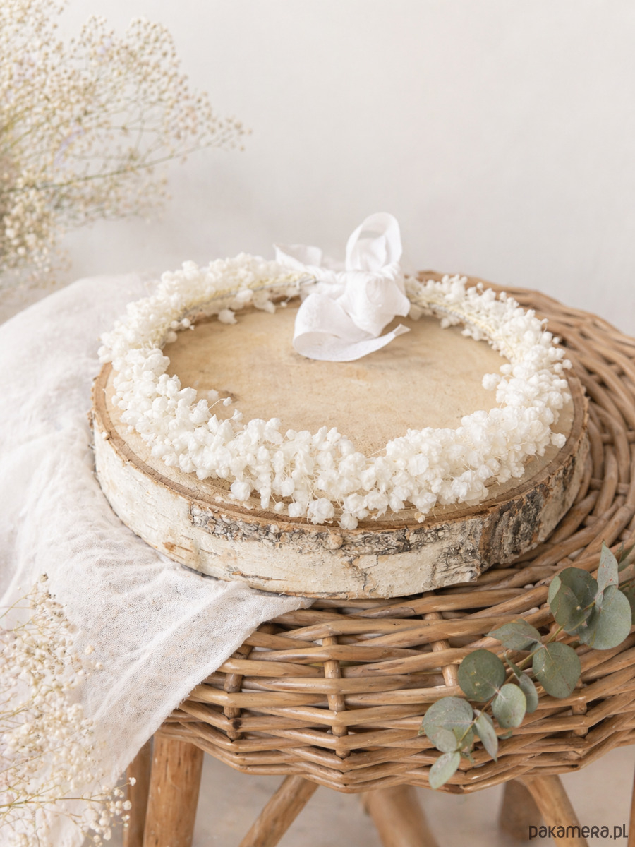 Wianek na głowę z roślinności naturalnej i trwałej: stabilizowanej gipsówki bielonej.