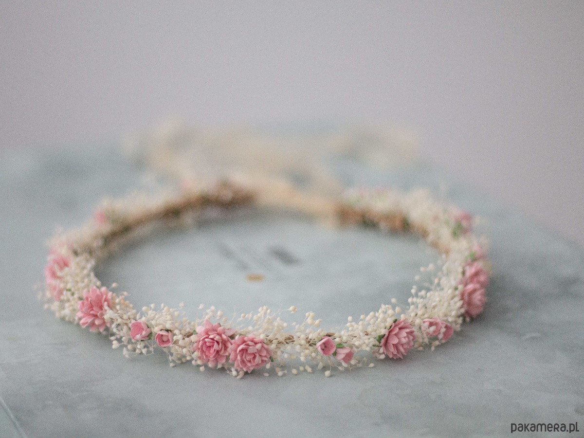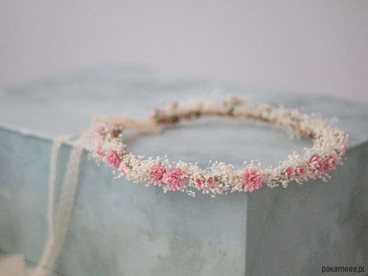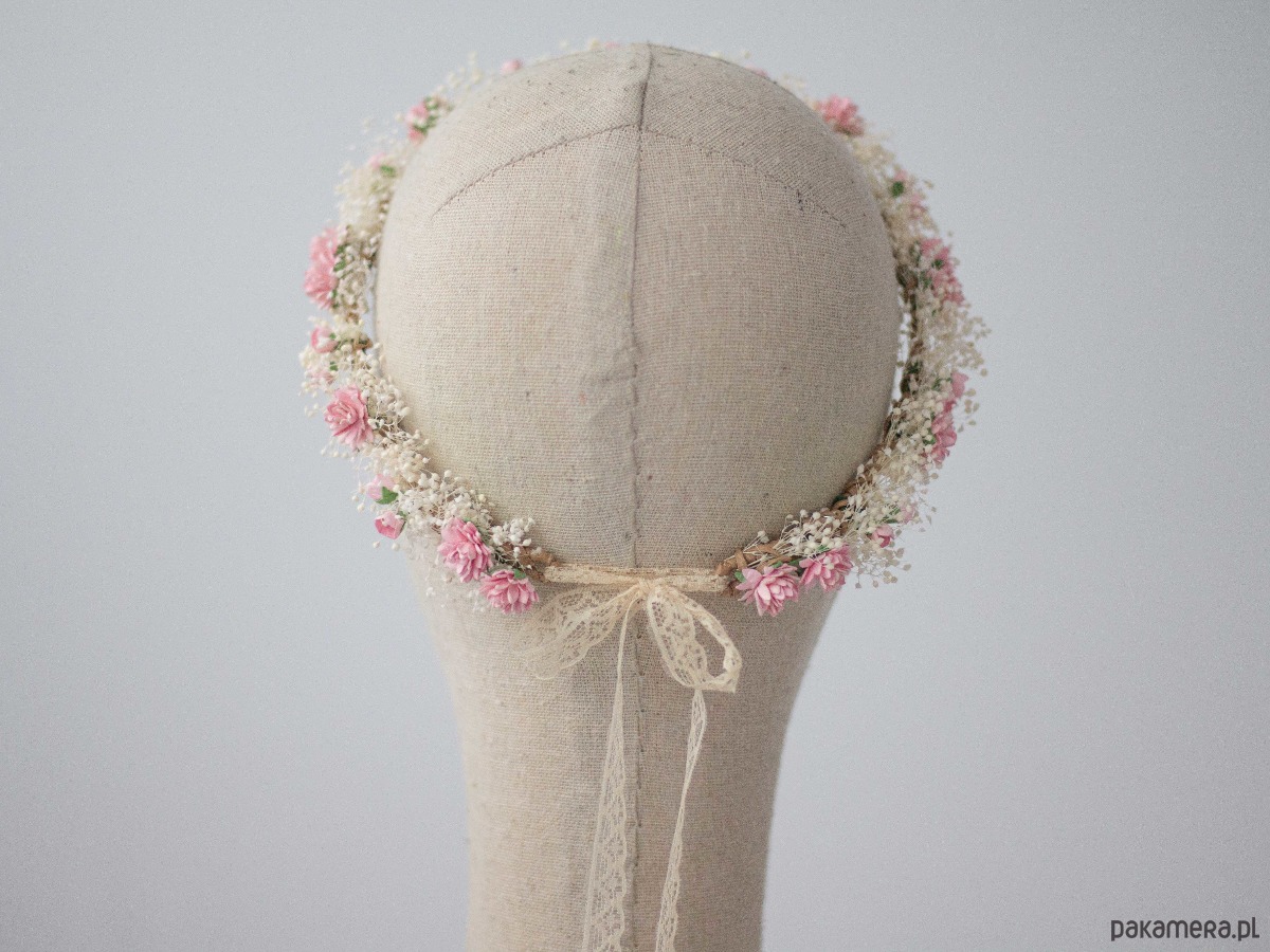 Romantyczny wianek na głowę wykonany z naturalnej, stabilizowanej gipsówki, papierowych kwiatów i syntetycznych listków. Możliwość regulacji wielkości obwodu, dzięki koronkowej tasiemce z tyłu. Będzie pasował zarówno na głowę dziecka, jak i osoby dorosłej.