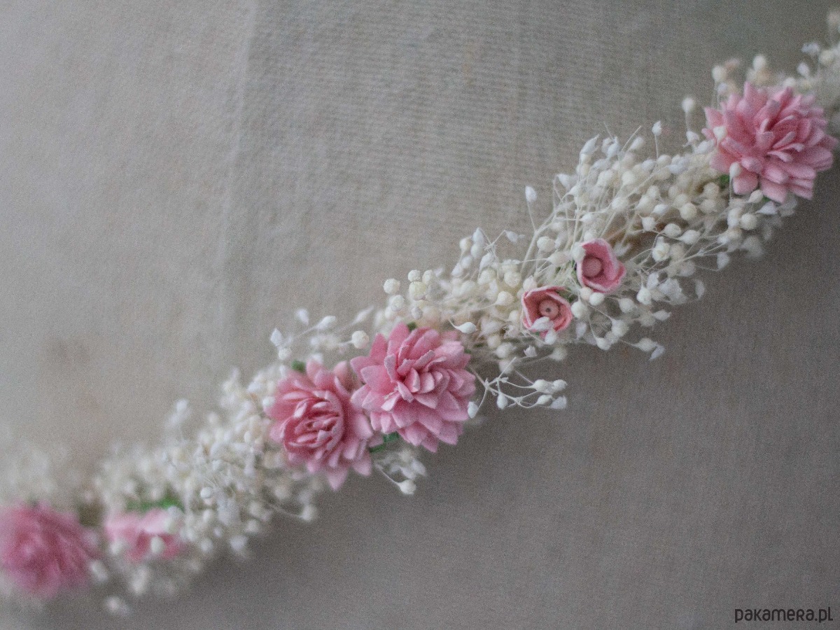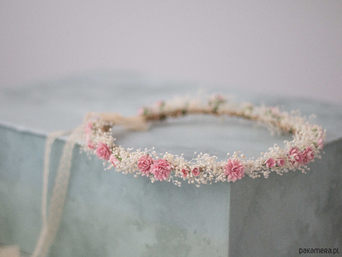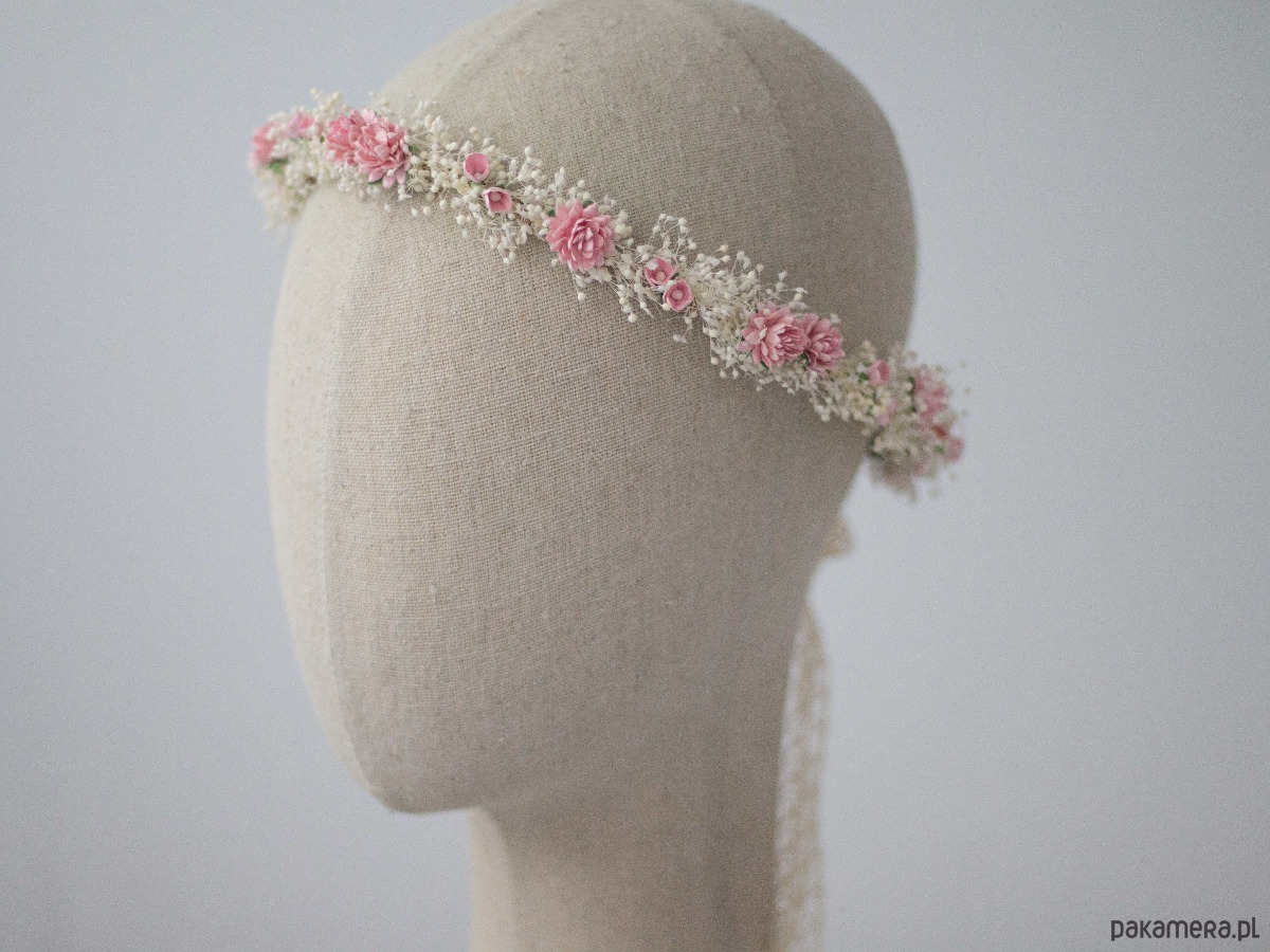 Romantyczny wianek na głowę wykonany z naturalnej, stabilizowanej gipsówki, papierowych kwiatów i syntetycznych listków. Możliwość regulacji wielkości obwodu, dzięki koronkowej tasiemce z tyłu. Będzie pasował zarówno na głowę dziecka, jak i osoby dorosłej.