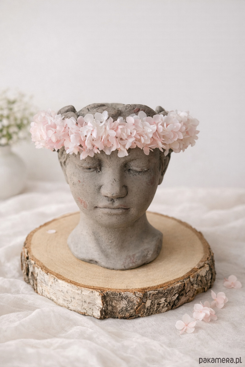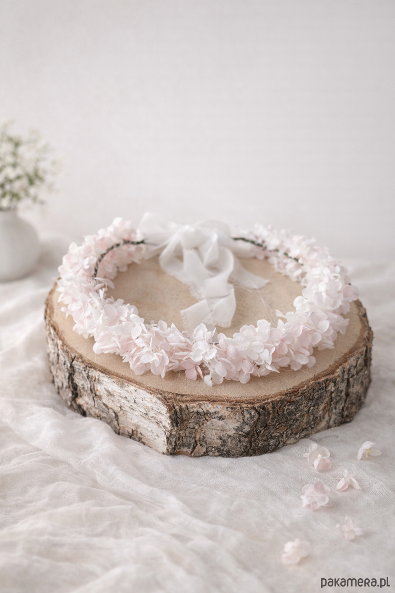 Wianek na głowę wykonany z hortensji stabilizowanej w dwóch kolorach: jasnego różu i bieli.