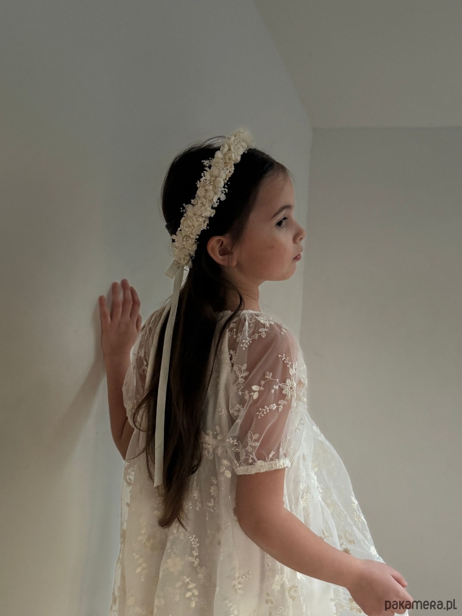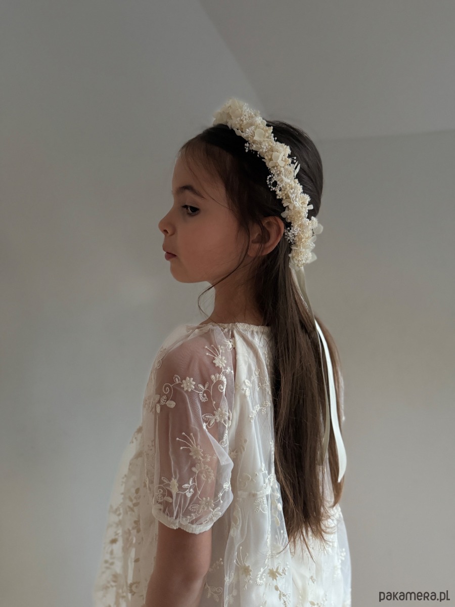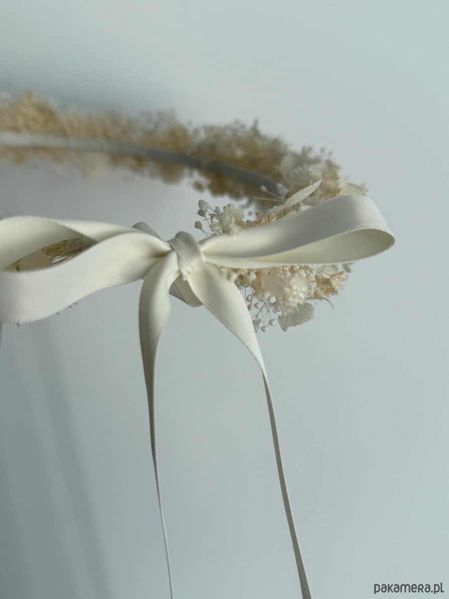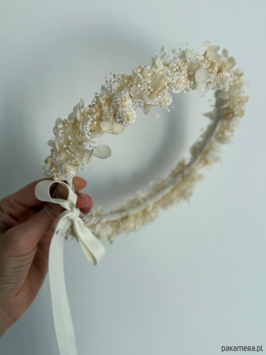 Wianek na głowę wykonany z naturalnych, stabilizowanych, suszonych elementów: gipsówki oraz biało-bezowej Hortensji oraz kwiatków Kocanki.