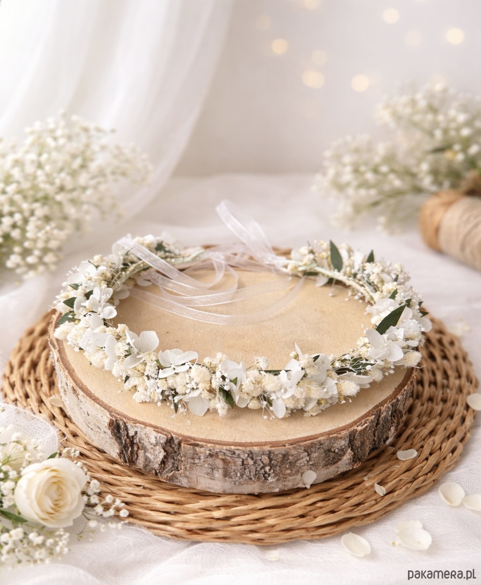 Wianek na głowę z roślinności naturalnej i trwałej: stabilizowanej hortensji, eukaliptusa, gipsówki mini, gipsówki klasycznej i Mikołajka.