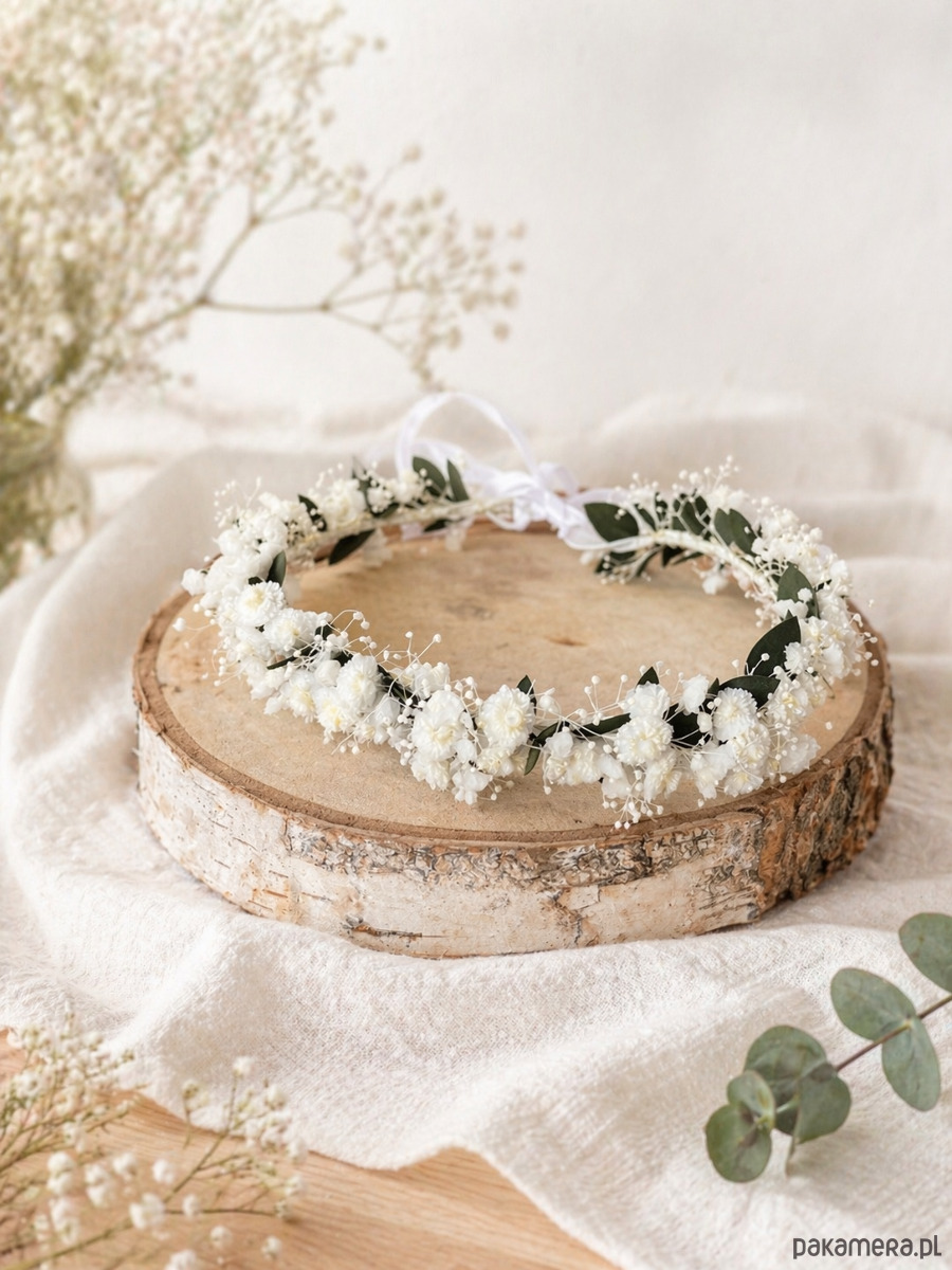 Wianek na głowę z roślinności naturalnej i trwałej: stabilizowanego eukaliptusa, gipsówki mini, gipsówki klasycznej bielonej, kocanki włoskiej