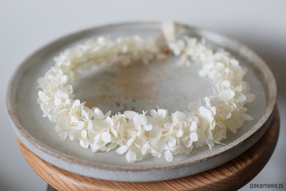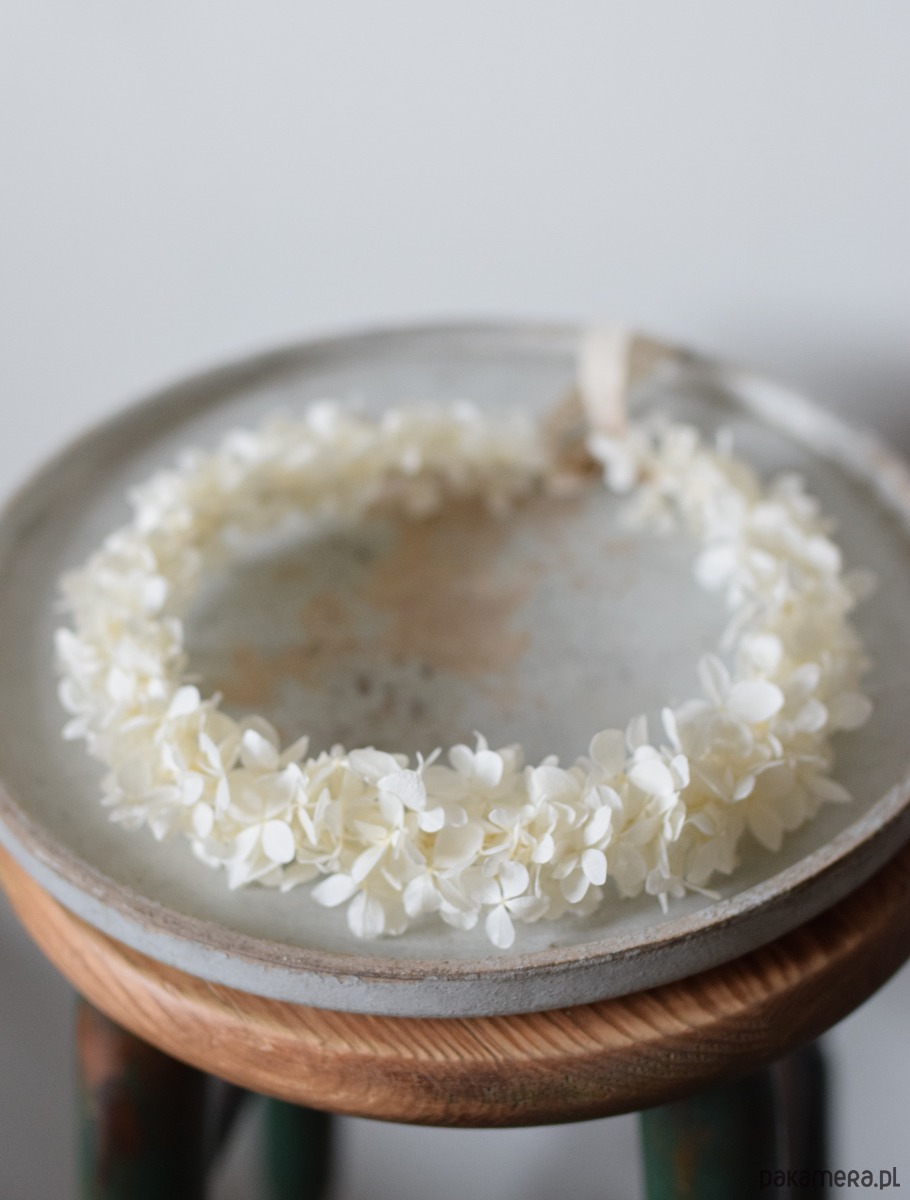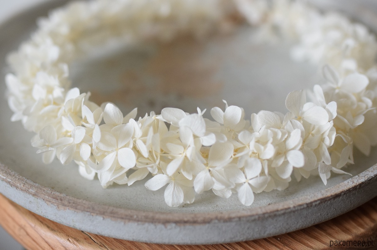 Klasyka komunijna, uroczy wianek na głowę z stabilizowanej hortensji.
