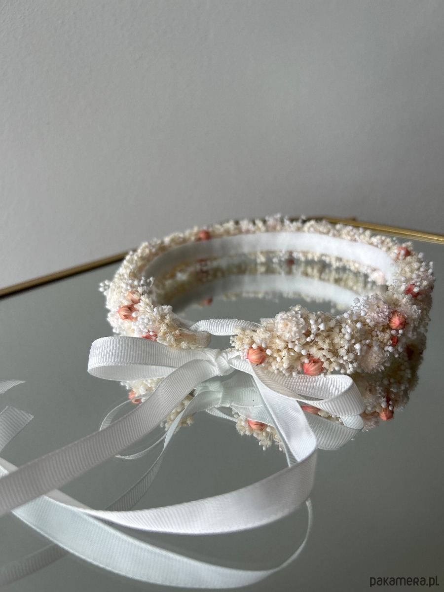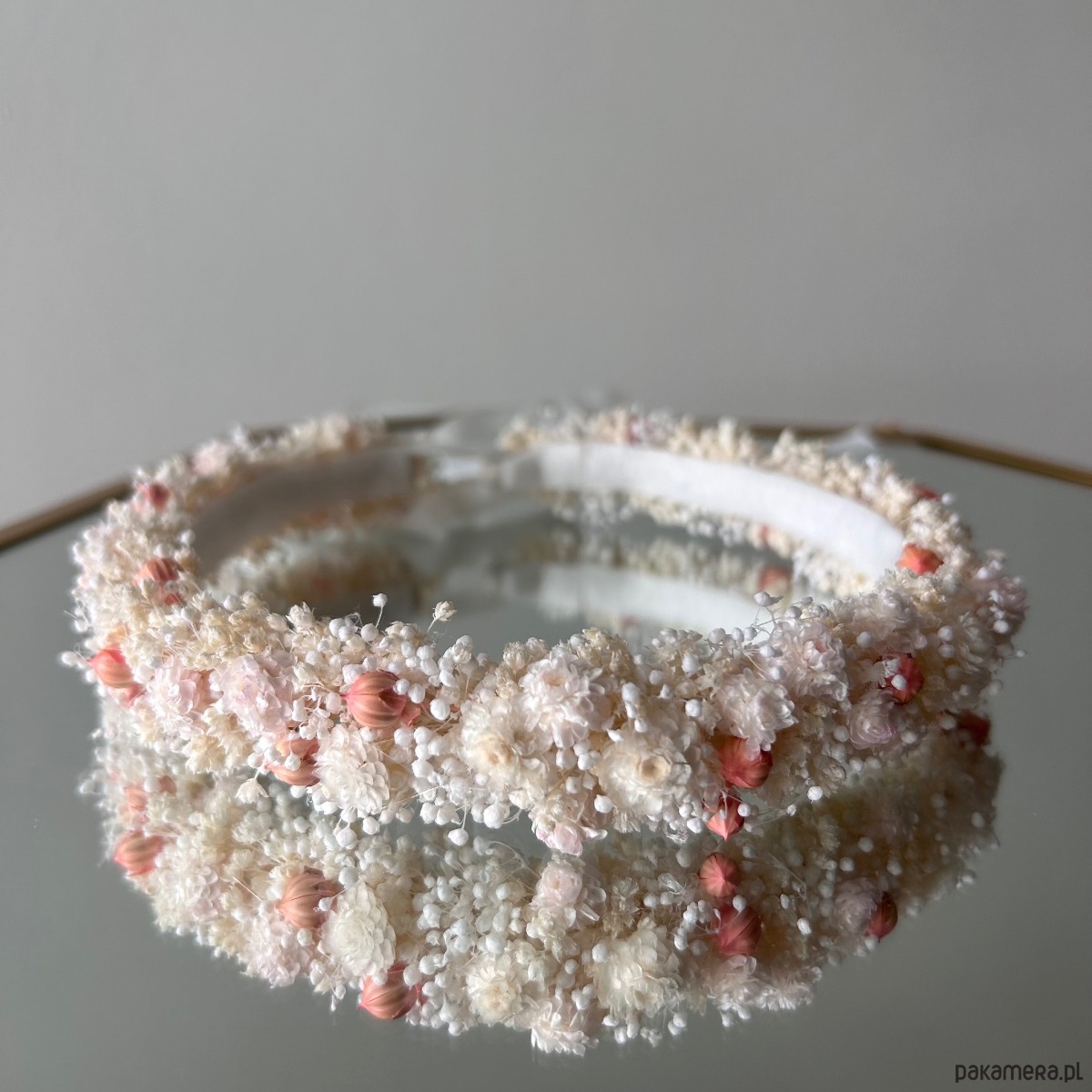 Piękny, kremowy wianek na głowę, wykonany z suszonej, stabilizowanej gipsówki z dodatkiem suszonych kwiatków.