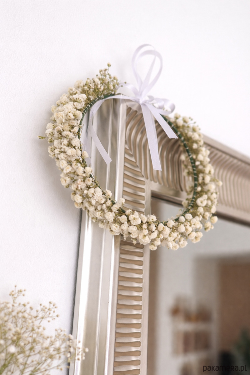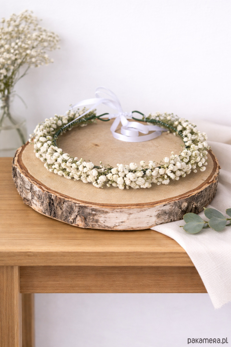 Wianek na głowę z roślinności naturalnej i trwałej: stabilizowanej gipsówki.