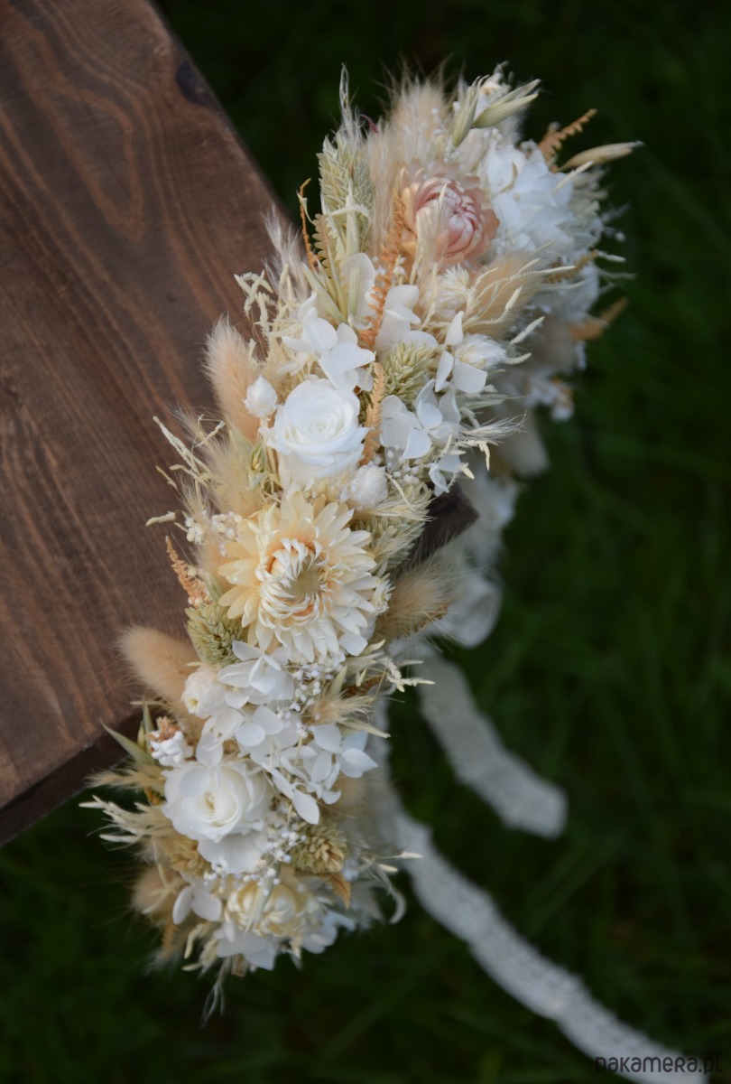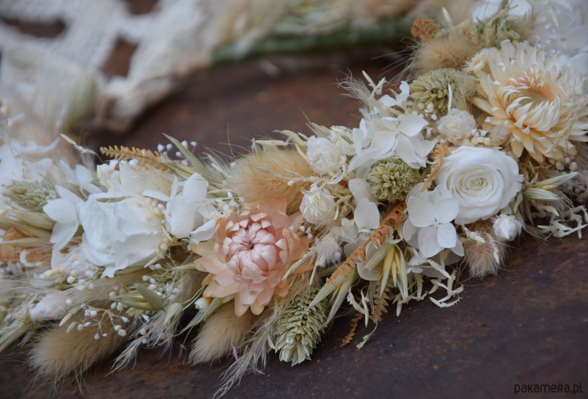 Wianek na głowe stworzony jest z suszonych traw i kwiatów oraz stabilizowanej gipsówwki róż i hortensji.