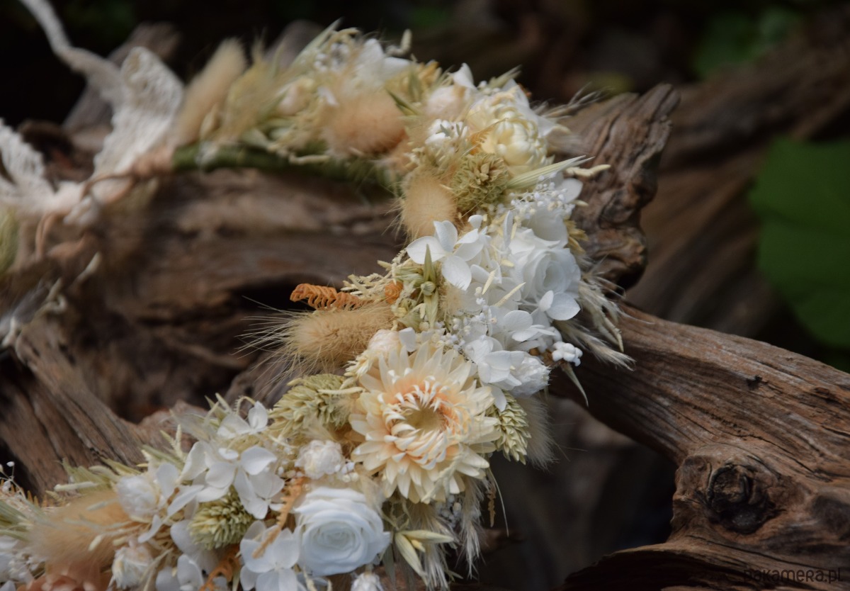 Rustykalny wianek na głowę z suszonych i stabilizowanych kwiatów to idealny dodatek do stylizacji Panny młodej lub druhny.