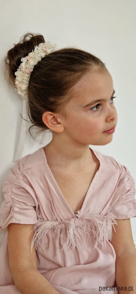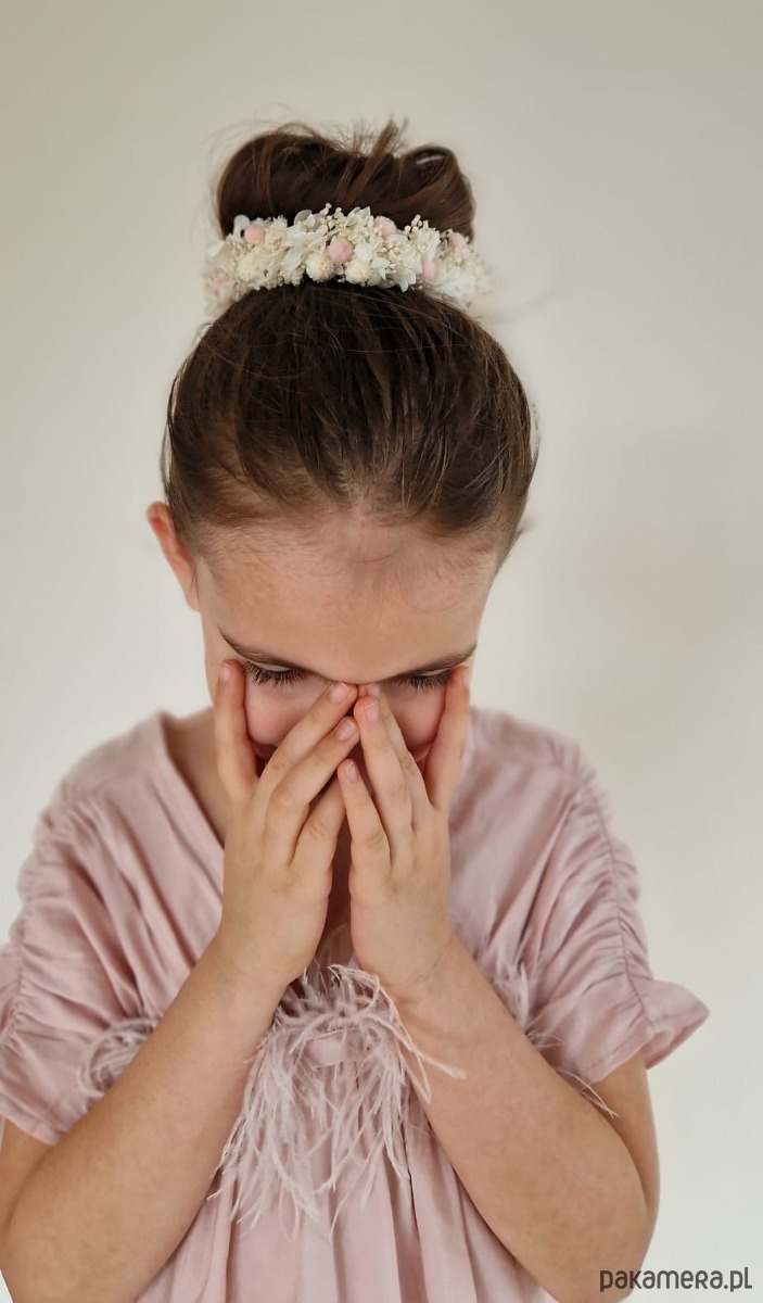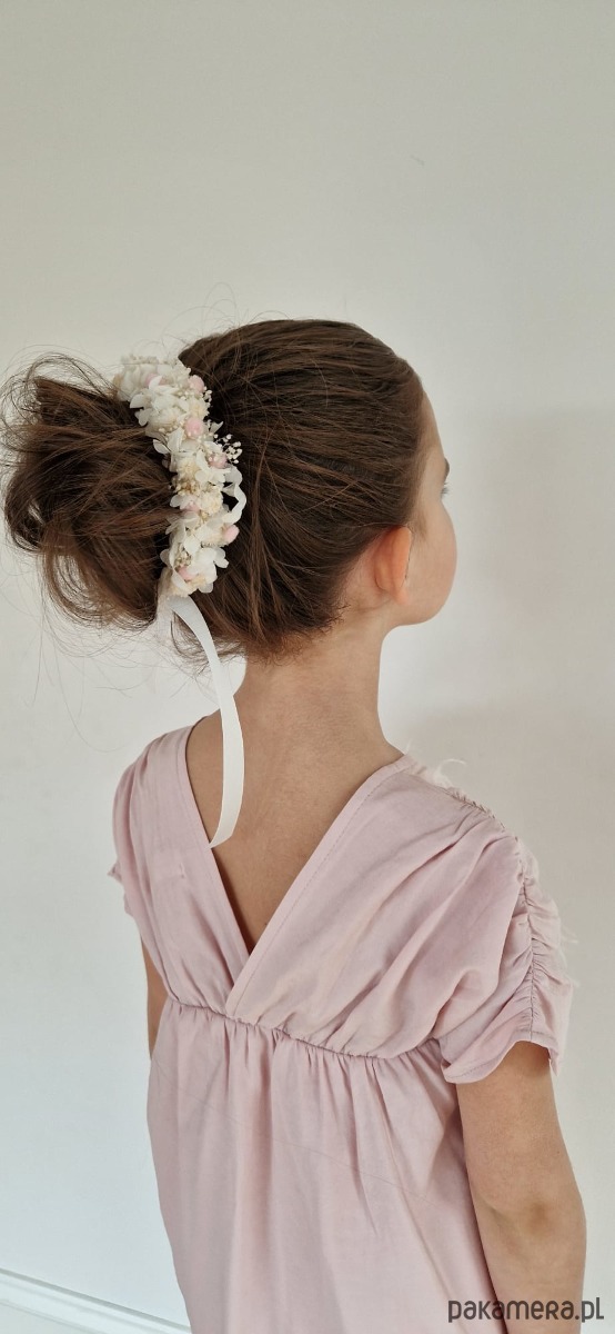 Wianek na koka wykonany z naturalnych, stabilizowanych, suszonych elementów: białej Hortensji, gipsówki, różowe kuleczek.