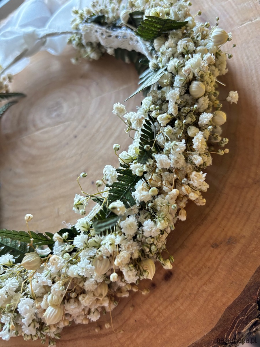 Wianek na komunię naturalny z gipsówki i paproci biel zieleń