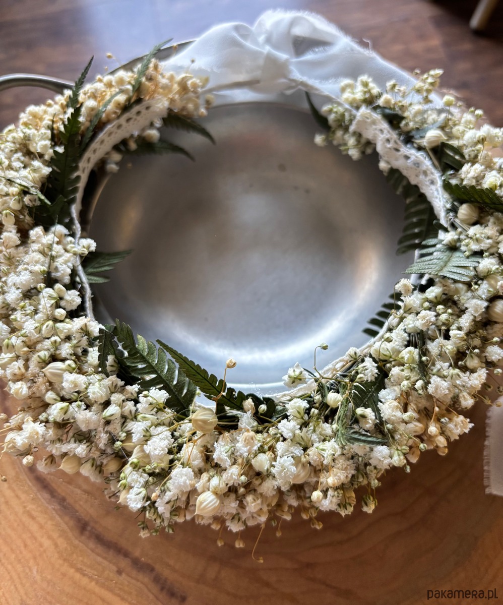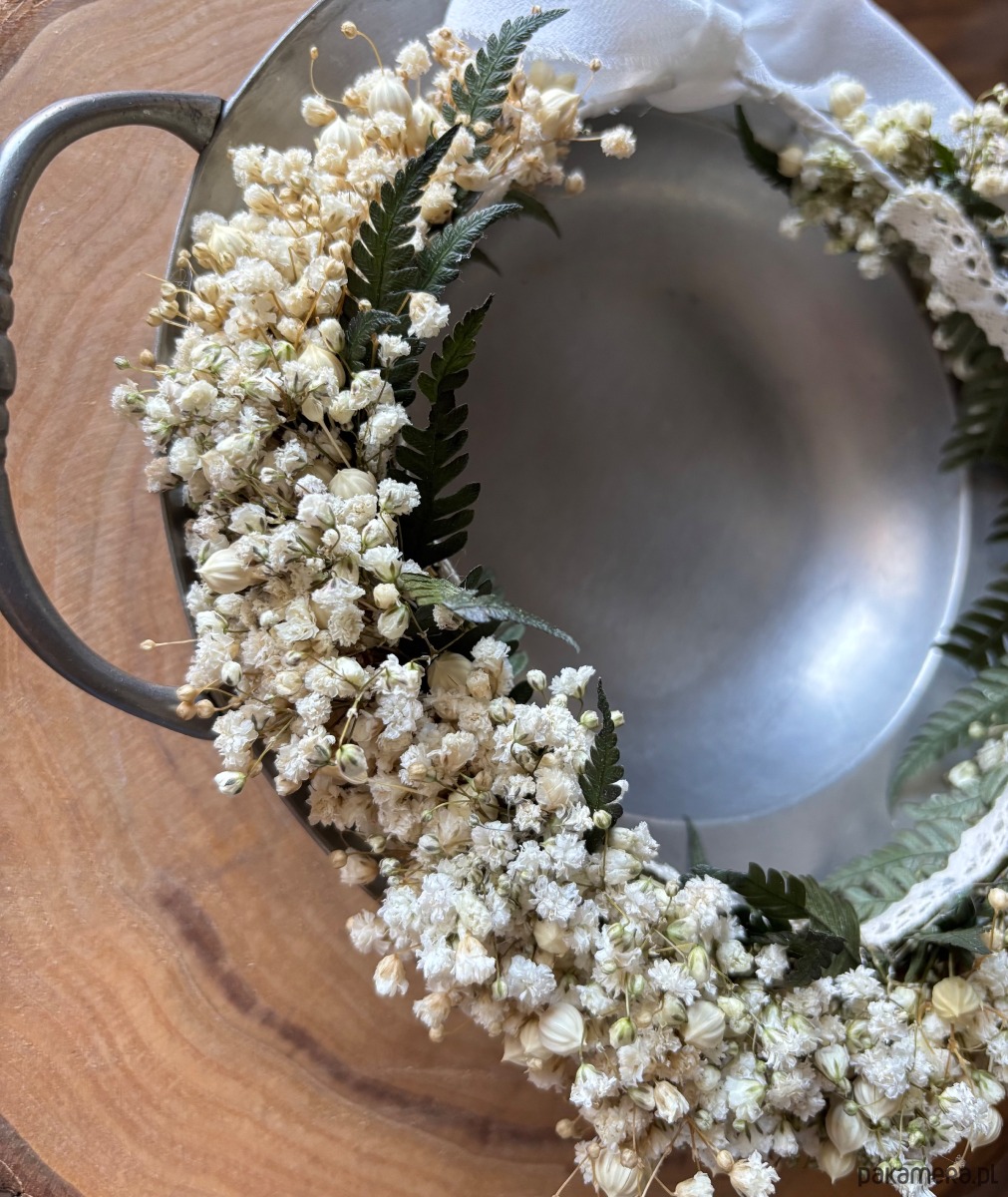 Naturalny wianuszek wykonany z gipsówki, paproci i bielonego lnu to zestaw doskonały.