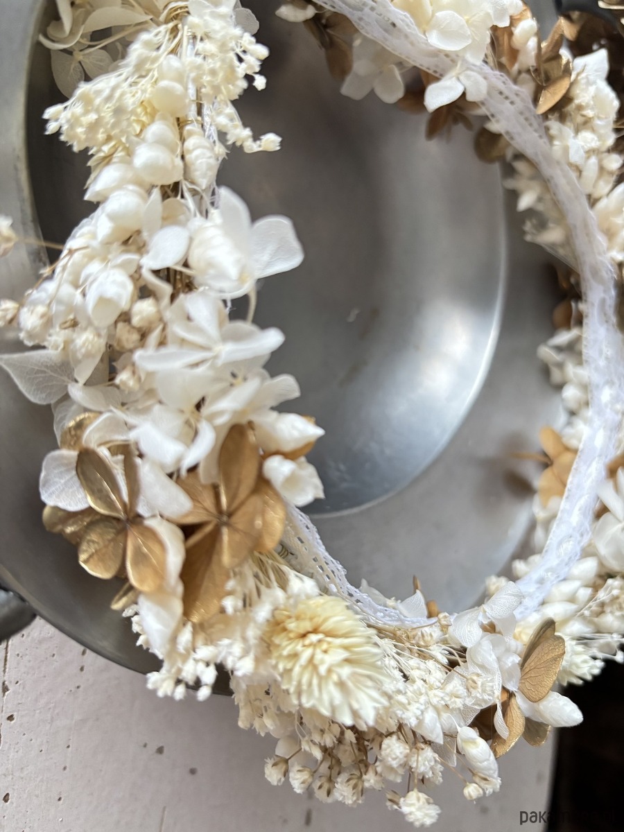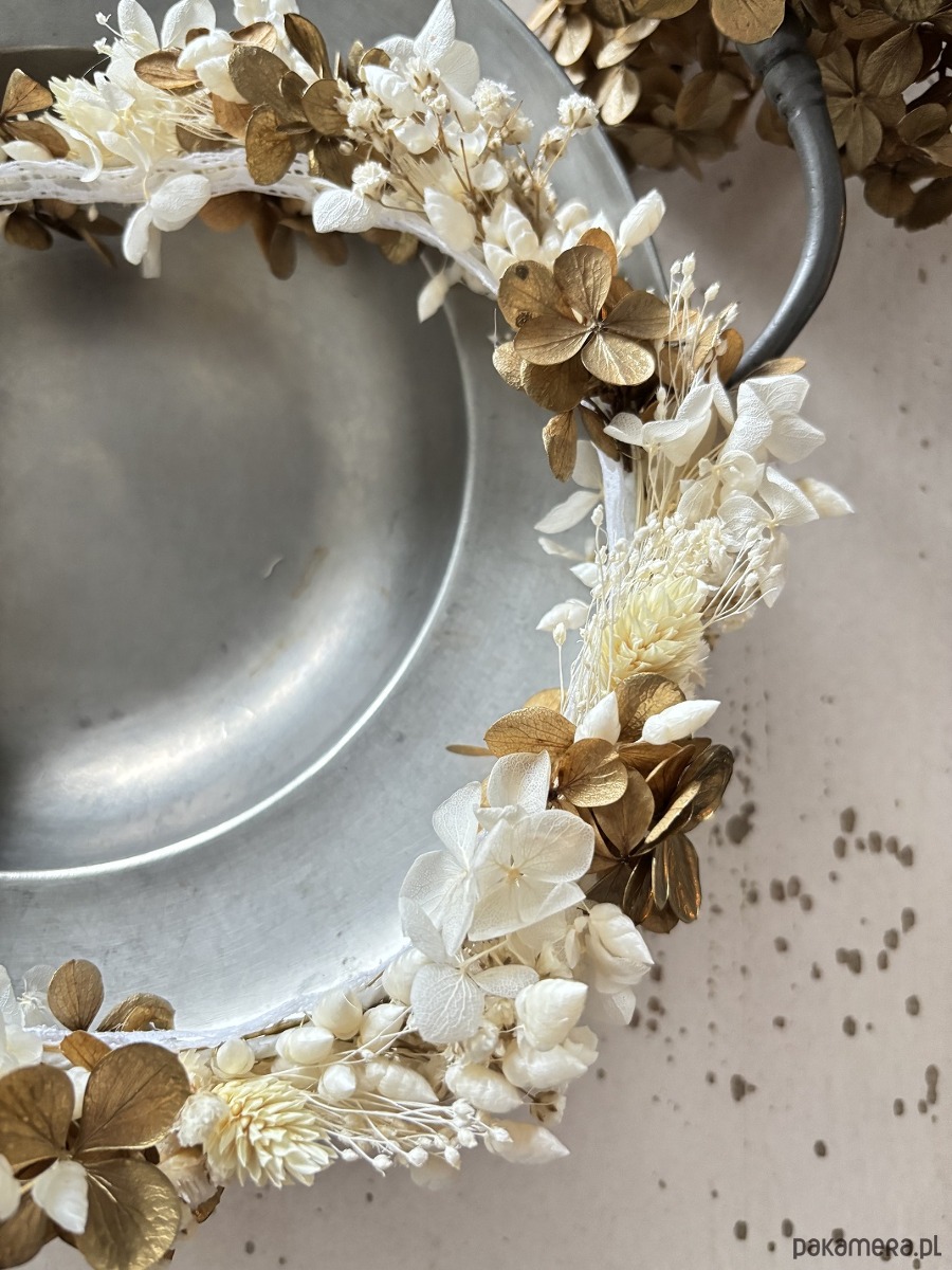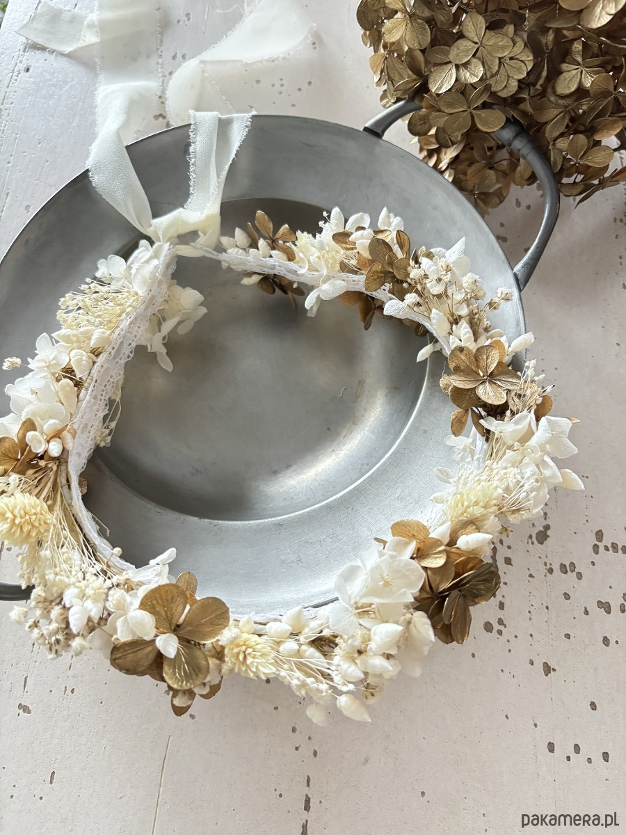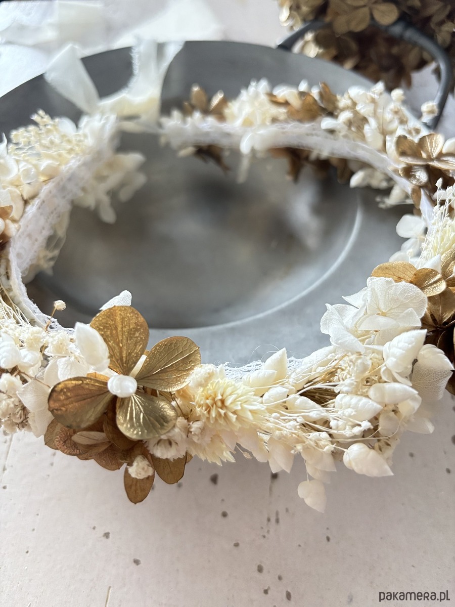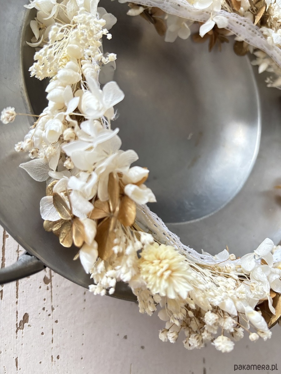 Wianek na komunię z suszonych i stabilizowanych kwiatów biało - złoty