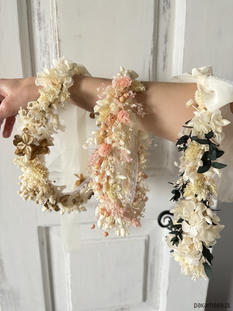 Subtelny wianek komunijny wykonany z suszonych i stabilizowanych kwiatów.