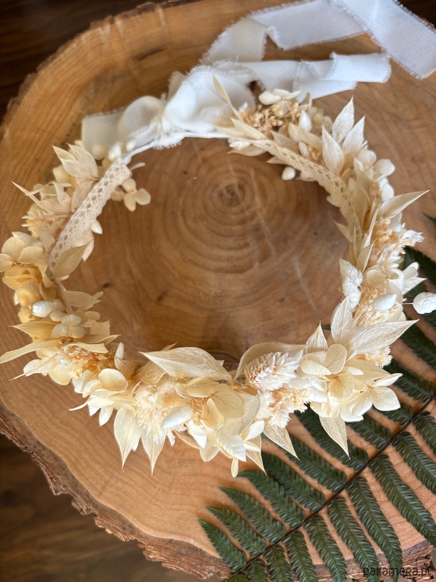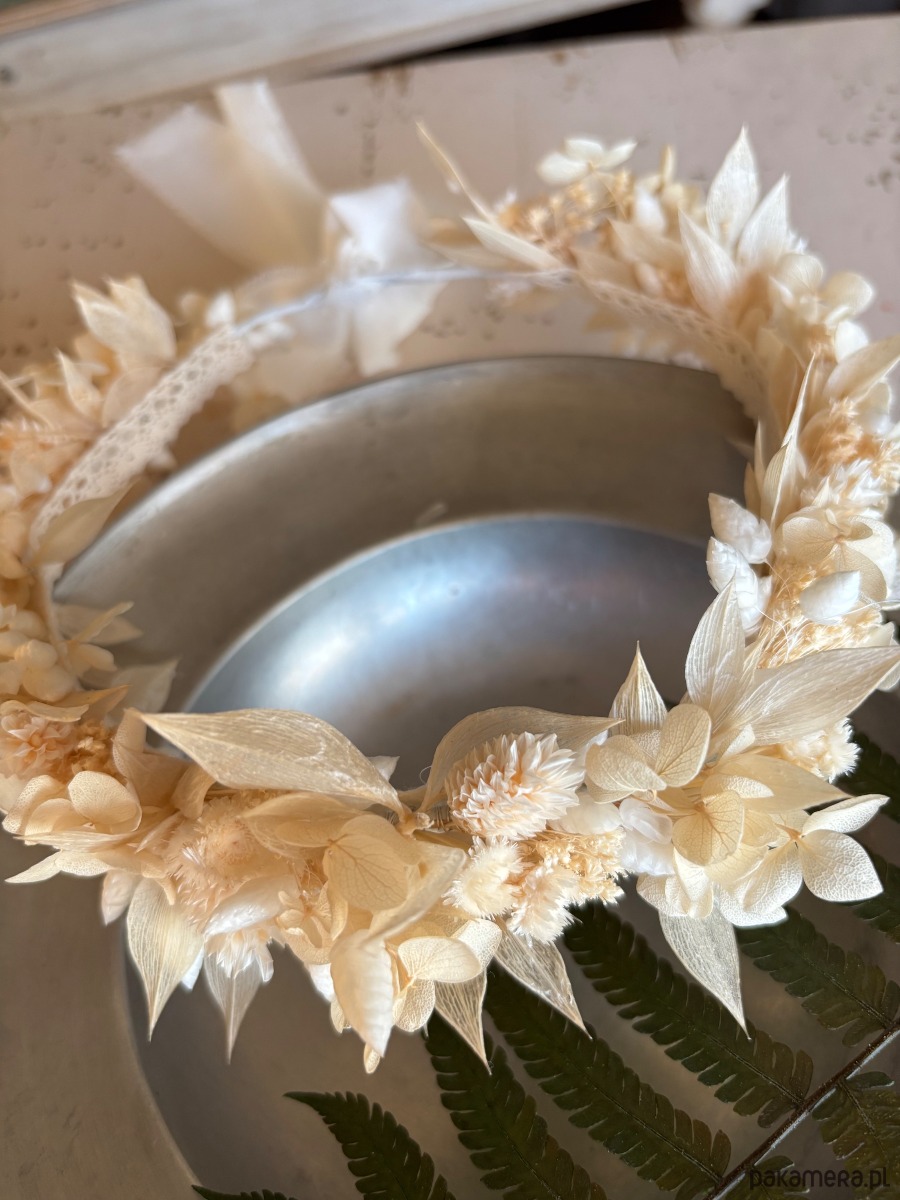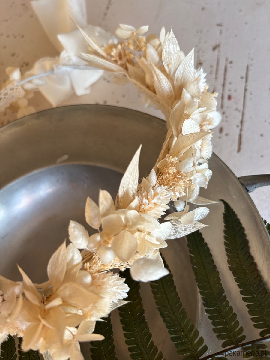 Wianek na komunię z suszonych i stabilizowanych kwiatów złamana biel