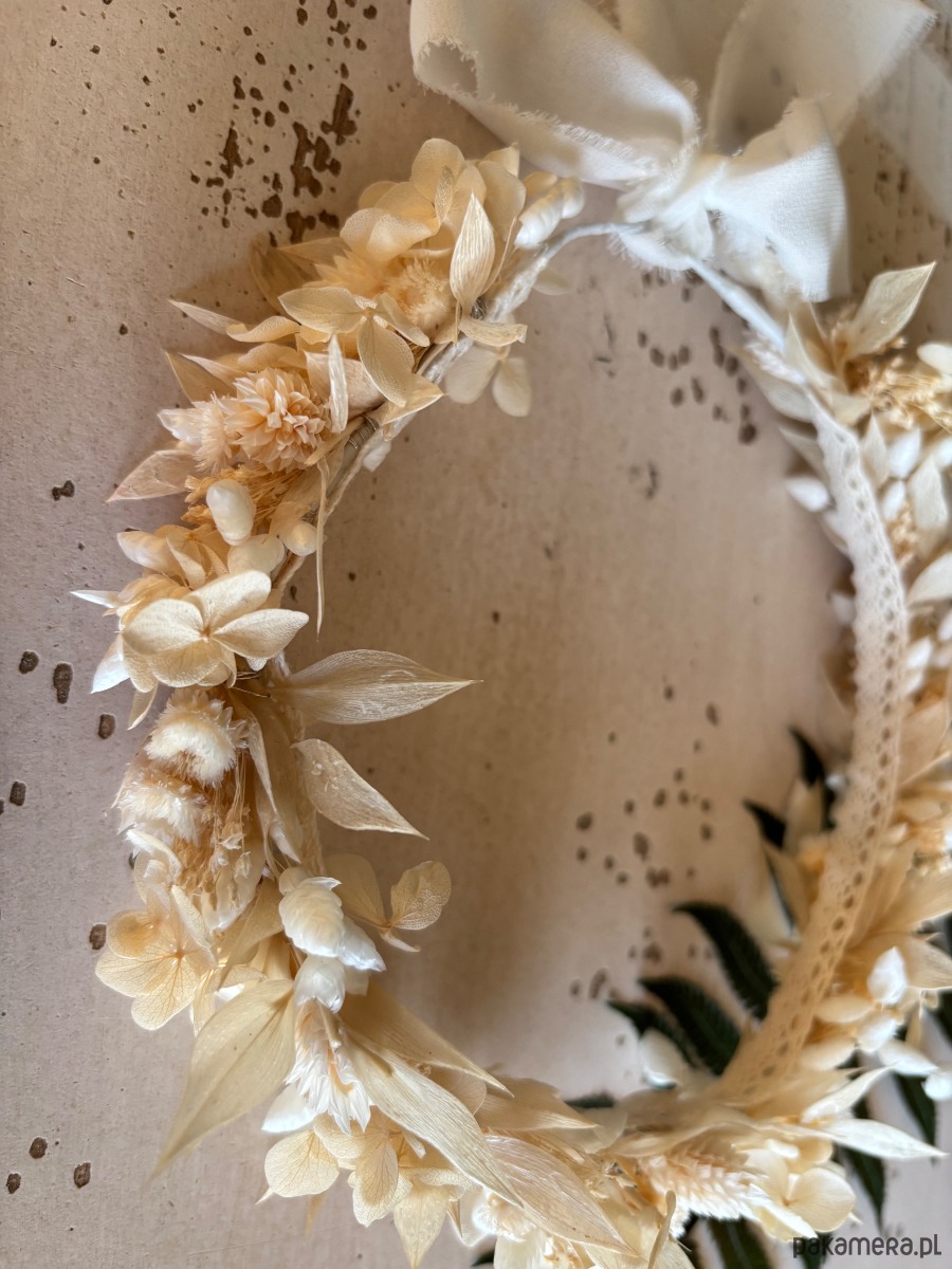 Subtelny wianek komunijny wykonany z suszonych i stabilizowanych kwiatów.