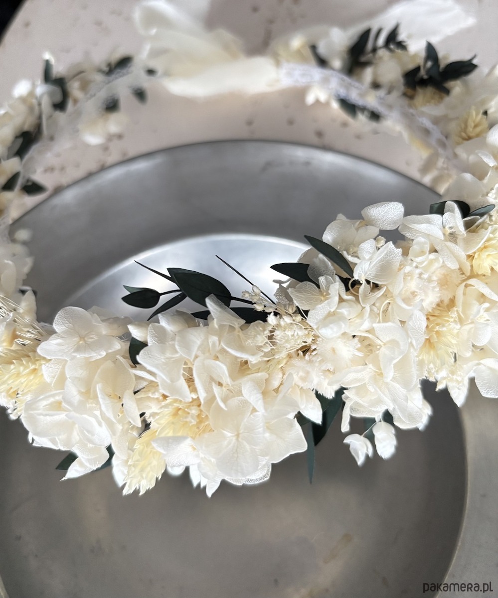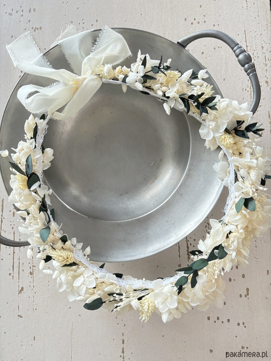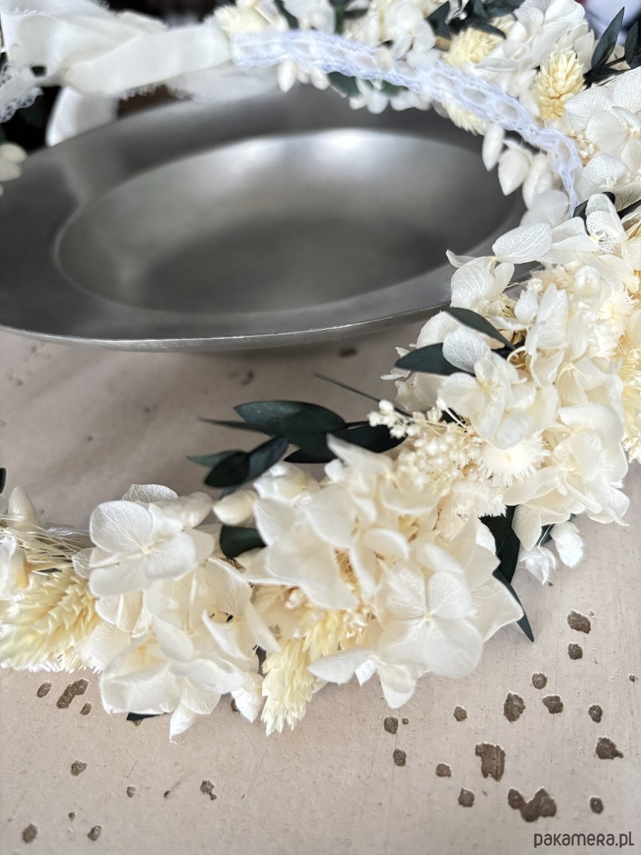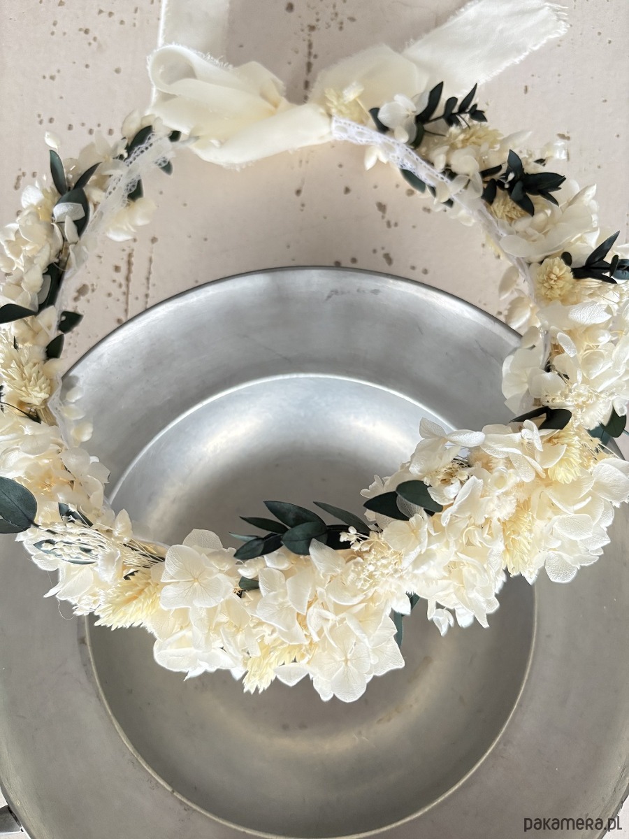 Wianek na komunię z suszonych i stabilizowanych kwiatów biel zieleń