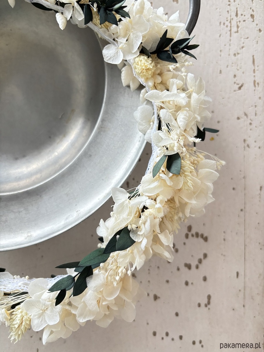 Naturalny wianuszek wykonany z drżączki, żarnowca, mozgi, glixi i hortensji w kolorze złamanej bieli oraz z dodatkiem pachnącego stabilizowanego eukaliptusa.