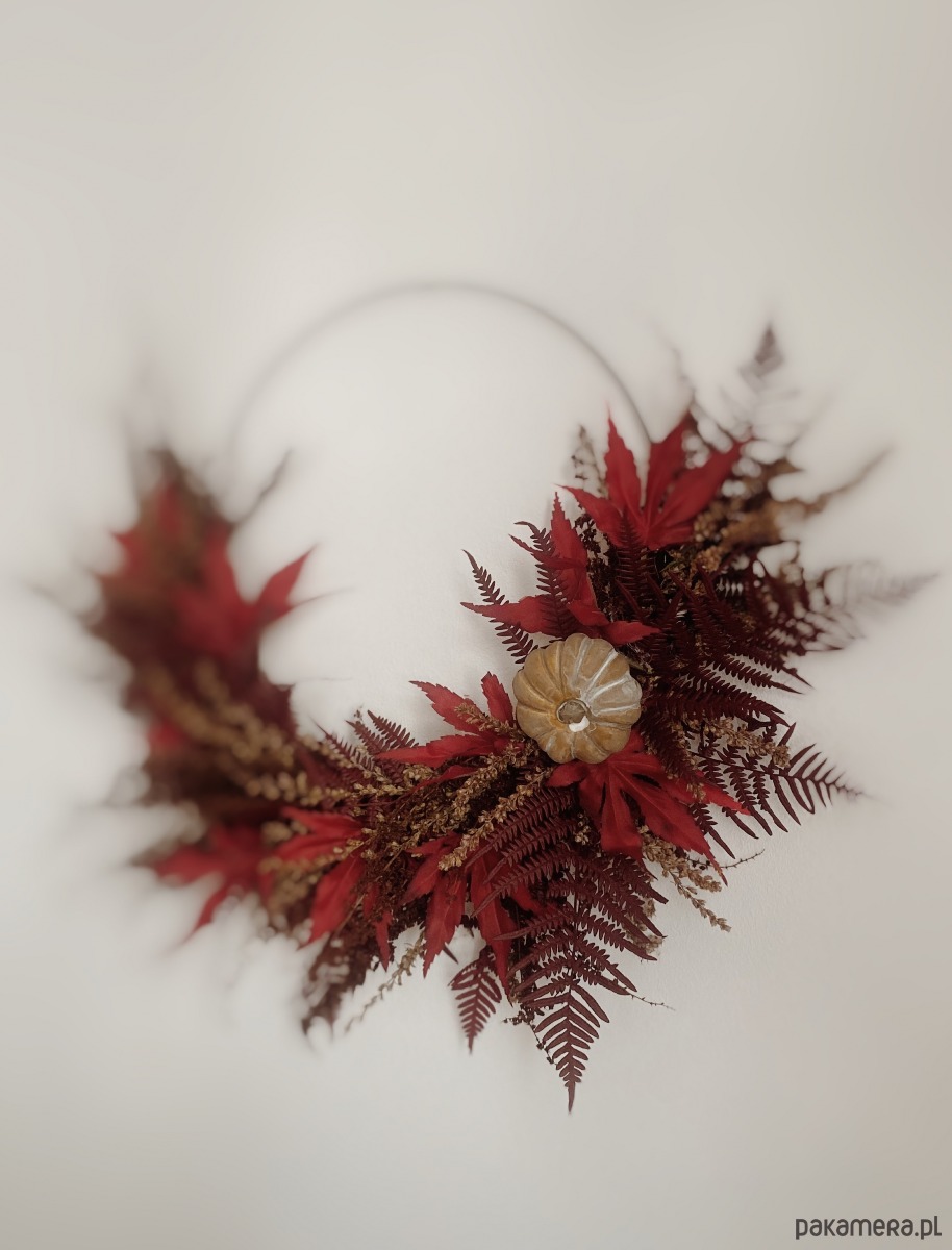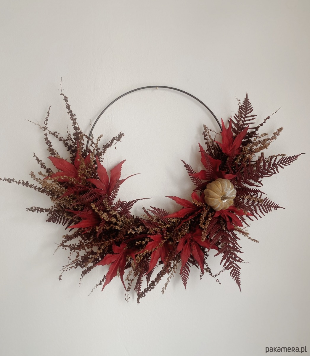 Wianek na metalowym ringu z ozdobną dynią oraz suszem naturalnym . Średnica ok 43cm