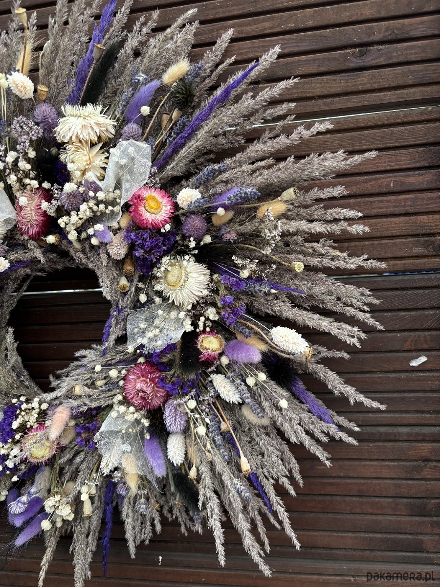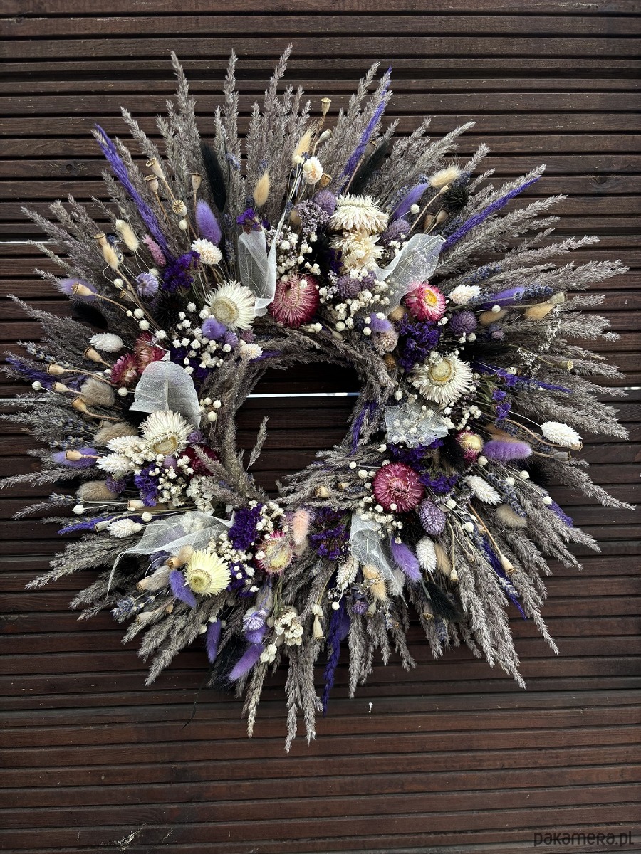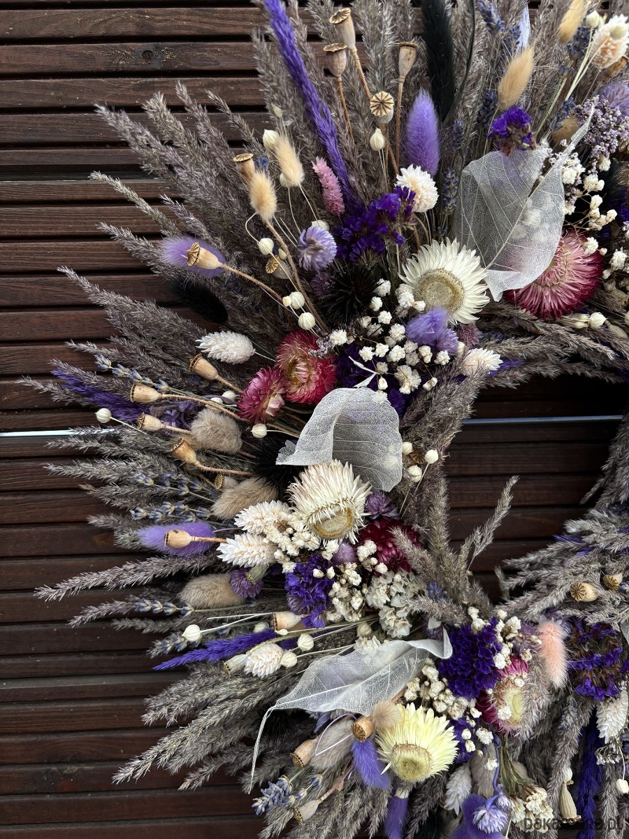 Naturalny wianek z suszonych i stabilizowanych kwiatów w fioletowym kolorze z domieszką bieli i burgundowego różu.