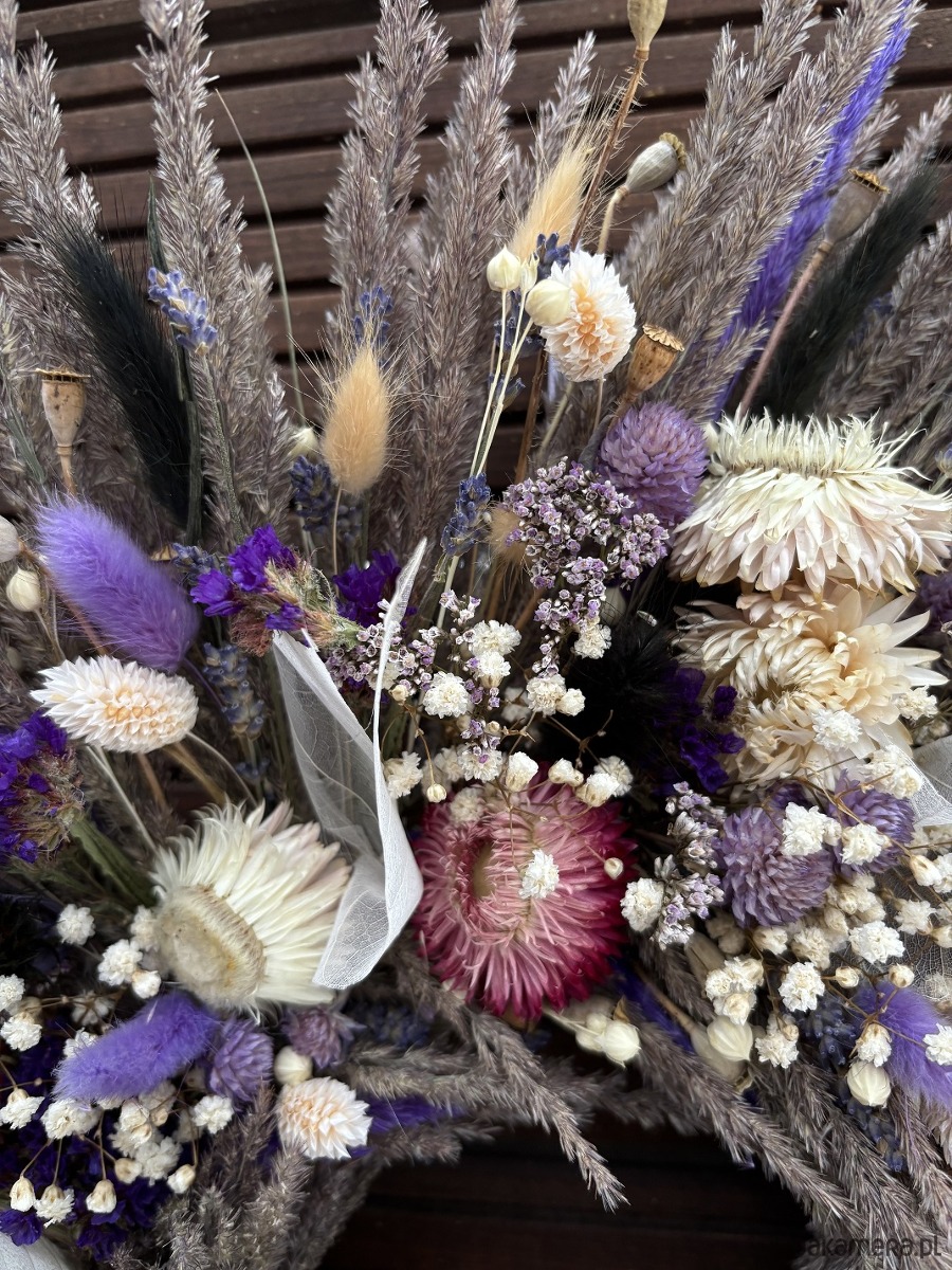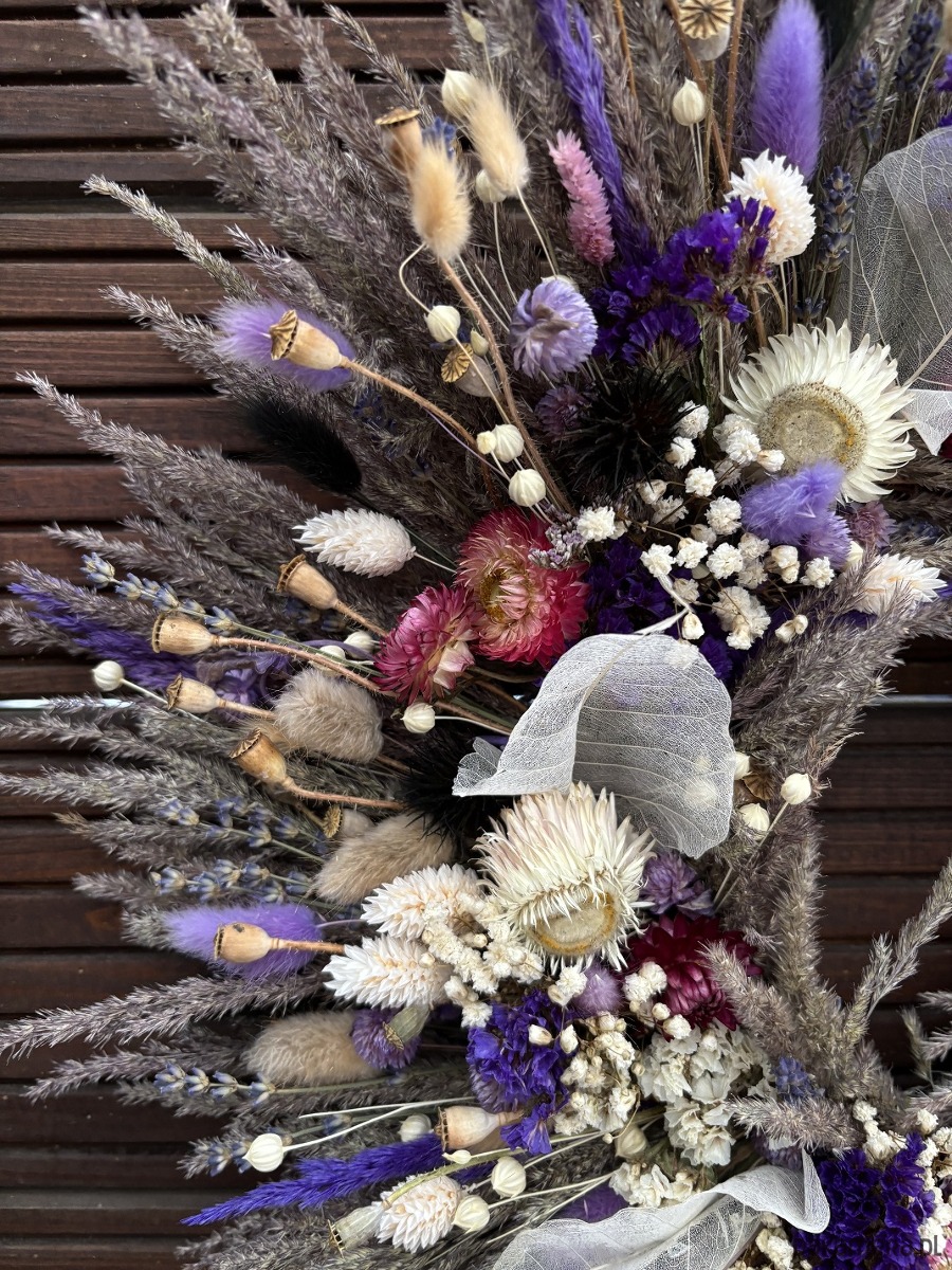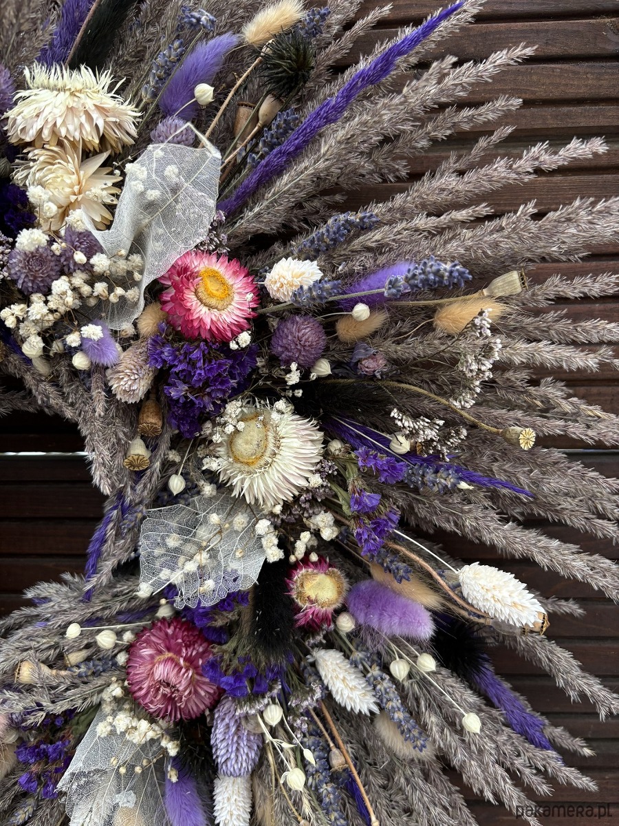 Naturalny wianek z suszonych i stabilizowanych kwiatów w fioletowym kolorze z domieszką bieli i burgundowego różu.