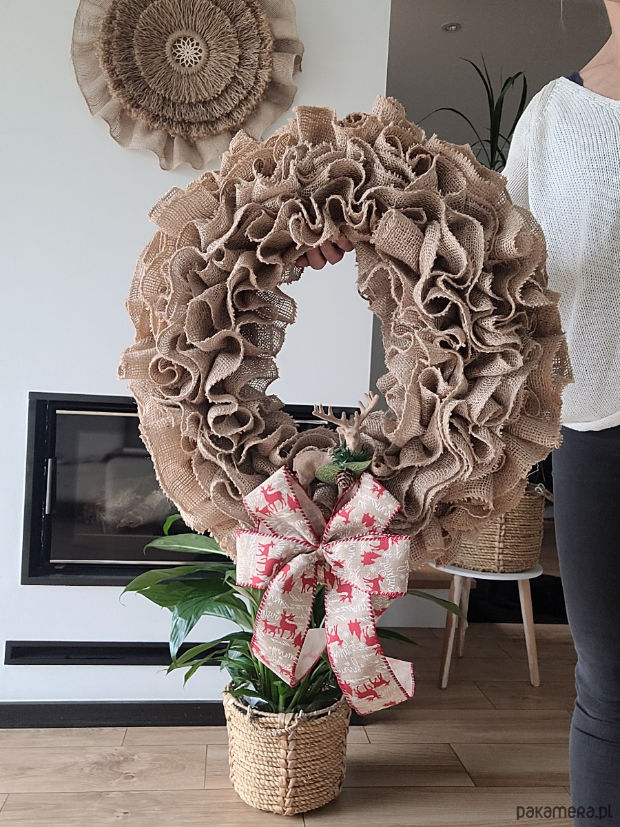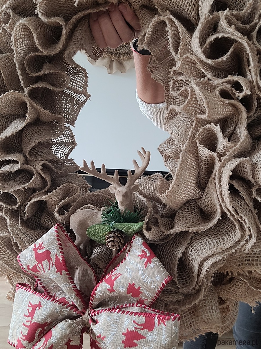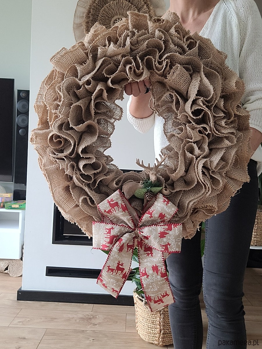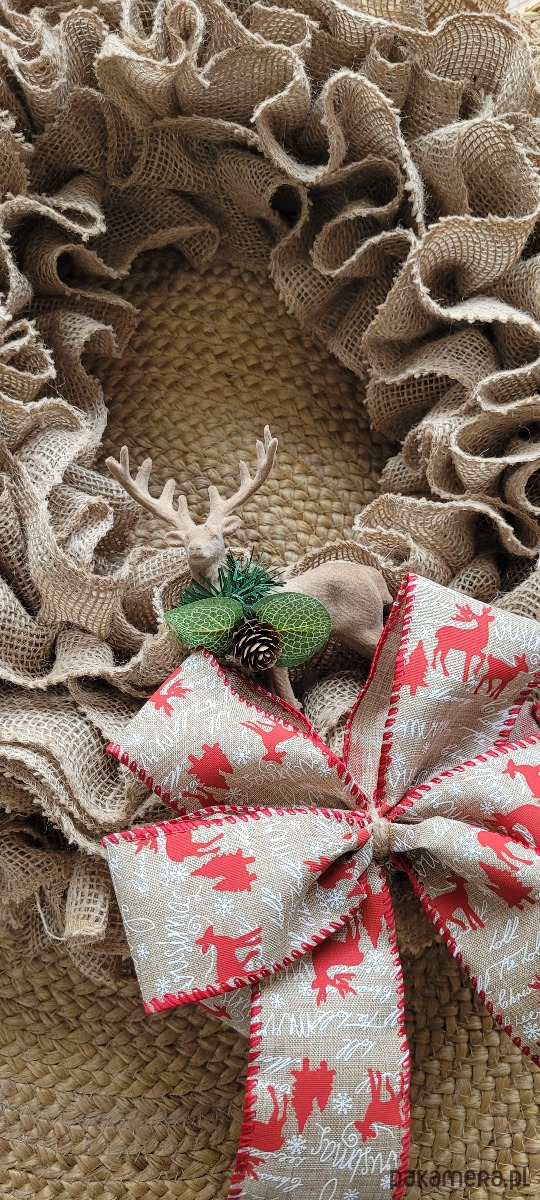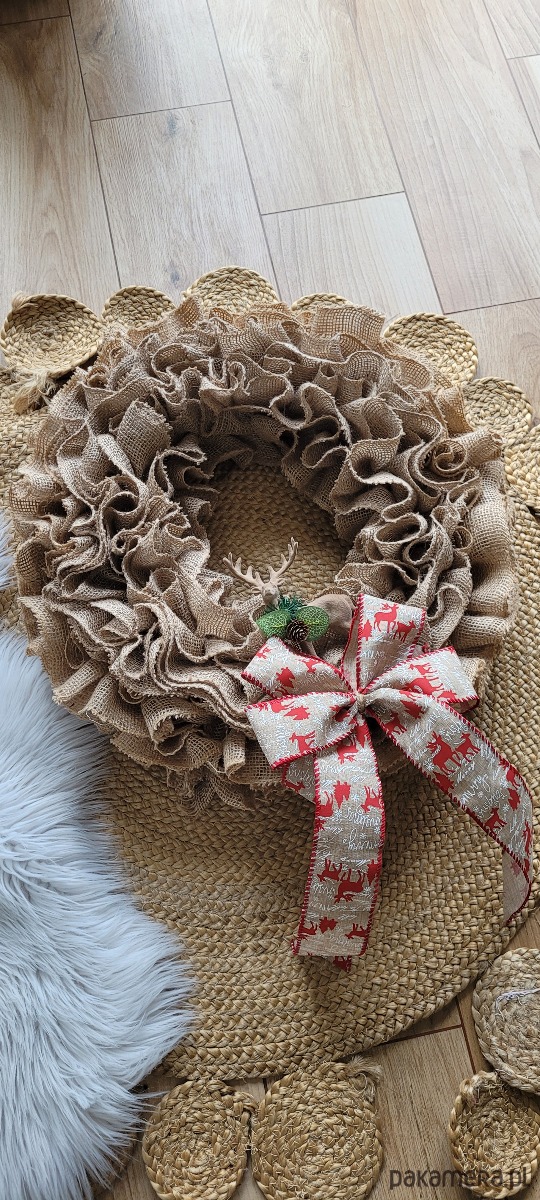 Zapraszam po wyjatkowy wianek wykonany z naturalnych materiałów- cudownej juty z dodatkiem świątecznej kokardy oraz renifera.
