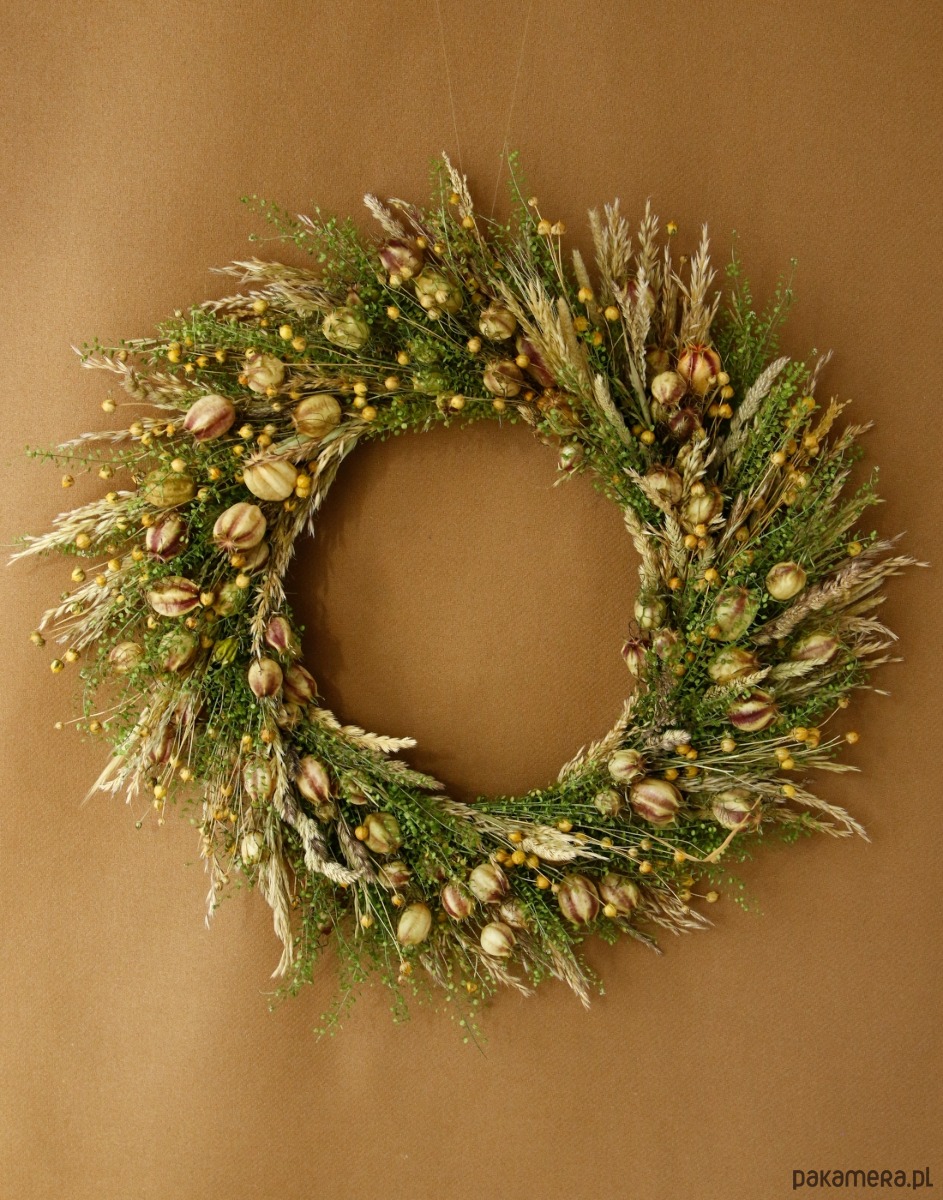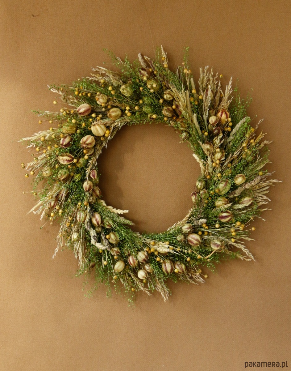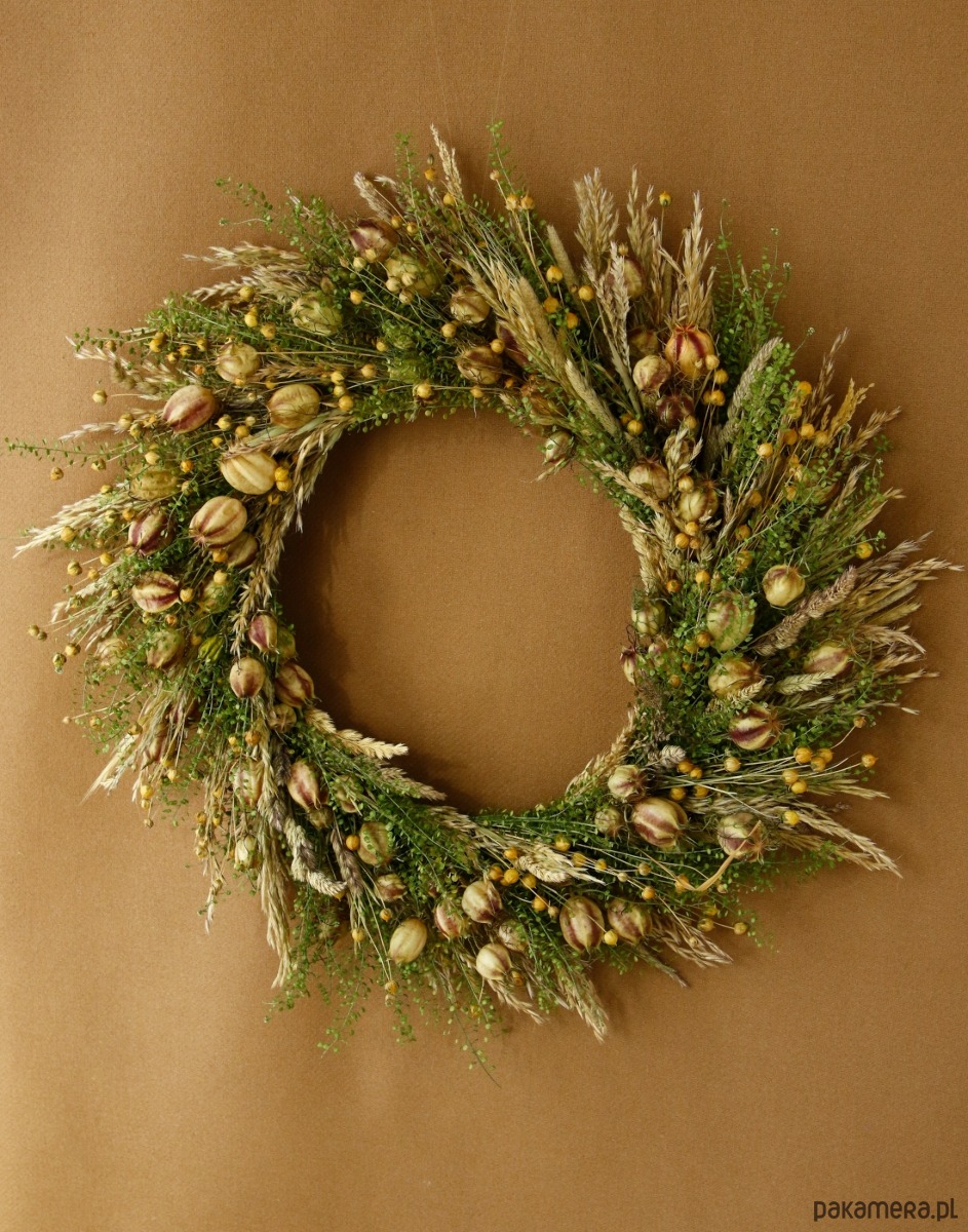 Wianek rustykalny z naturalnych suszonych roślin. Jest to trwała dekoracja na drzwi lub ścianę. Jego średnica to ok. 40cm.
