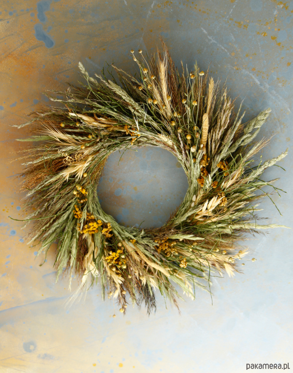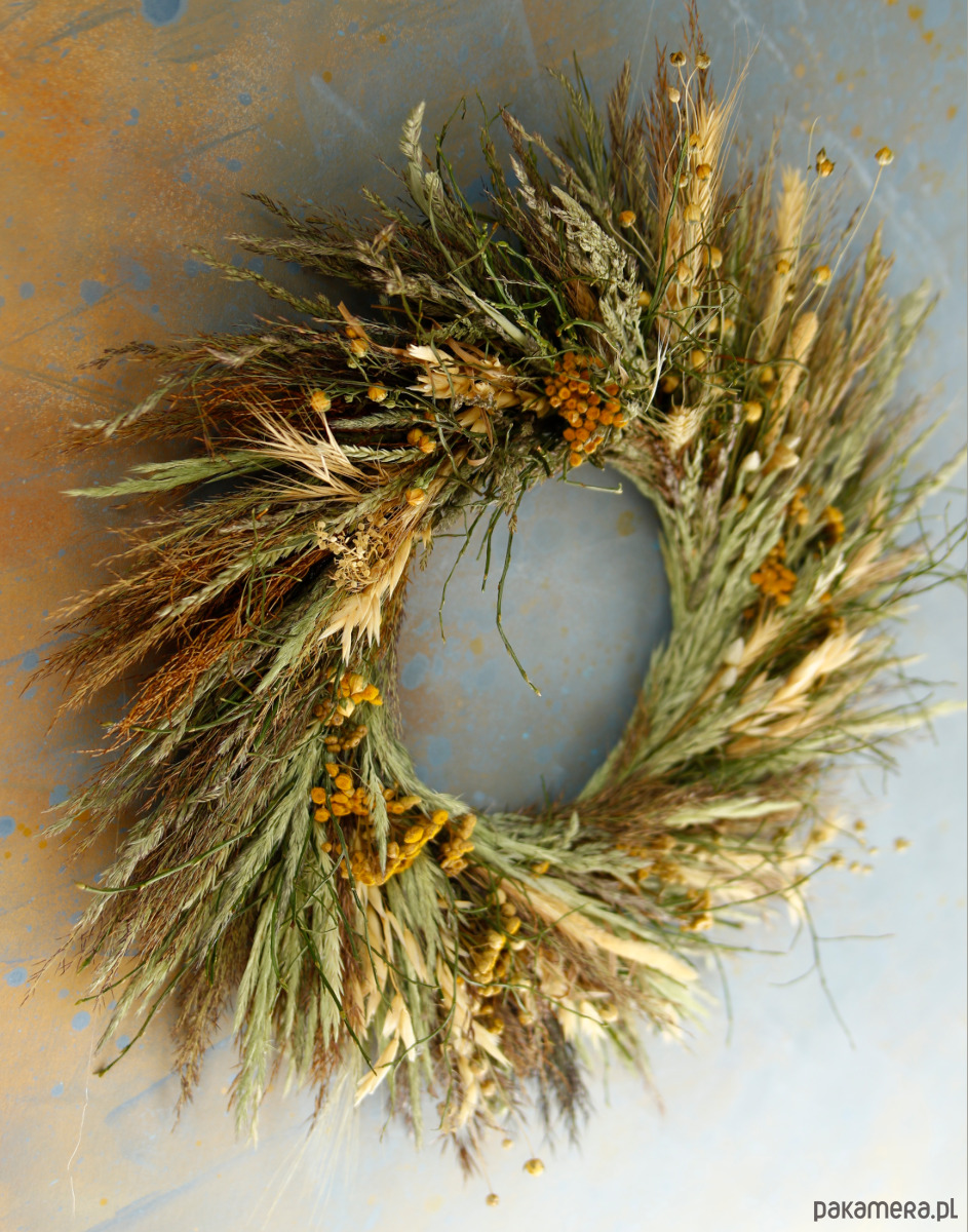 Wianek rustykalny z naturalnych suszonych roślin. Jest to trwałą dekoracja na drzwi lub ścianę. Jego średnica to ok. 40cm.