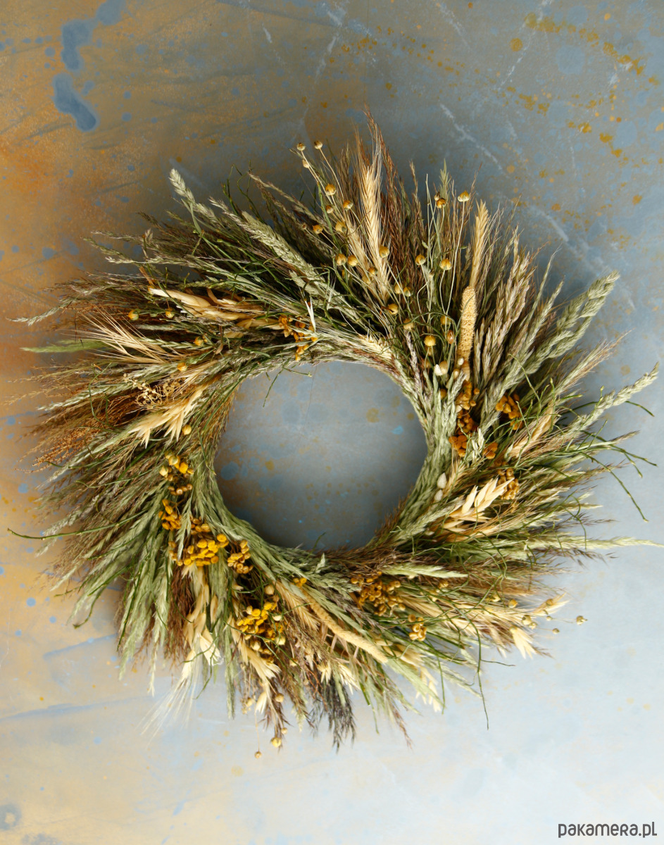 Jego kolorystyka jest naturalna, wianek uniwersalny, sprawdzi się w każdej porze roku, ale wspaniale pasuje do wiosennego klimatu- lekkie zielenie i żółte odcienie, a także subtelny klimat łąki. Ma nieco ekspresyjny, bardzo naturalny charakter, który wniesie do wnętrza przyjemną polną aurę.