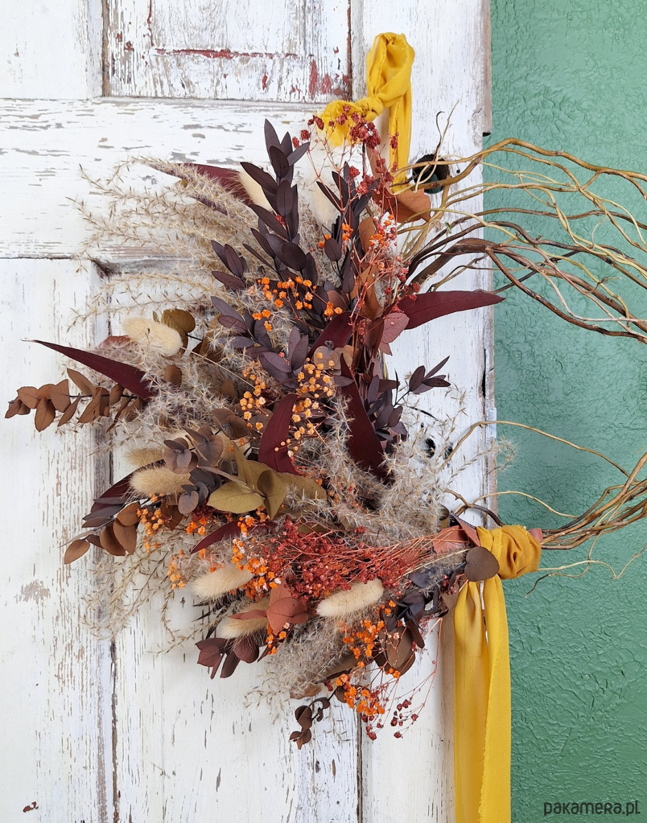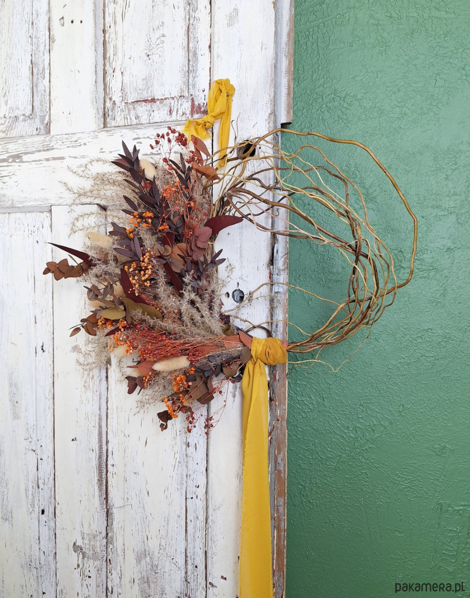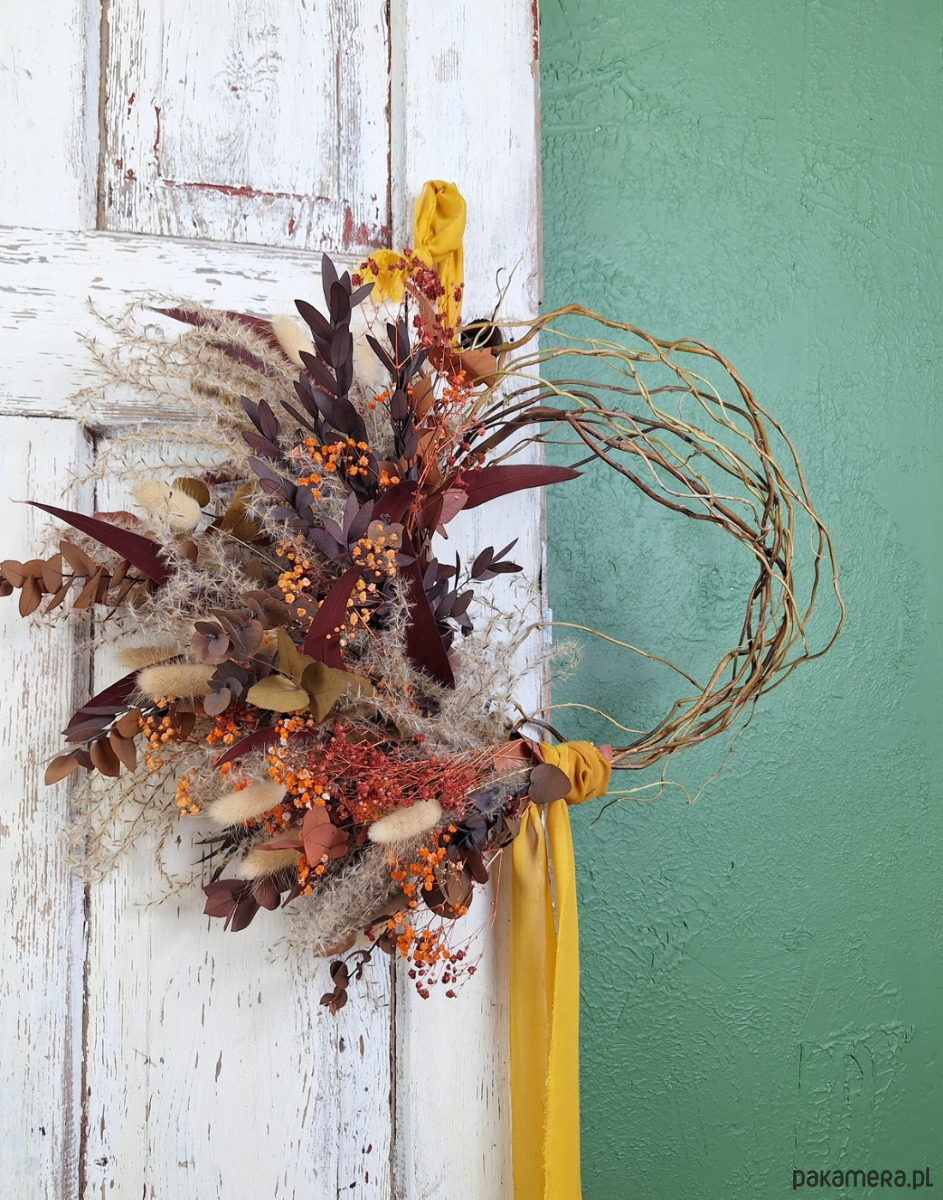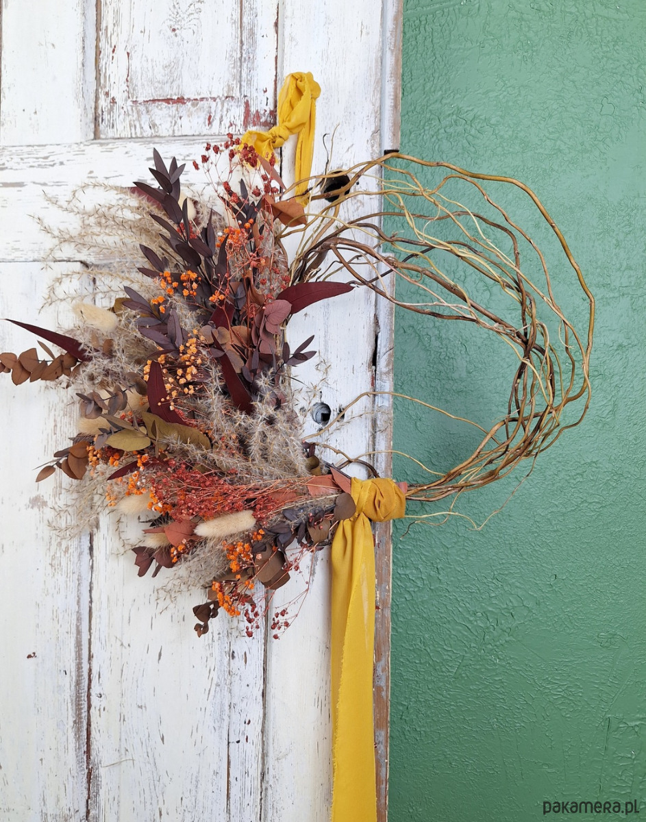 Podstawą kompozycji jest ręcznie pleciony wianek z wierzby mandżurskiej – surowy, naturalny, o nieregularnym splocie, który przypomina gałęzie tańczące na wietrze. Na nim rozkwita historia barw ziemi.