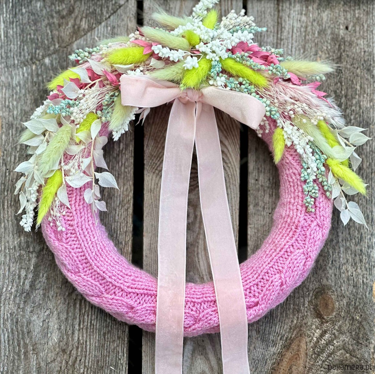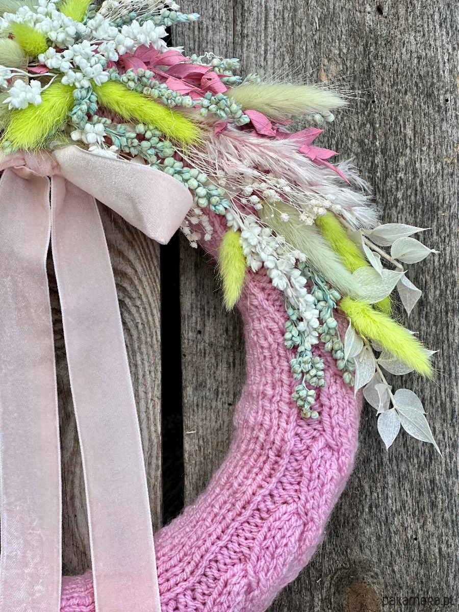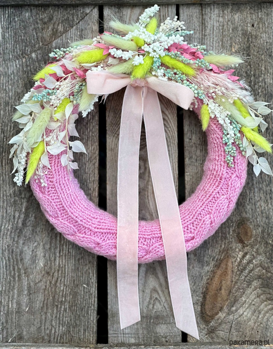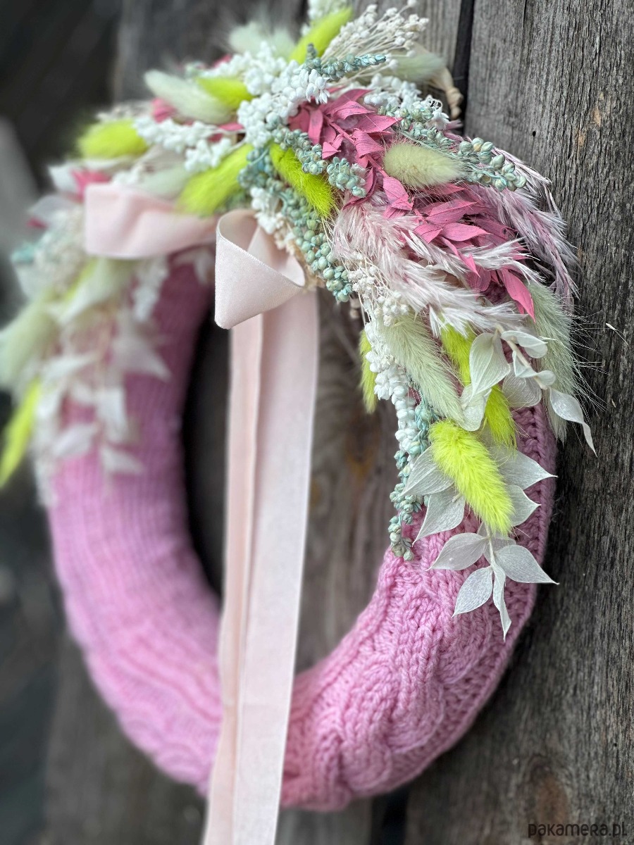 Wianek w ręcznie robionym, uroczym różowym sweterku z włóczki, ozdobiony naturalnymi, suszonymi kwiatami.