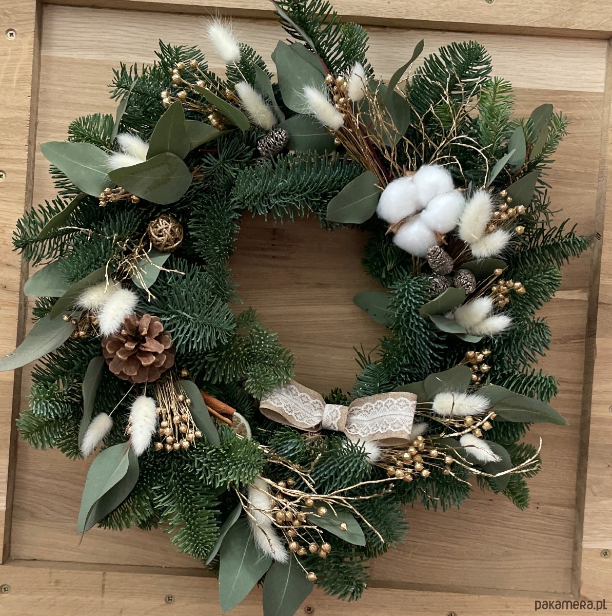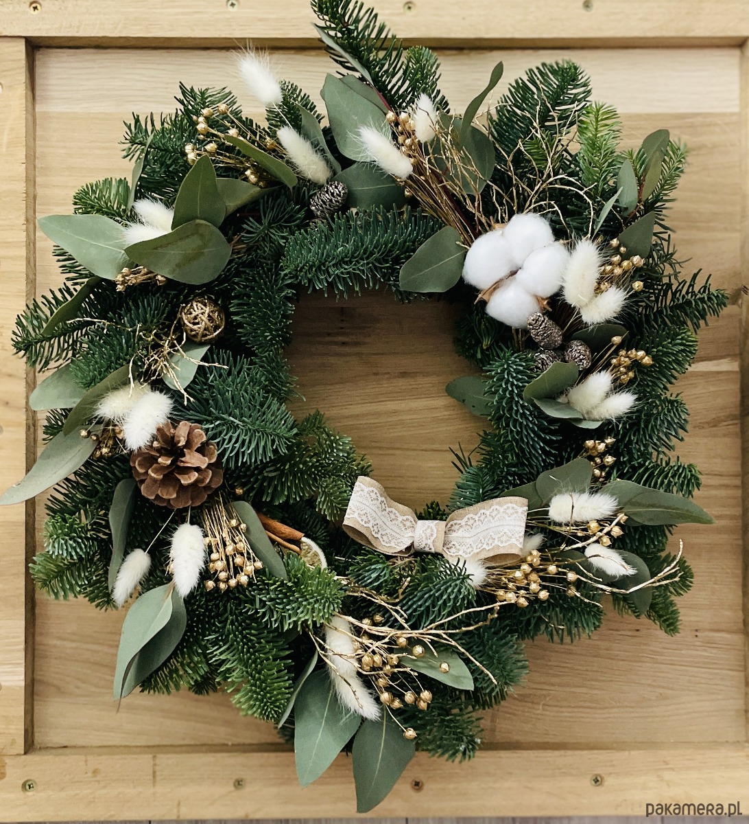 Wianek naturalny z jodły nobilis, której igły nie sypią się a gałązki pięknie zasychają dopiero po około 6 tygodniach. Uniwersalny na drzwi bądź wraz ze świeczkami jako stroik świąteczny. Oprócz jodły również liście eukaliptusa, suszony dmuszek oraz len, szyszki pini, bawełna. Całość wieńczy koronkową kokarda. Podstawę stanowi obręcz ze słomy o średnicy 35 cm. Całkowita średnica nie przekracza 45 cm. Możliwość zapakowania na prezent.