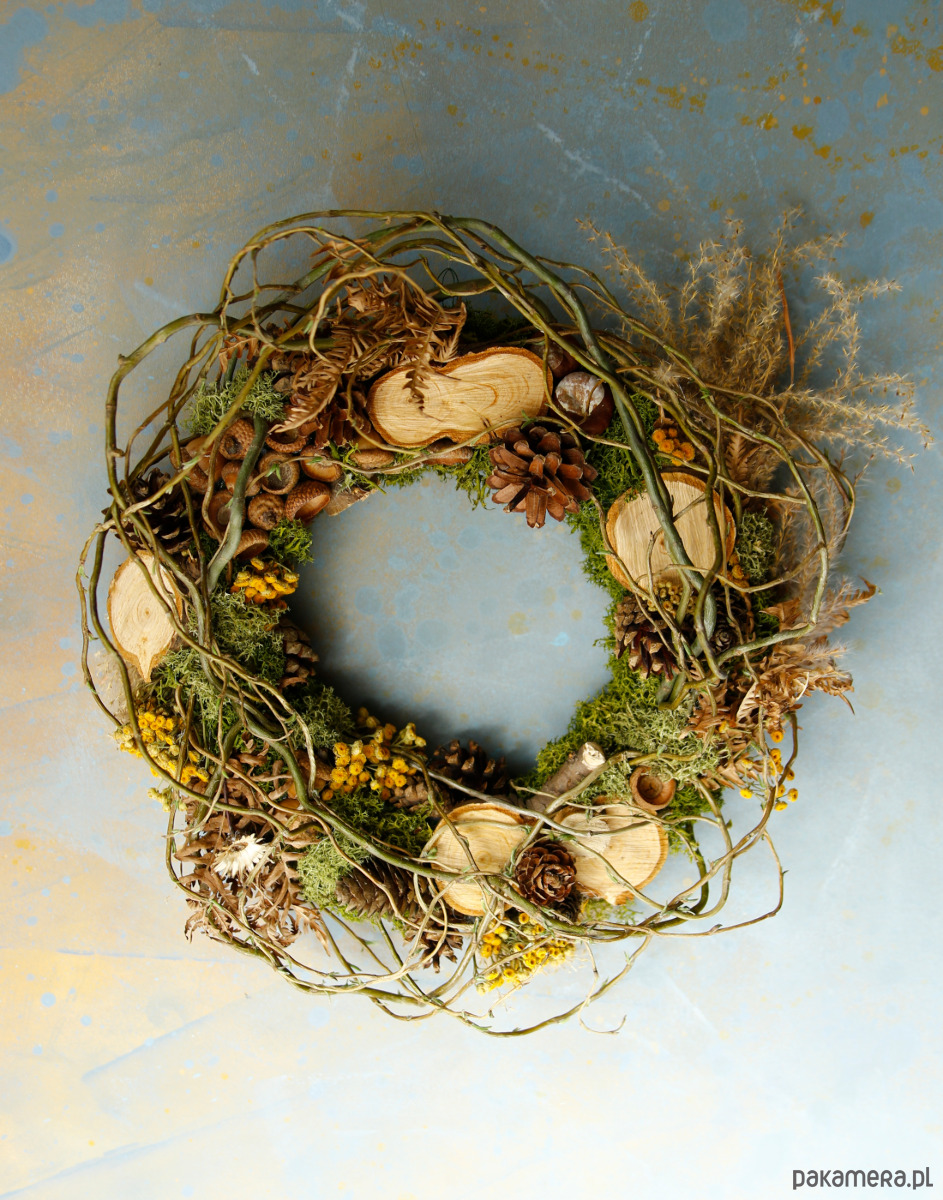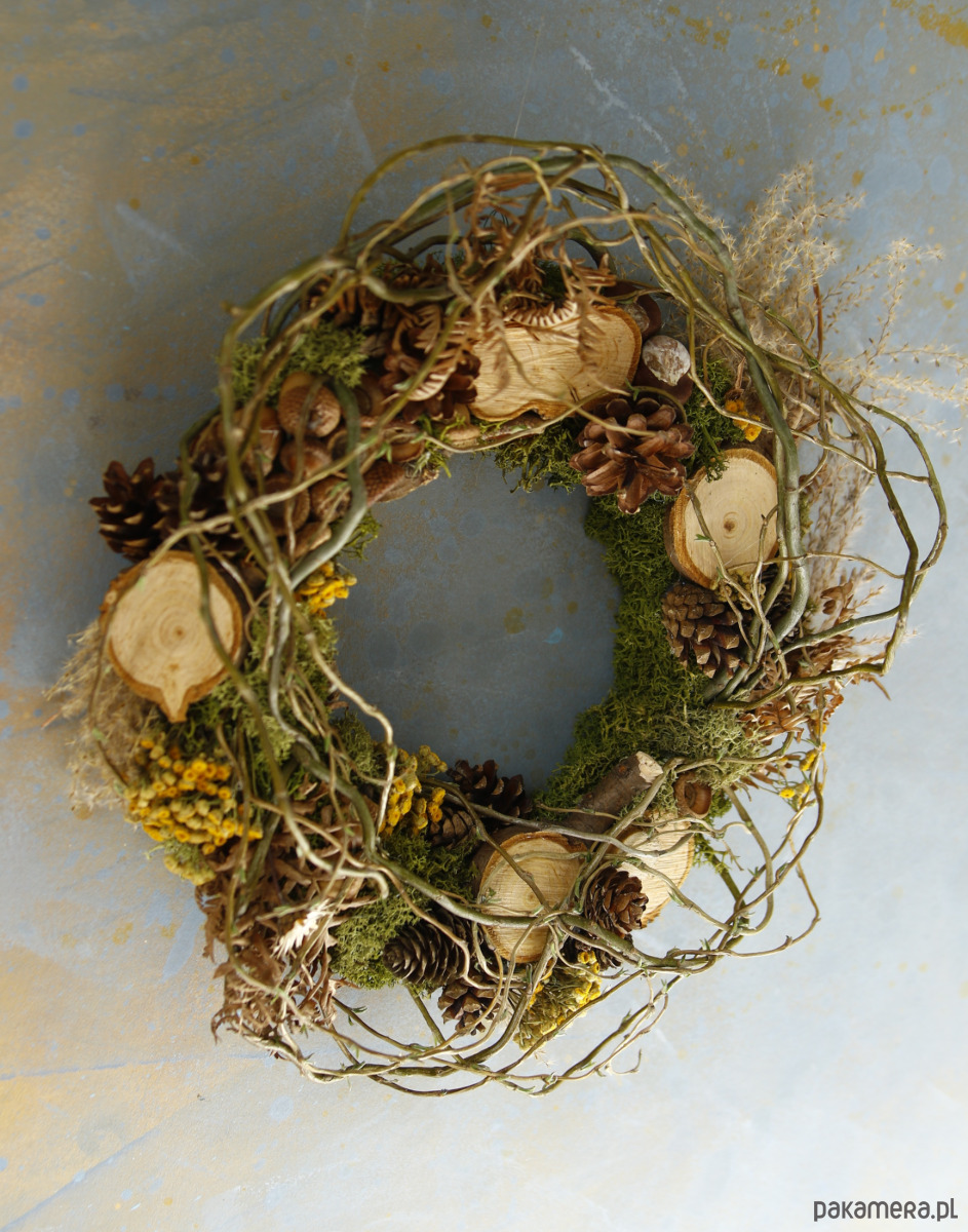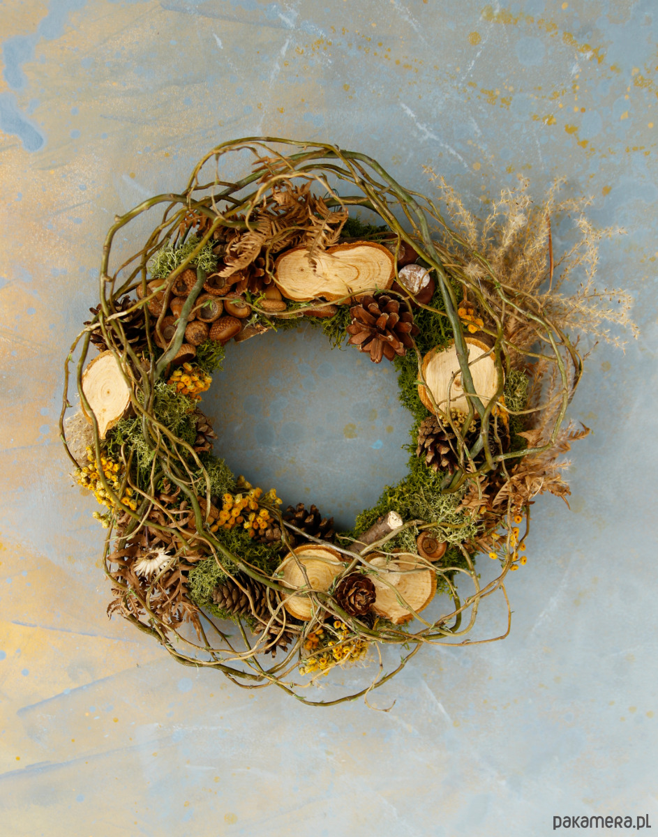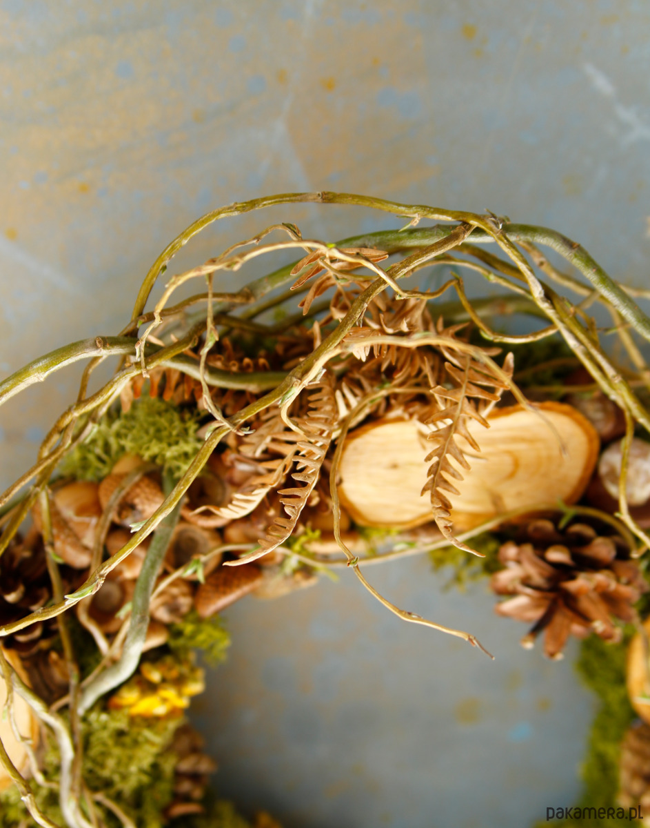Wianek dekoracyjny z naturalnym stabilizowanym mchem i gałązkami. Zawiera naturalne dodatki jak plastry drewna, szyszki, żołędzie, wrotycz, suszoną paproć, miskant.