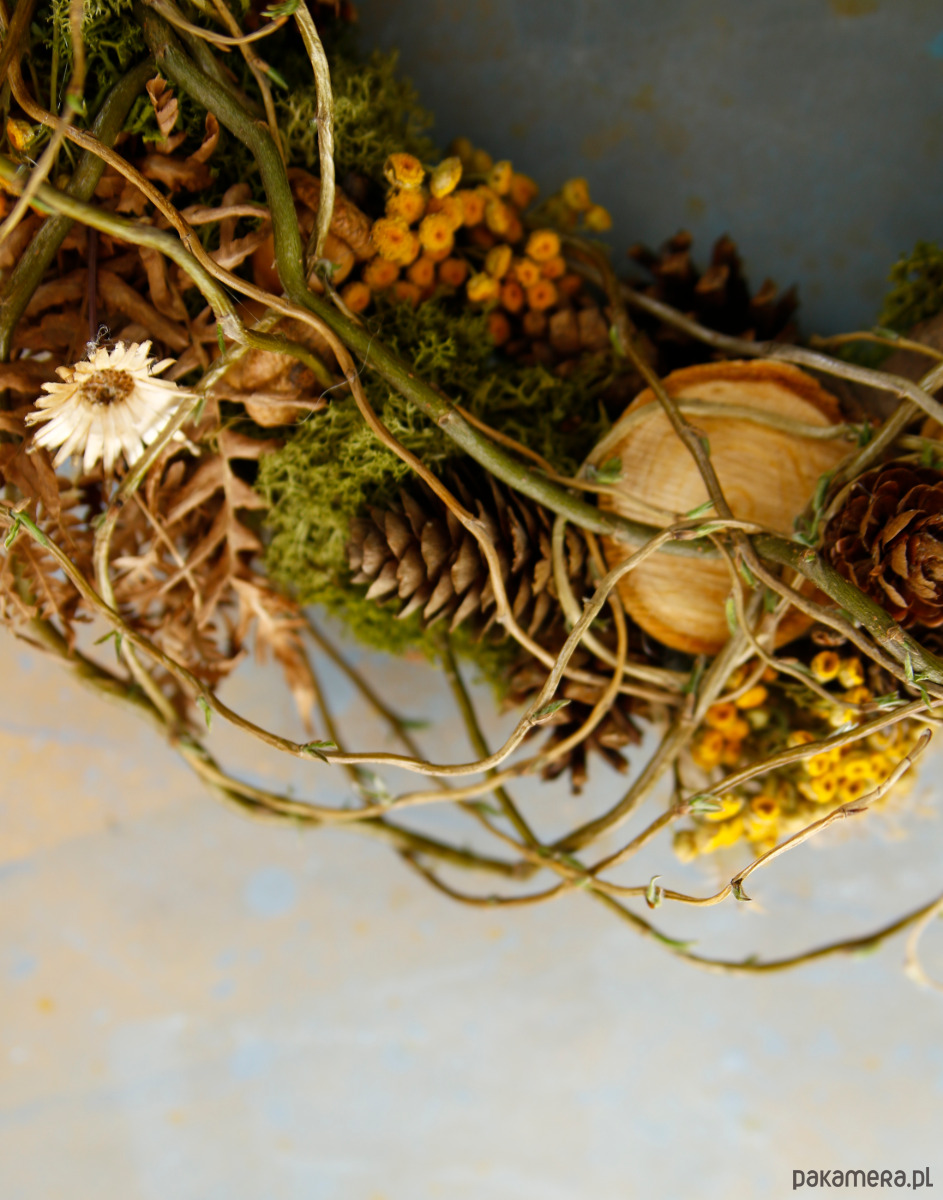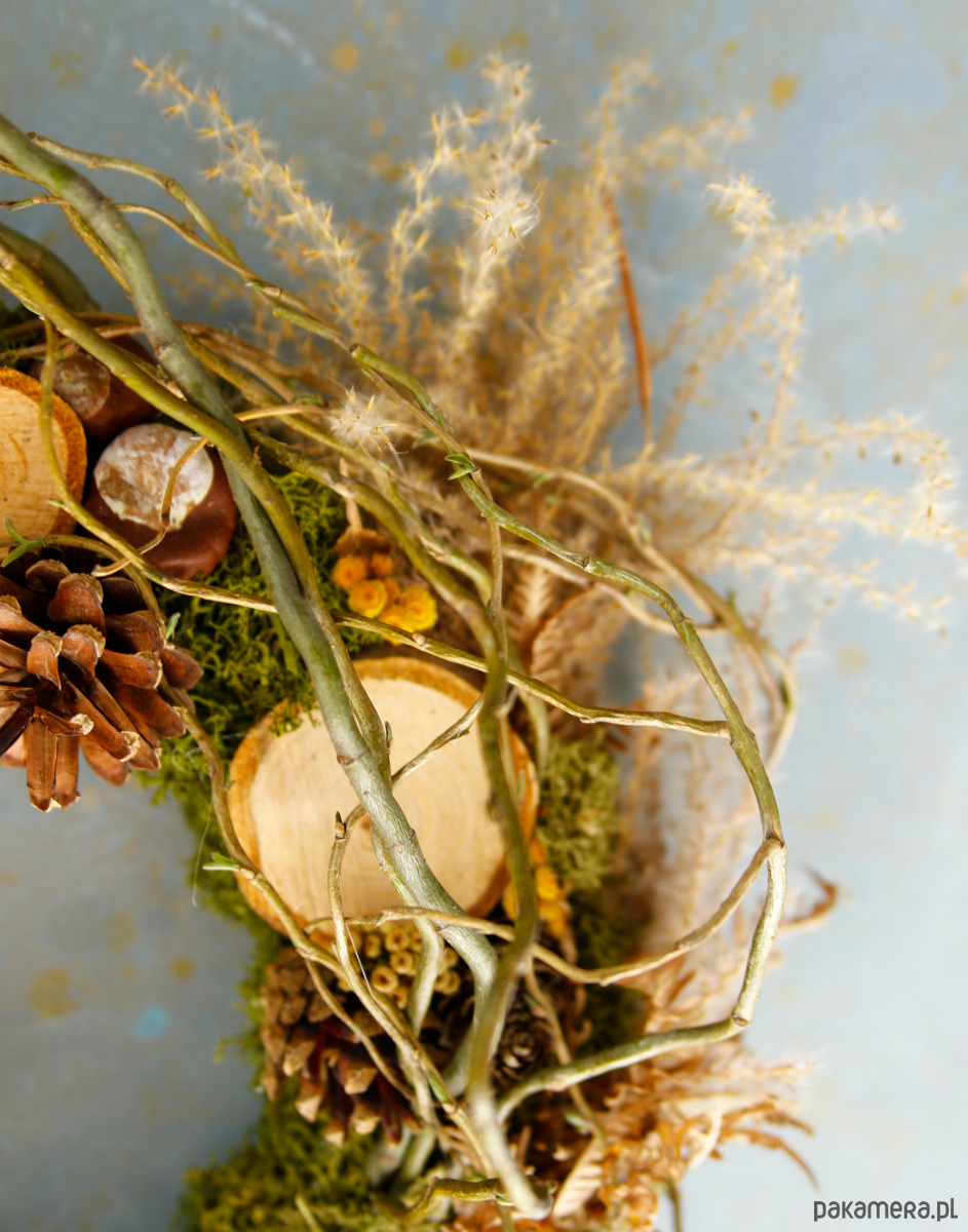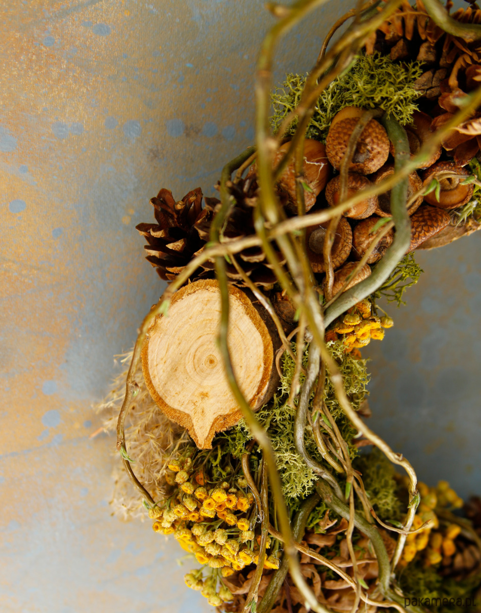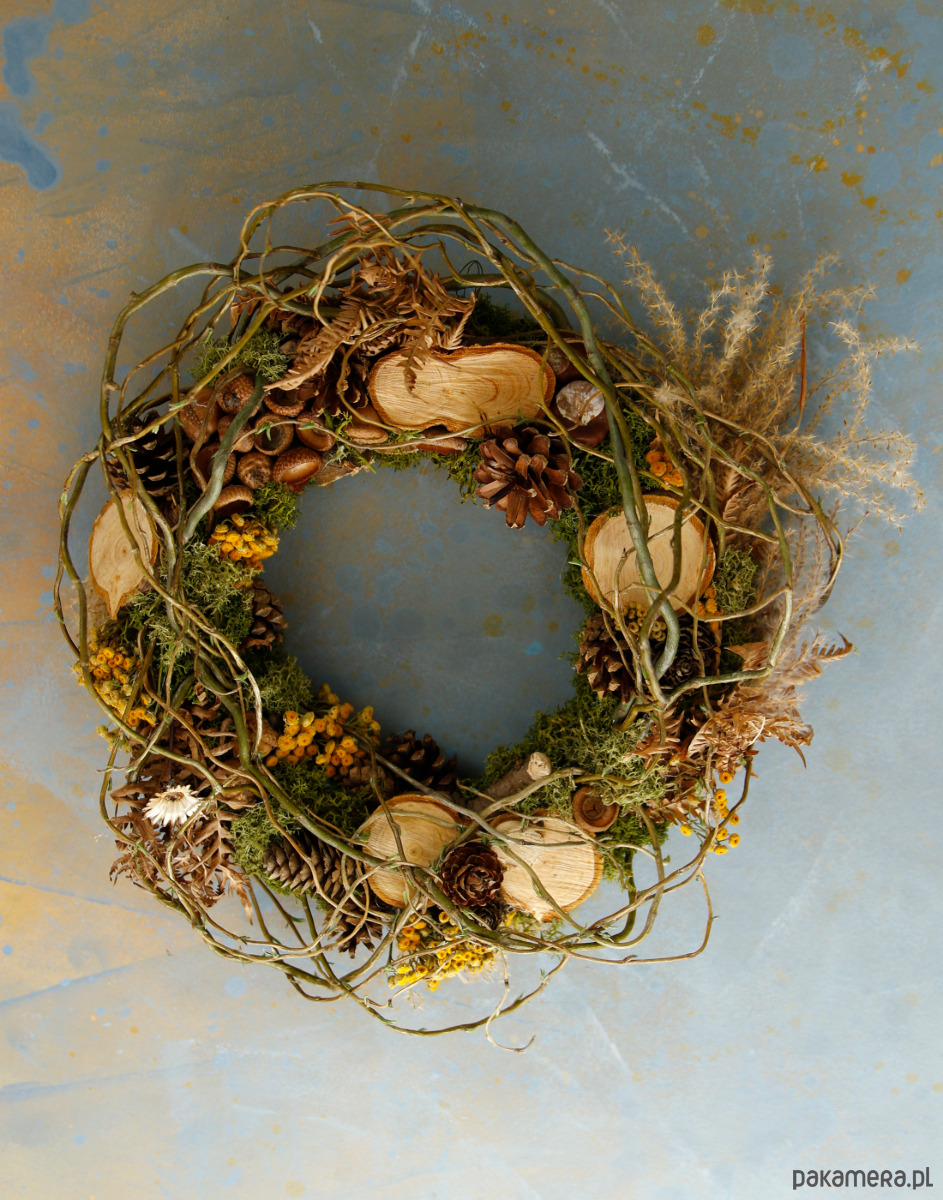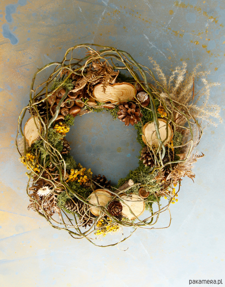 Wianek dekoracyjny z naturalnym stabilizowanym mchem i gałązkami. Zawiera naturalne dodatki jak plastry drewna, szyszki, żołędzie, wrotycz, suszoną paproć, miskant.
