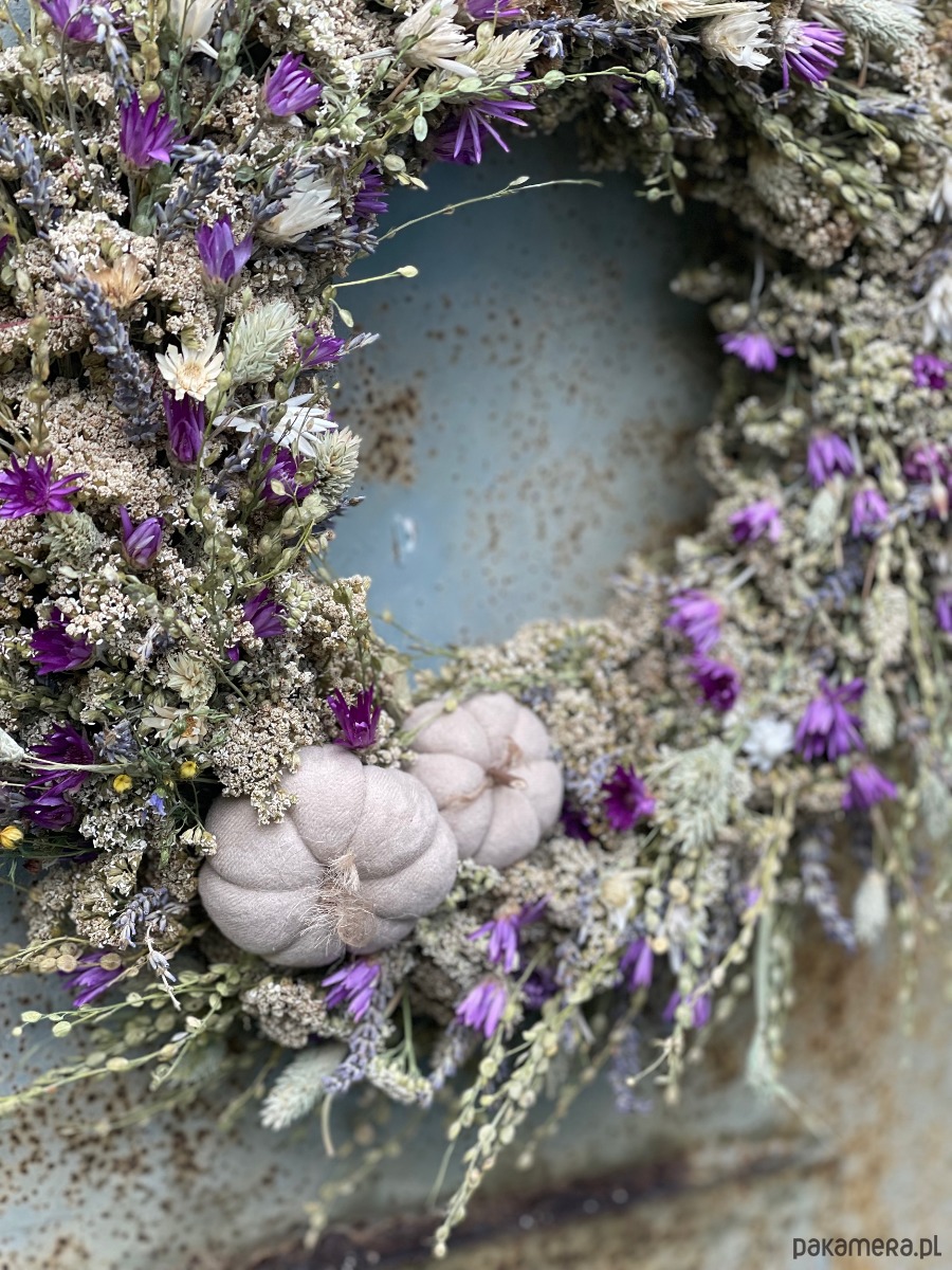 Ręcznie wykonany wianek z suszu. Urocza mieszanka pachnącej lawendy, krwawnika, traw i kwiatów (wianek pachnie cudownie!). Wianek w naturalnych kolorach, niebarwiony. Średnica wianka od strony zewnętrznej to 45 cm. Wianek udekorowany jest ręcznie wykonani dyniami przez co kompozycja przypominam nam już o jesieni :)