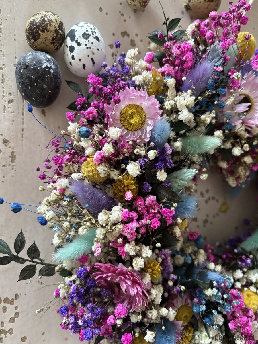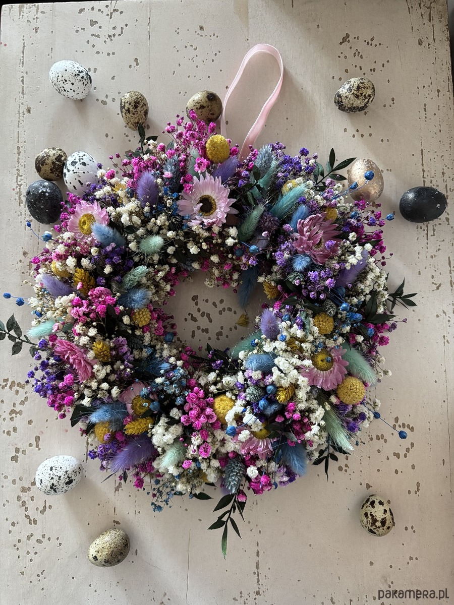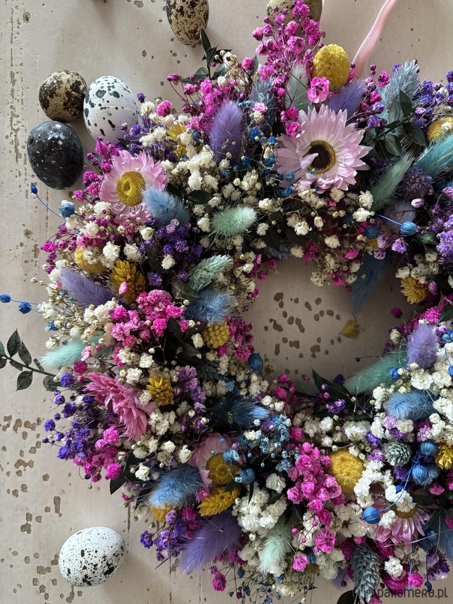 Naturalny wiosenny wianek wypleciony ze stabilizowanej kolorowej gipsówki.