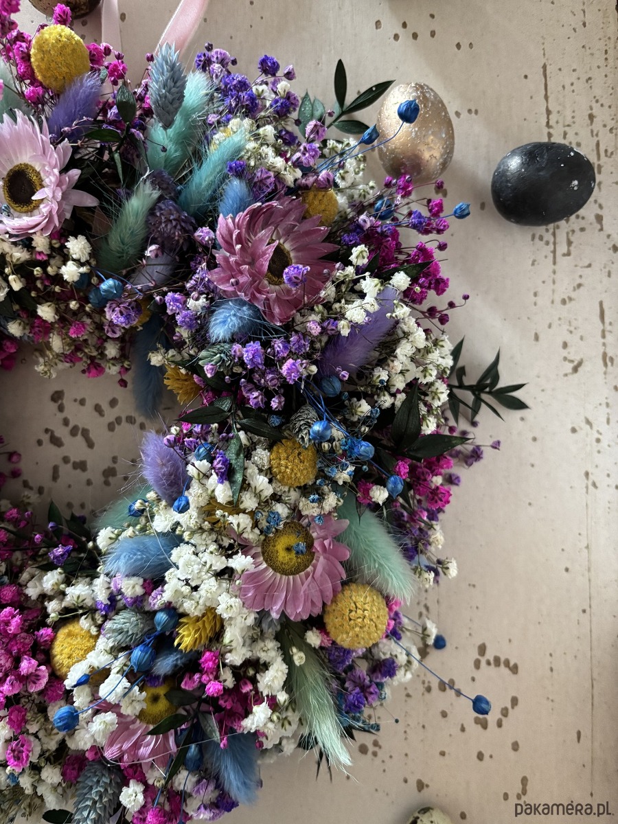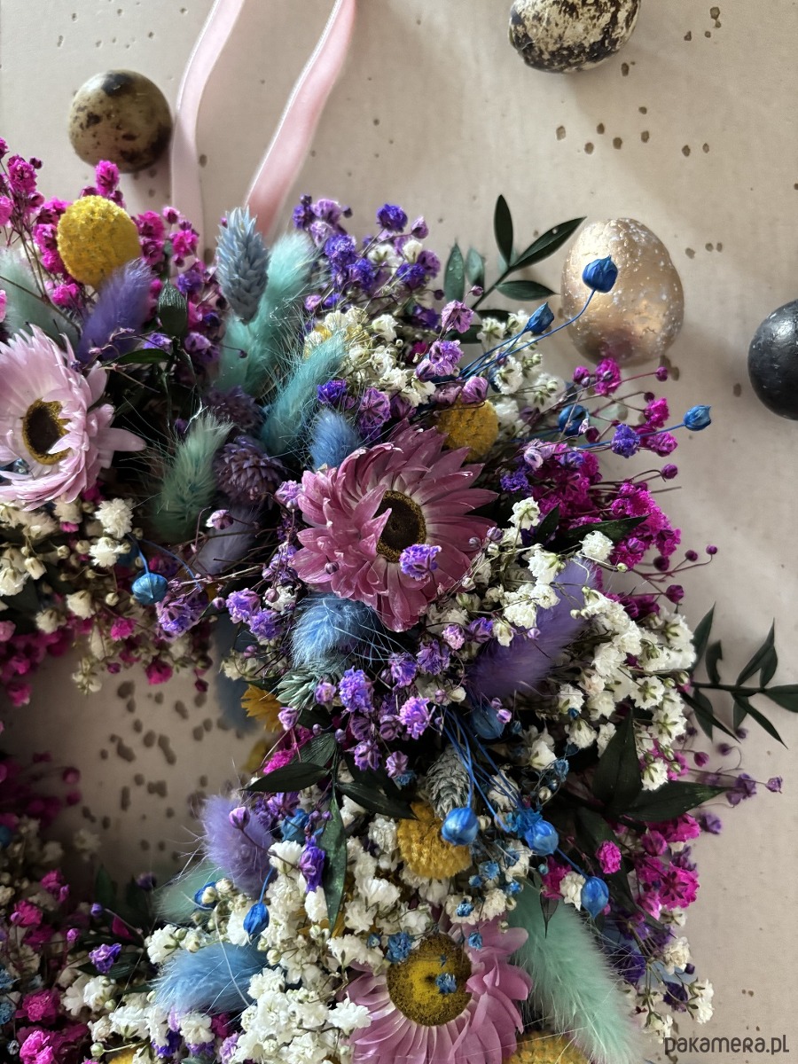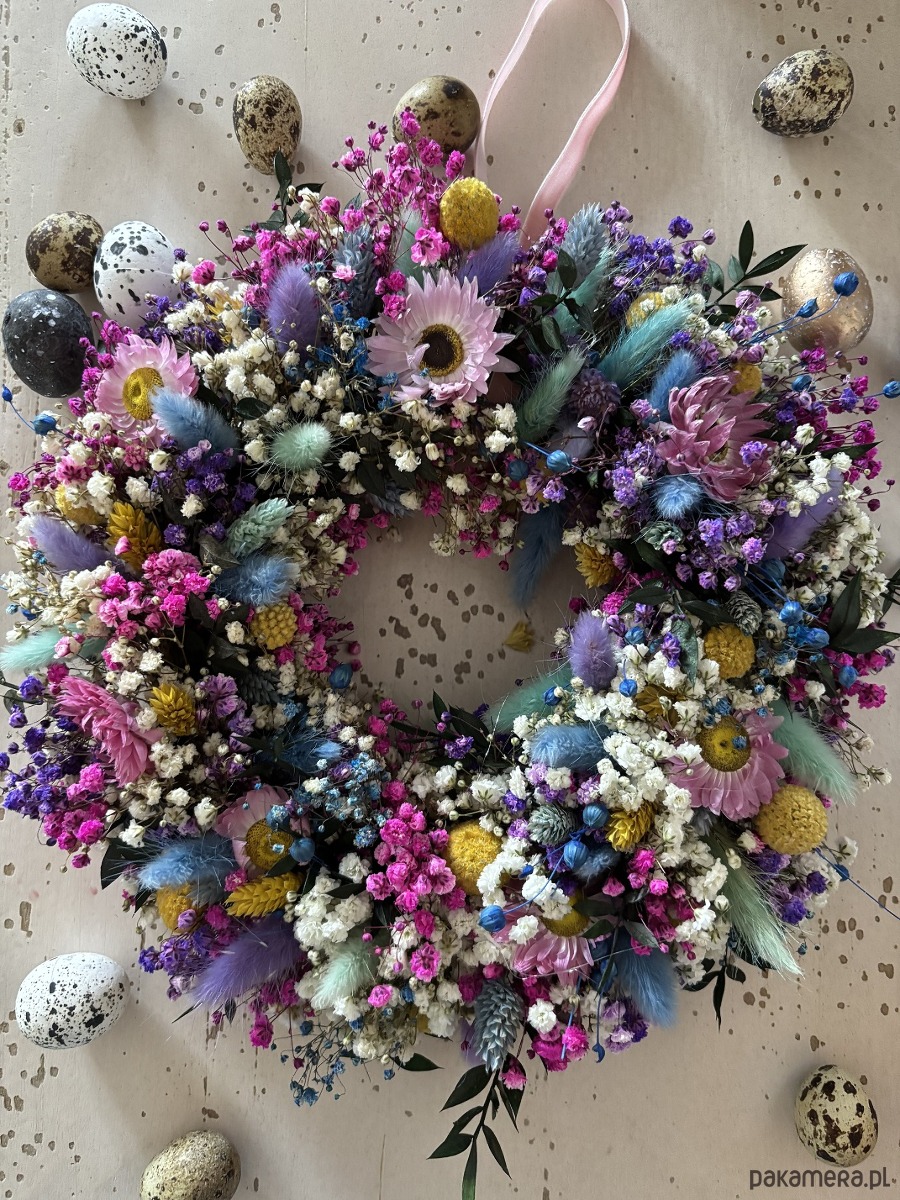 Naturalny wiosenny wianek wypleciony ze stabilizowanej kolorowej gipsówki.