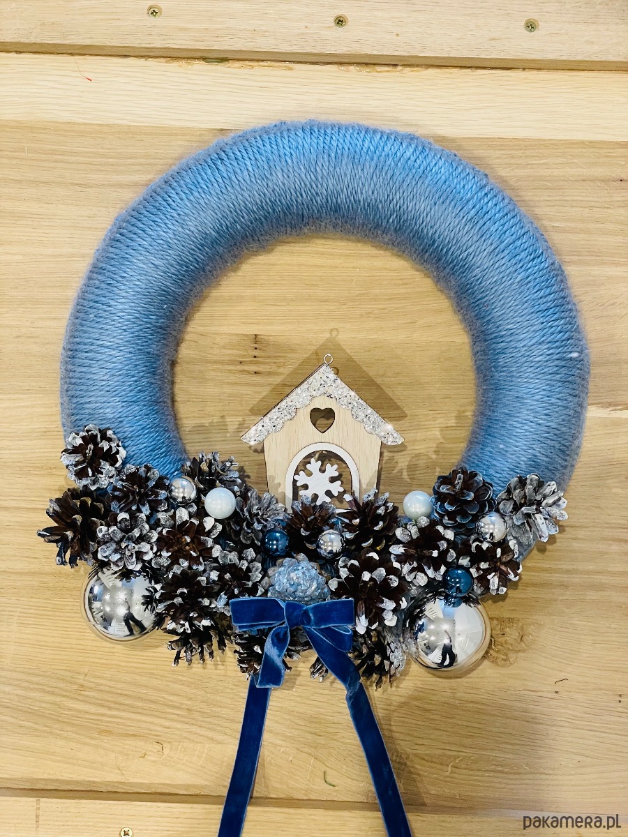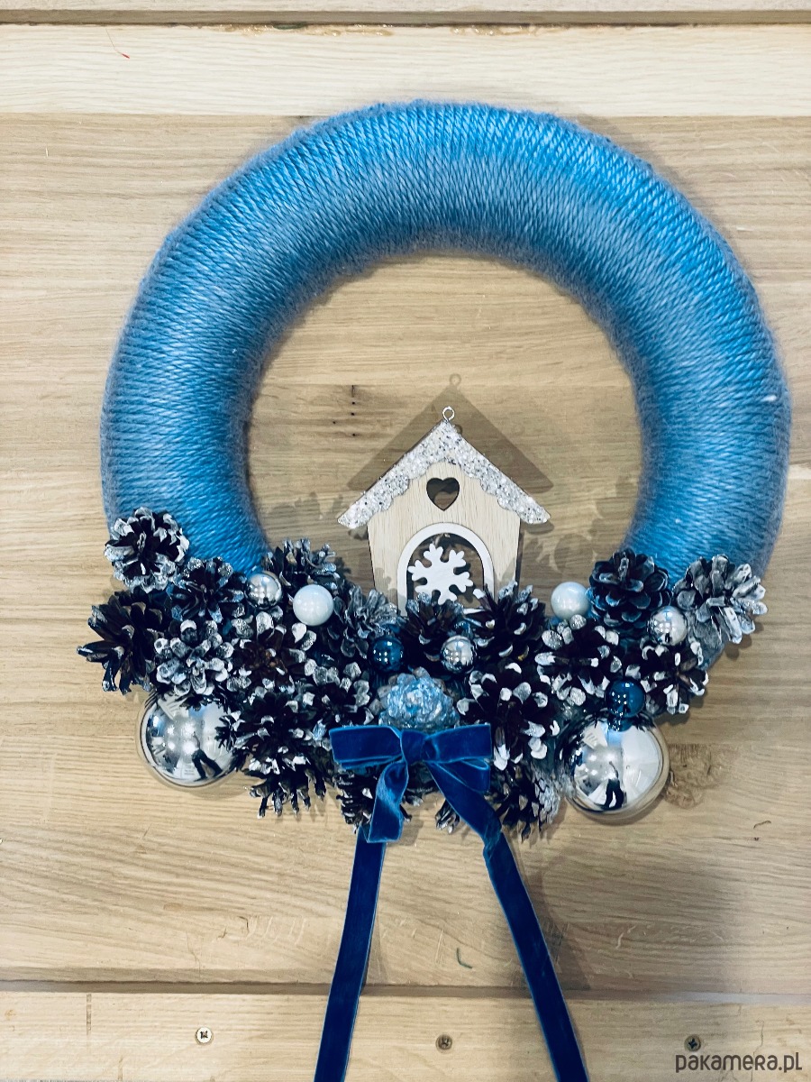 Nowoczesny wianek z błękitnej włóczki na obręczy styropianowej. Wykonany przy użyciu szydełka . Ozdobę stanowi aksamitna kokarda, malowane ręcznie szyszki sosnowe oraz szklane i plastikowe bombki. Średnica wianka to 35 cm ( +/- 2 cm).