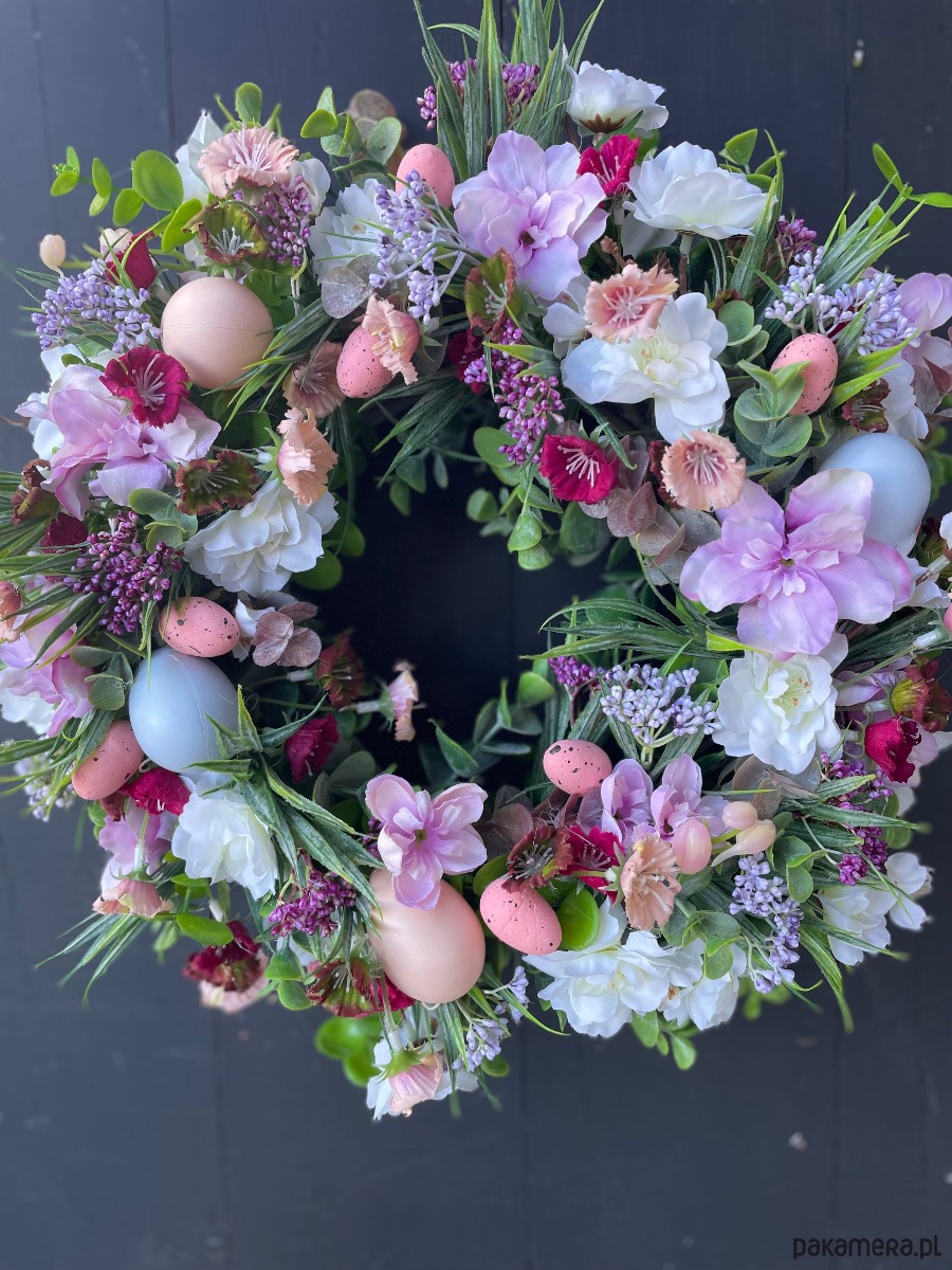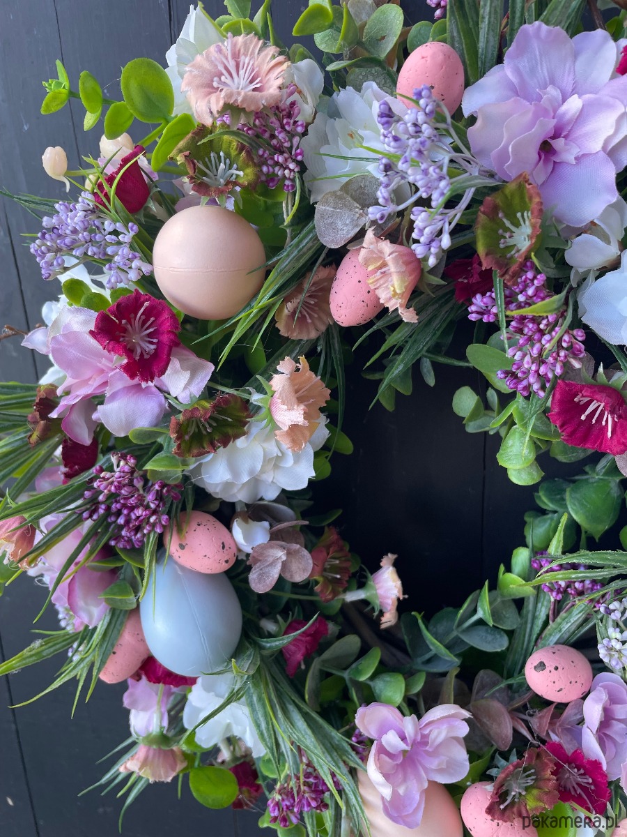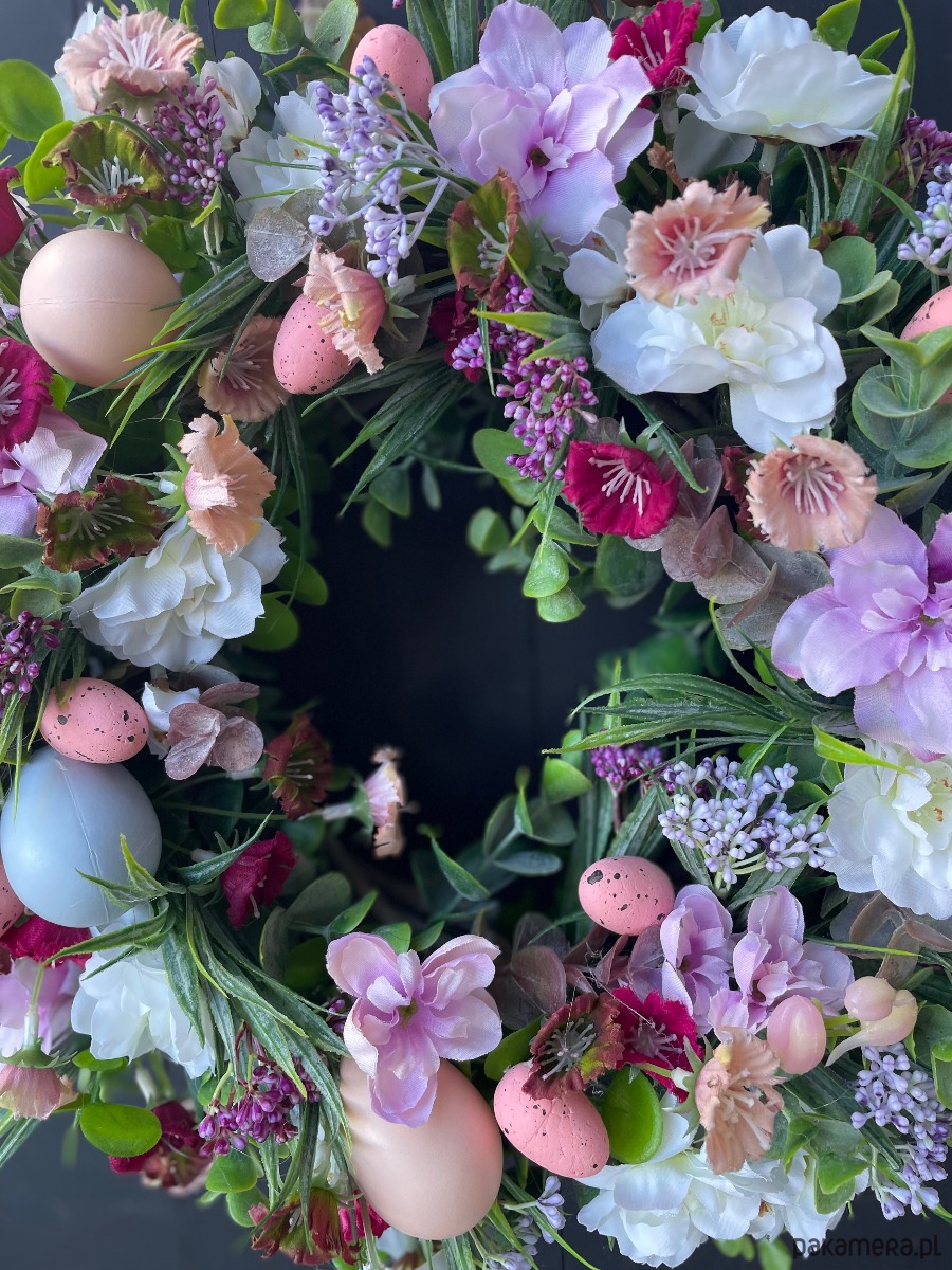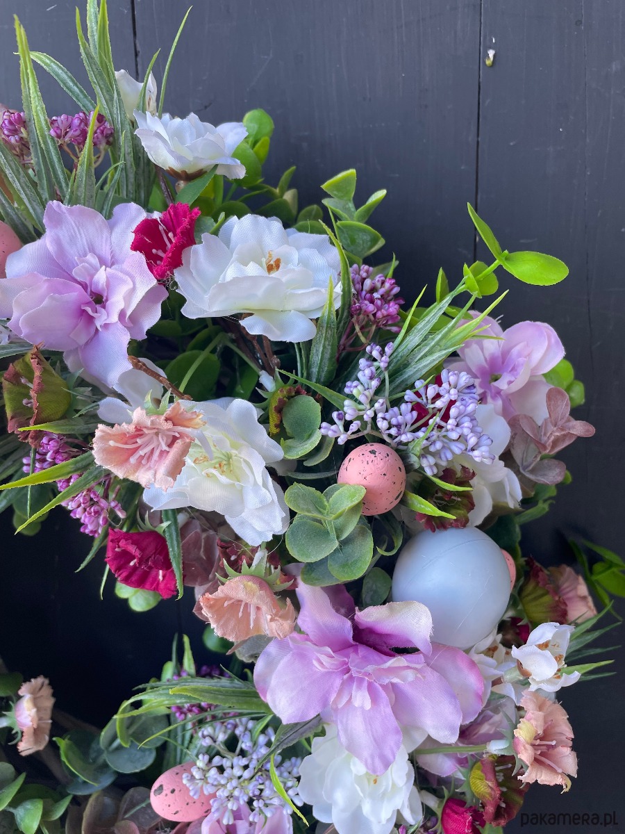 Piękny wiosenno-wielkanocny wianek wykonany w całości ze sztucznych elementów na podstawie z rattanu. Wysokiej jakości kwiaty sprawiają, że cała kompozycja wygląda bardzo naturalnie. Dominujące kolory to niebieski i różowy. Wianek będzie świetnym uzupełnieniem wielkanocnych dekoracji , będzie świetnie służył jako wiosenno-letnia ozdoba drzwi, kominka czy ściany. Średnica ok 35 cm.