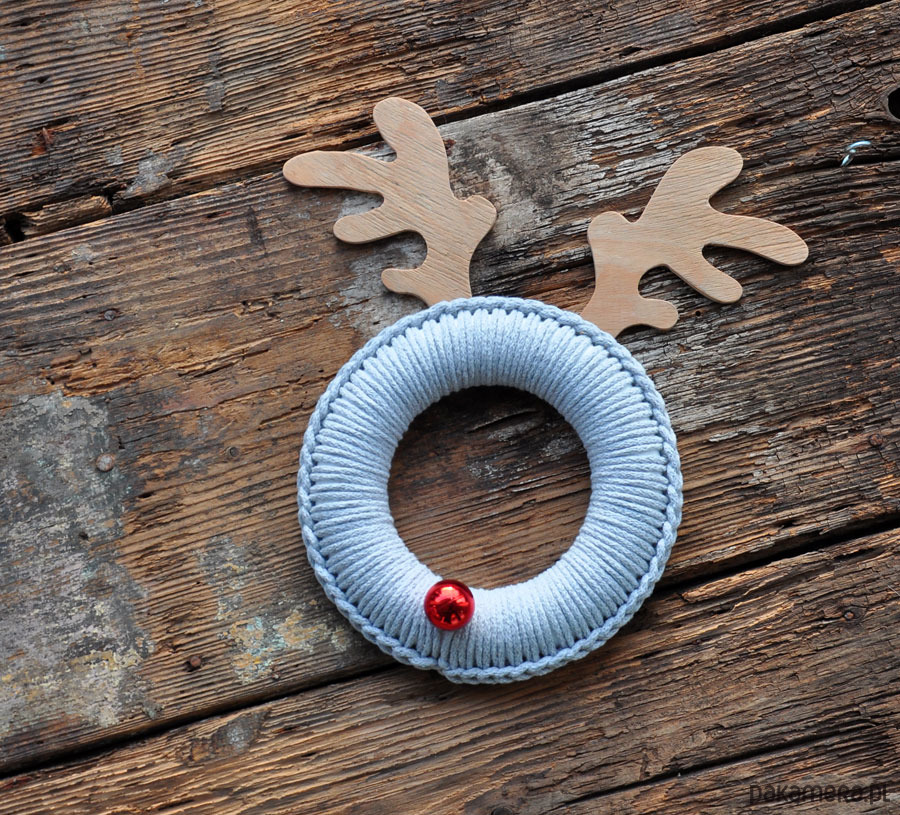 Wianek świąteczny Renifer Rudolf; wykonany z bawełnianego sznurka w kolorze szarym; rogi ręcznie wycinane ze sklejki; czerwony nosek ; średnica 24cm + rogi dł.15cm; wianek jest przystosowany do powieszenia; zapraszam serdecznie