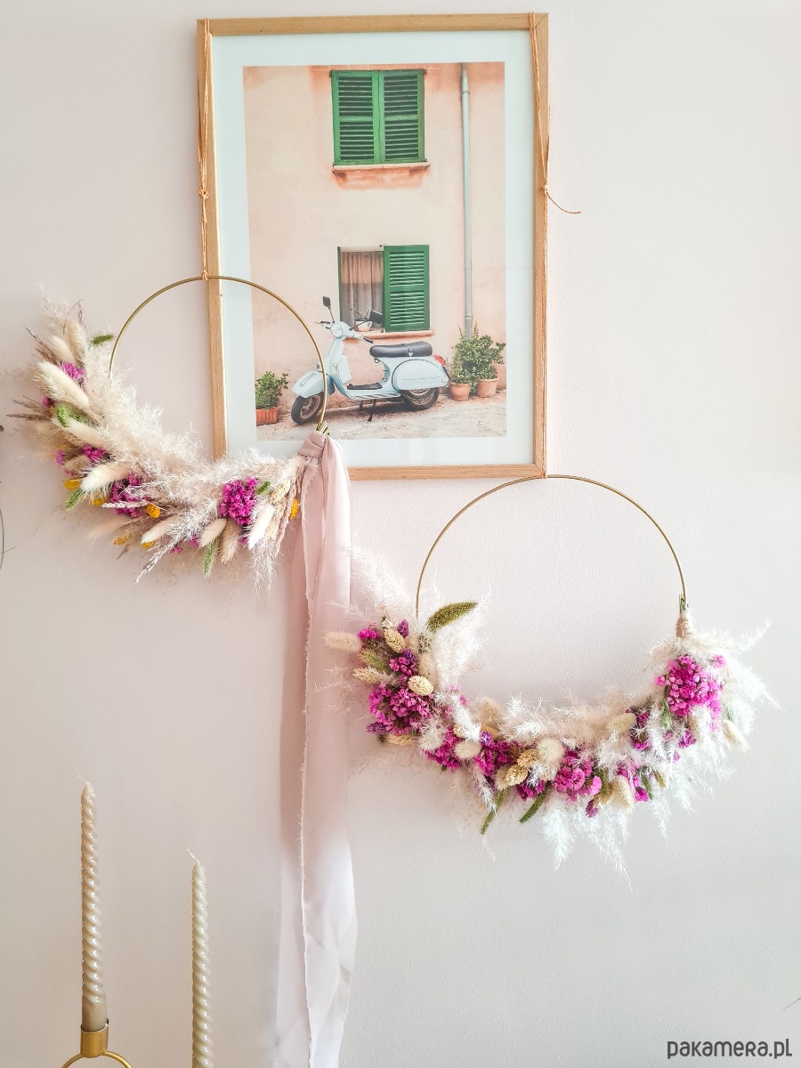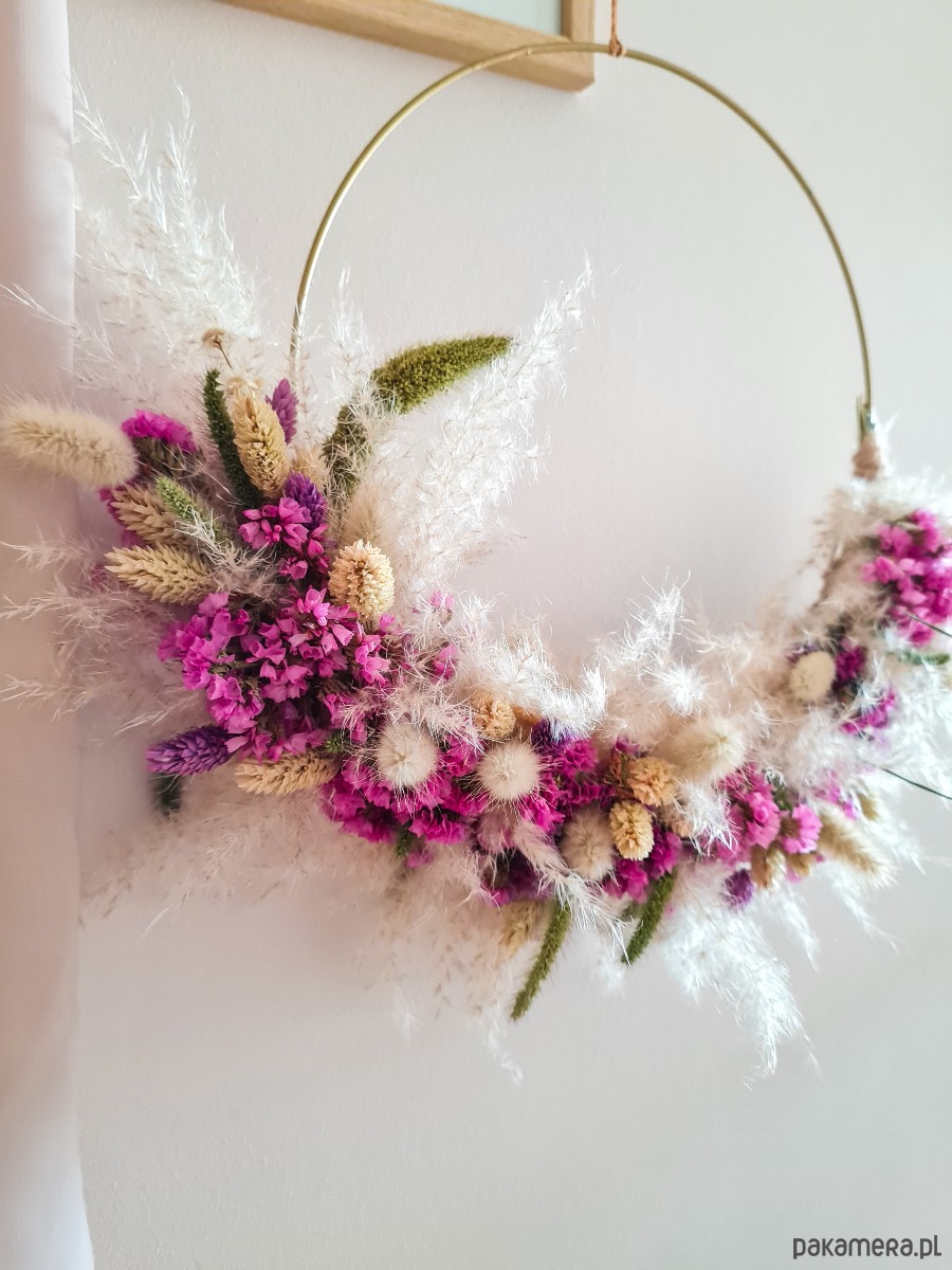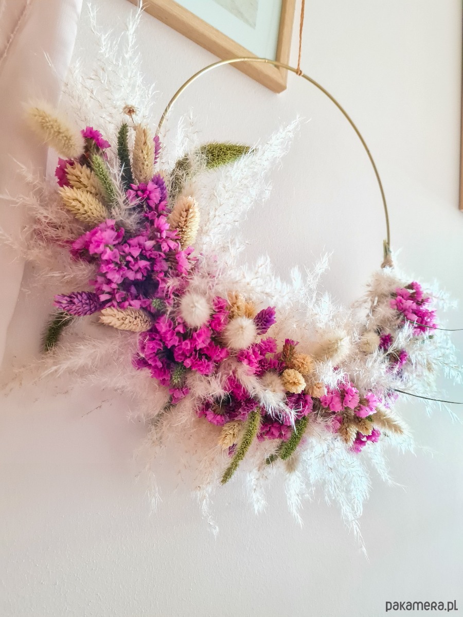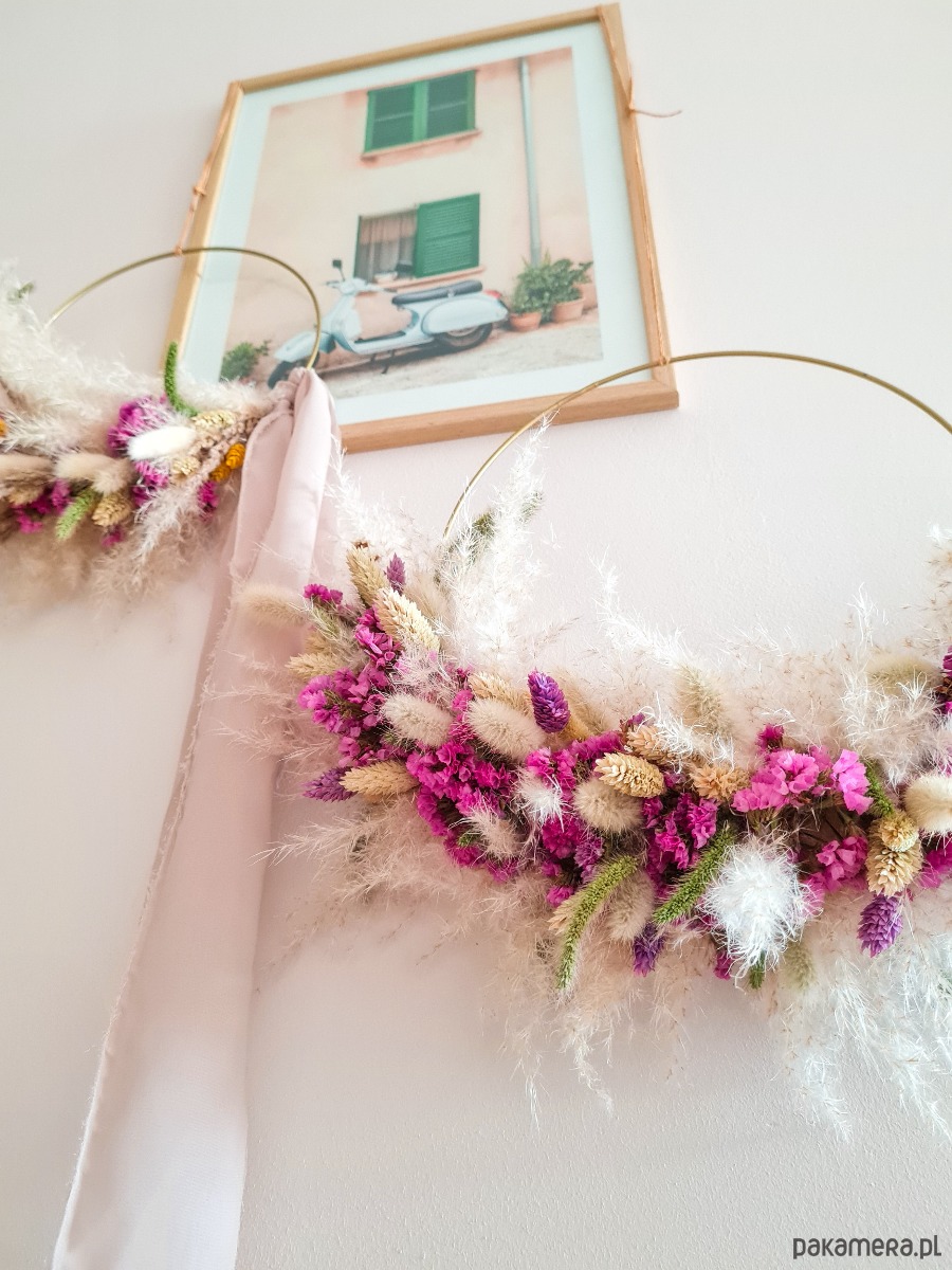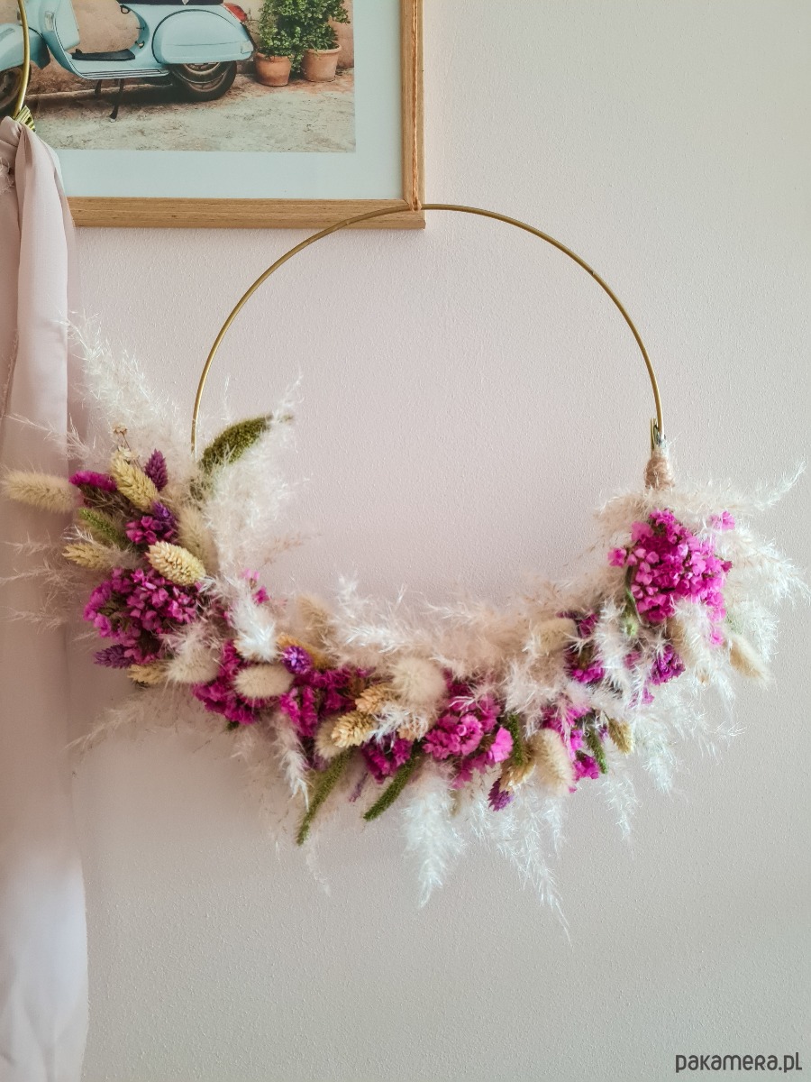 Material: metalowa obręcz, suszone trawy i kwiaty, naturalny sznurek jutowy.