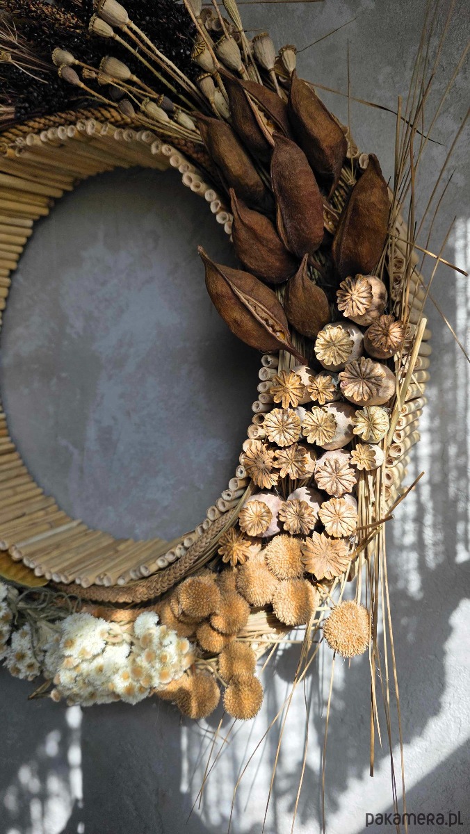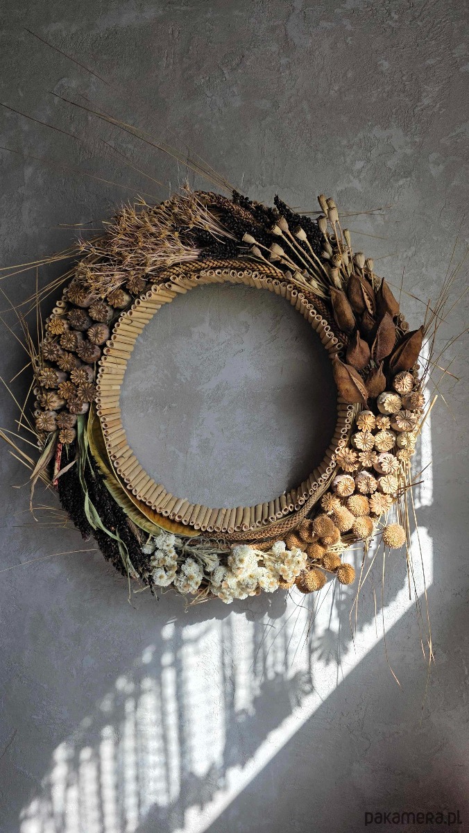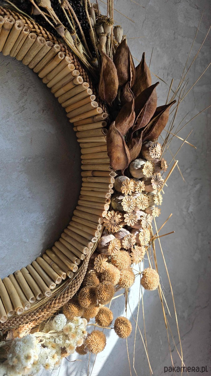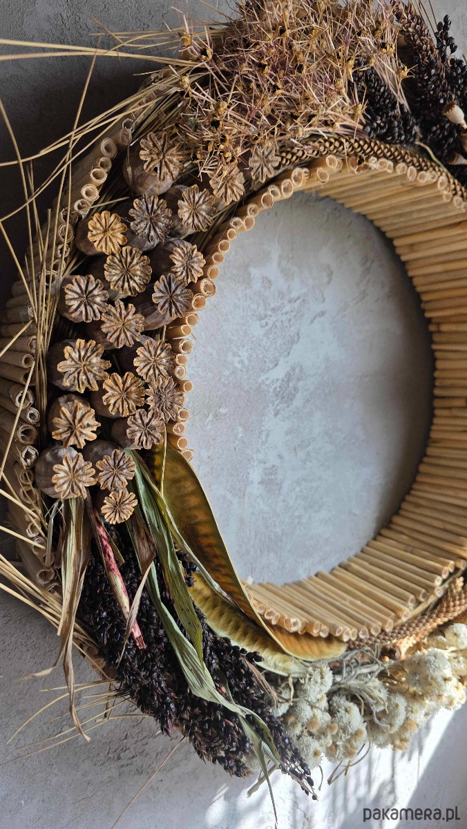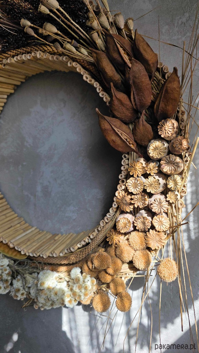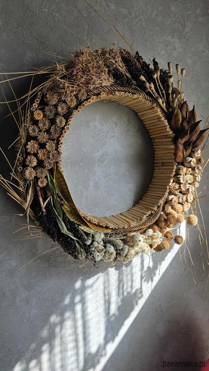 Wyjątkowy, ręcznie wykonany wianek w ciepłych, ziemistych odcieniach. Stworzony z naturalnych traw, makówek i suszonych roślin, zachwyca swoją strukturą i spokojną, organiczną formą.