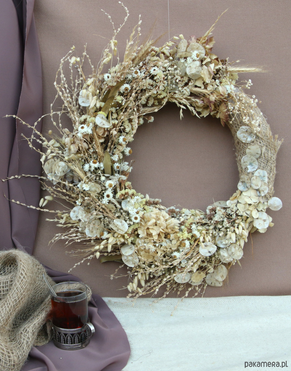 Wianek na podkładzie słomianym z białych roślin; magicznej lunarii, lepidium, złociszka i drżączki.