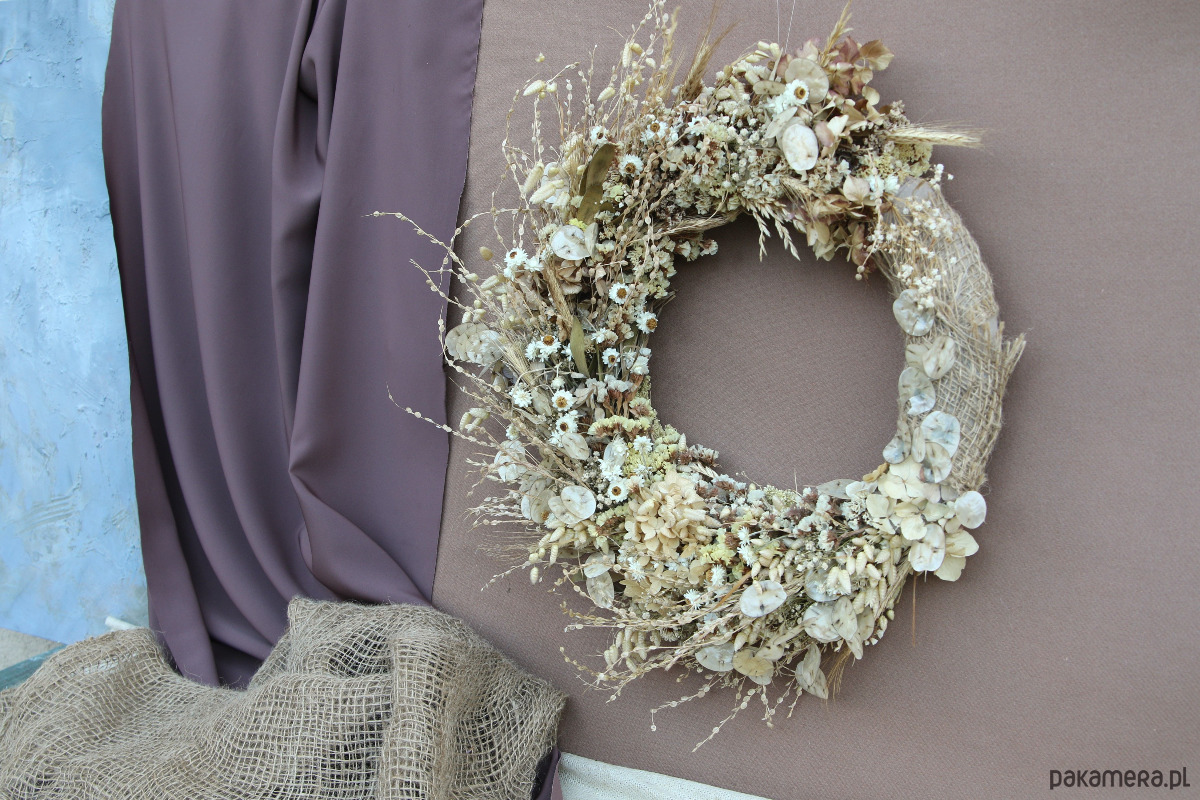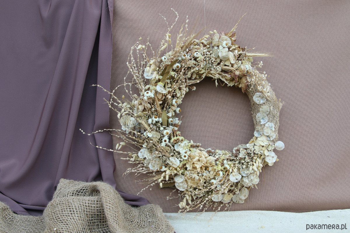 Oniryczny wianek dekoracyjny ,,Sen zimowy" z suszonych kwiatów. W zimowym klimacie, idealnie pasuje do aury za oknem. Dobry do wnętrz minimalistycznych, rustykalnych, vintage. Wianek idealny do zawieszenia na ścianie, drzwiach, do salonu, sypialni. Ma wygodną pentelkę, można zawiesić na gwoździku.