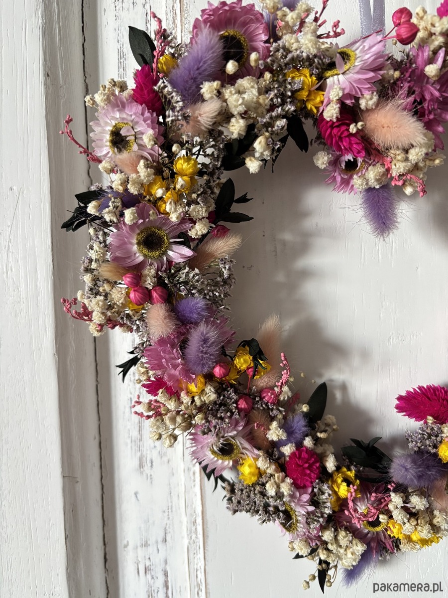 Żywe kwiaty kochają słońce i wodę. Suszone przeciwnie, więc jeśli chcesz by wianek dłużej Cię cieszył, trzymaj go z dala od bezpośredniego działania promieni słonecznych oraz wilgoci.