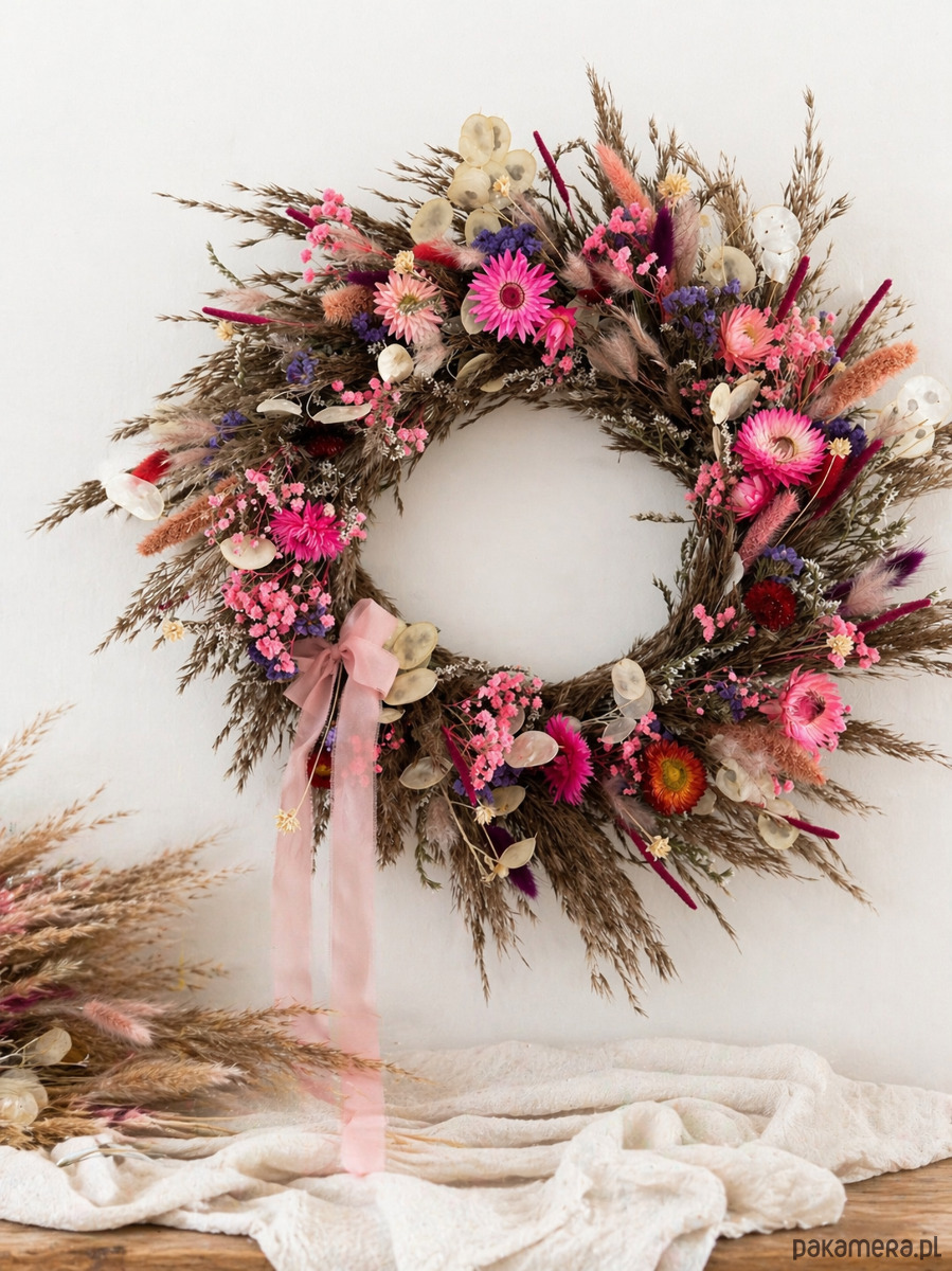 Kompozycja świetnie sprawdzi się jako dekoracja wnętrza. Można zawiesić wianek na ścianie, oknie, drzwiach, nad kominkiem lub postawić na stole.