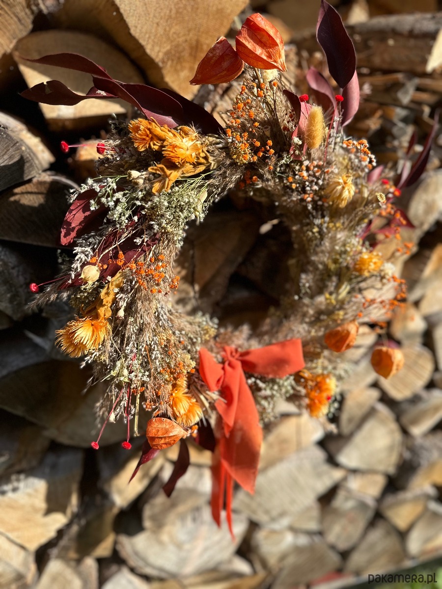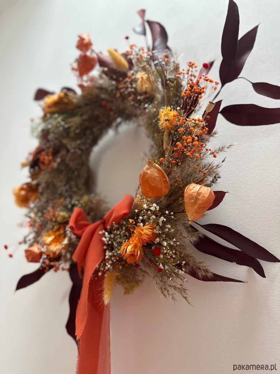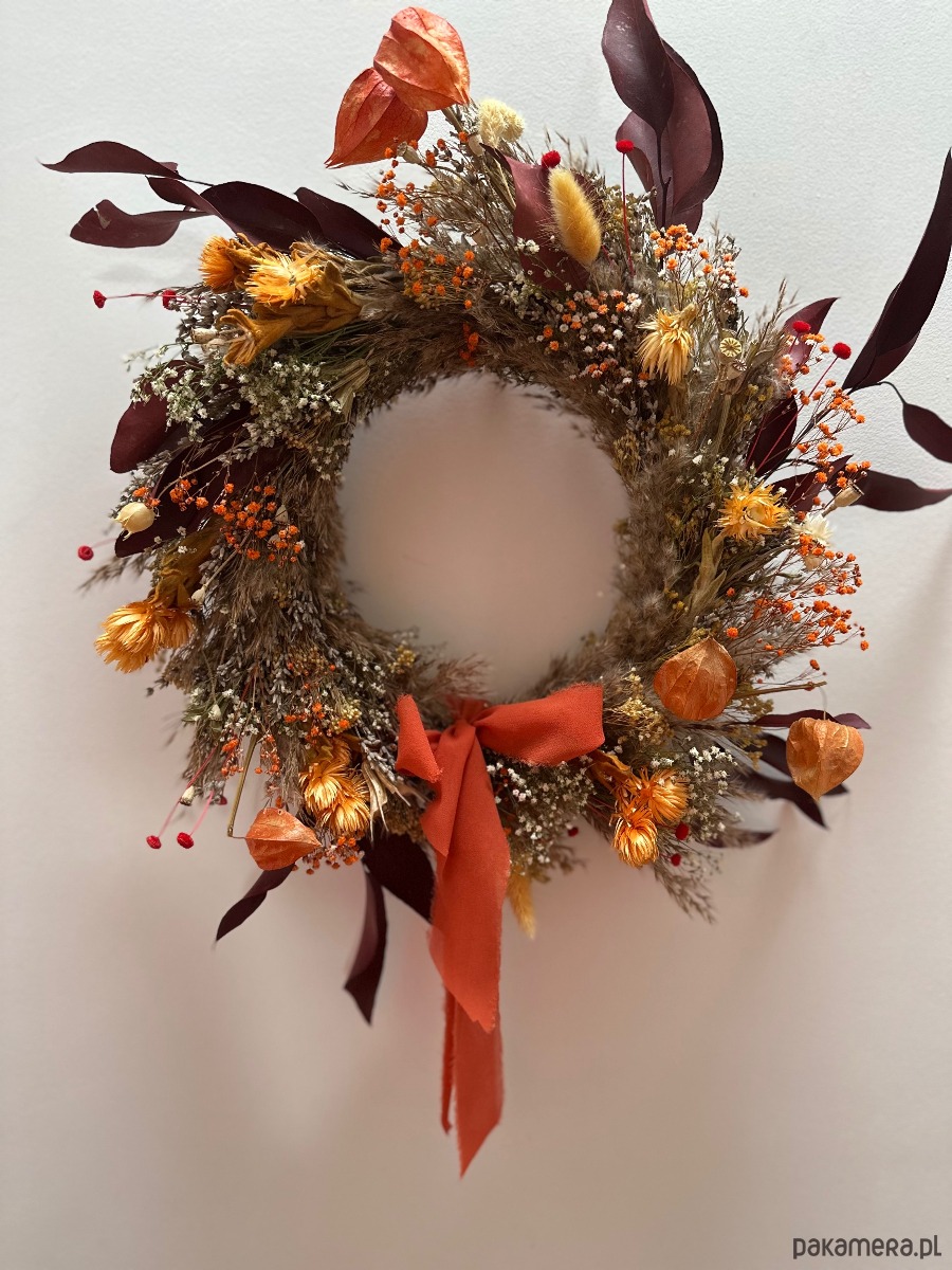 Wianek wykonany na słomianym podkładzie z wykorzystaniem roślinności suszonej i stabilizowanej m.in: