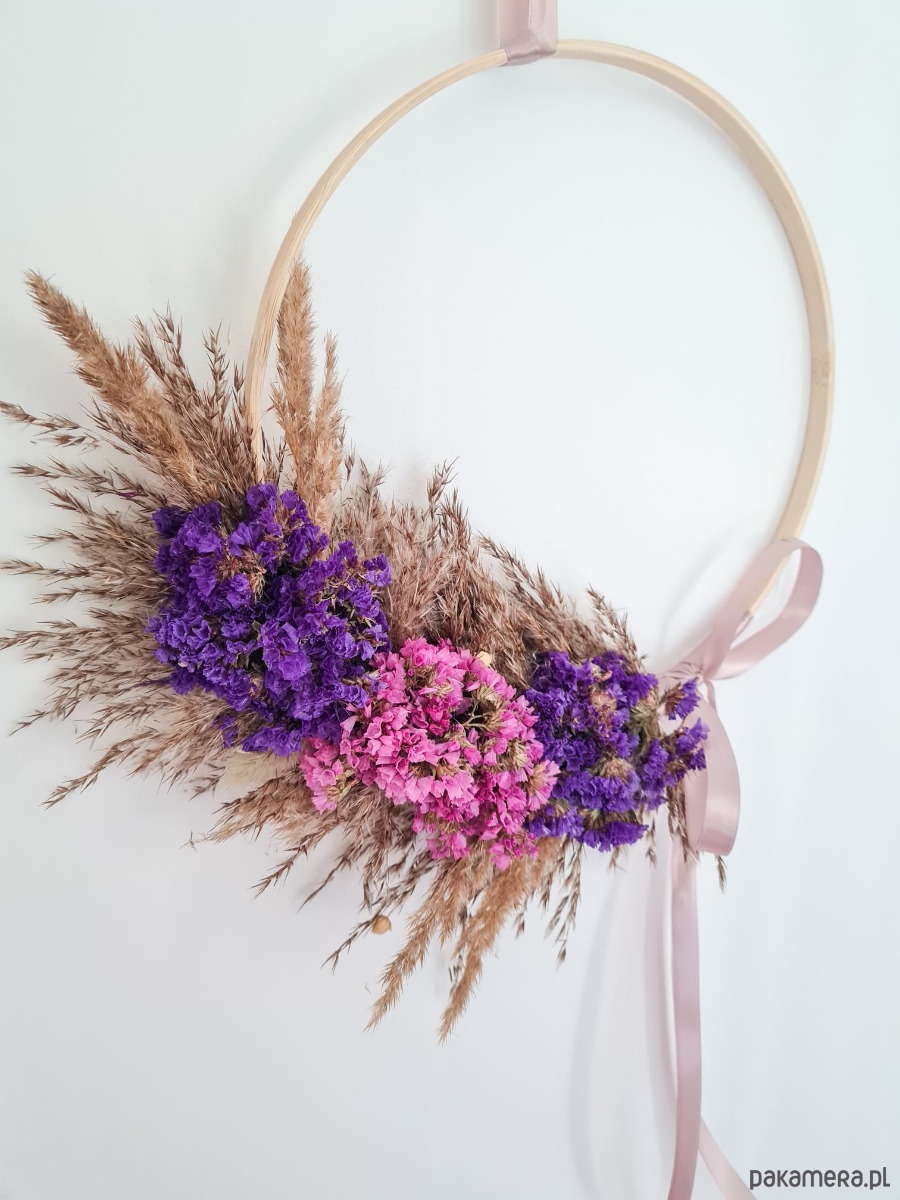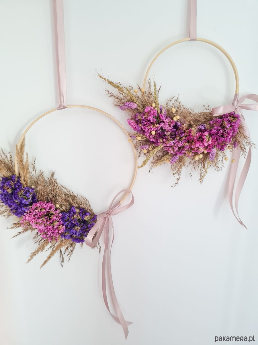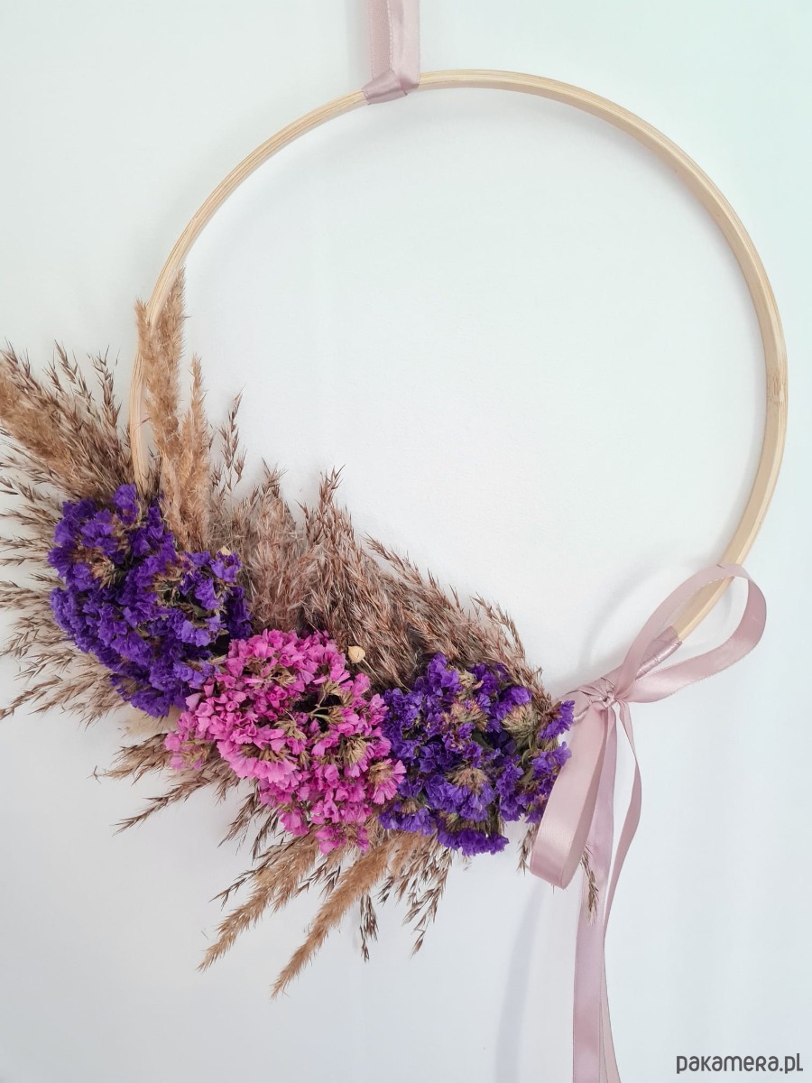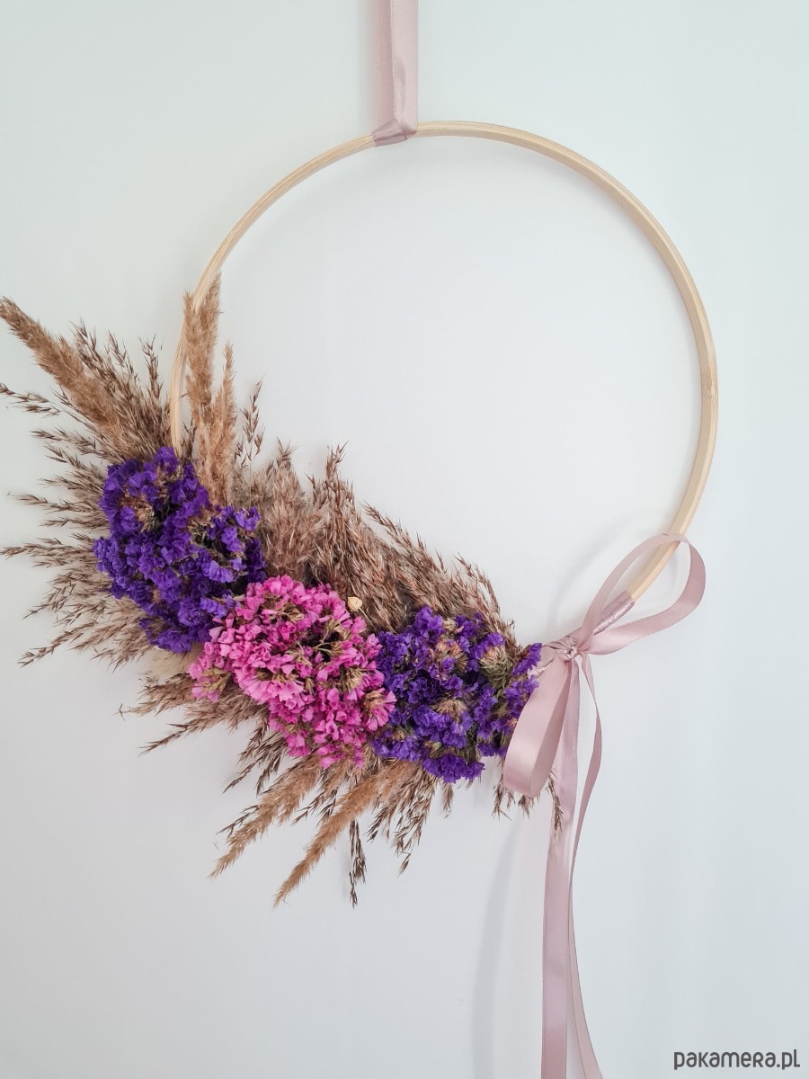 Materiał: bambusowa obręcz, suszone kwiaty, wstążka atłasowa