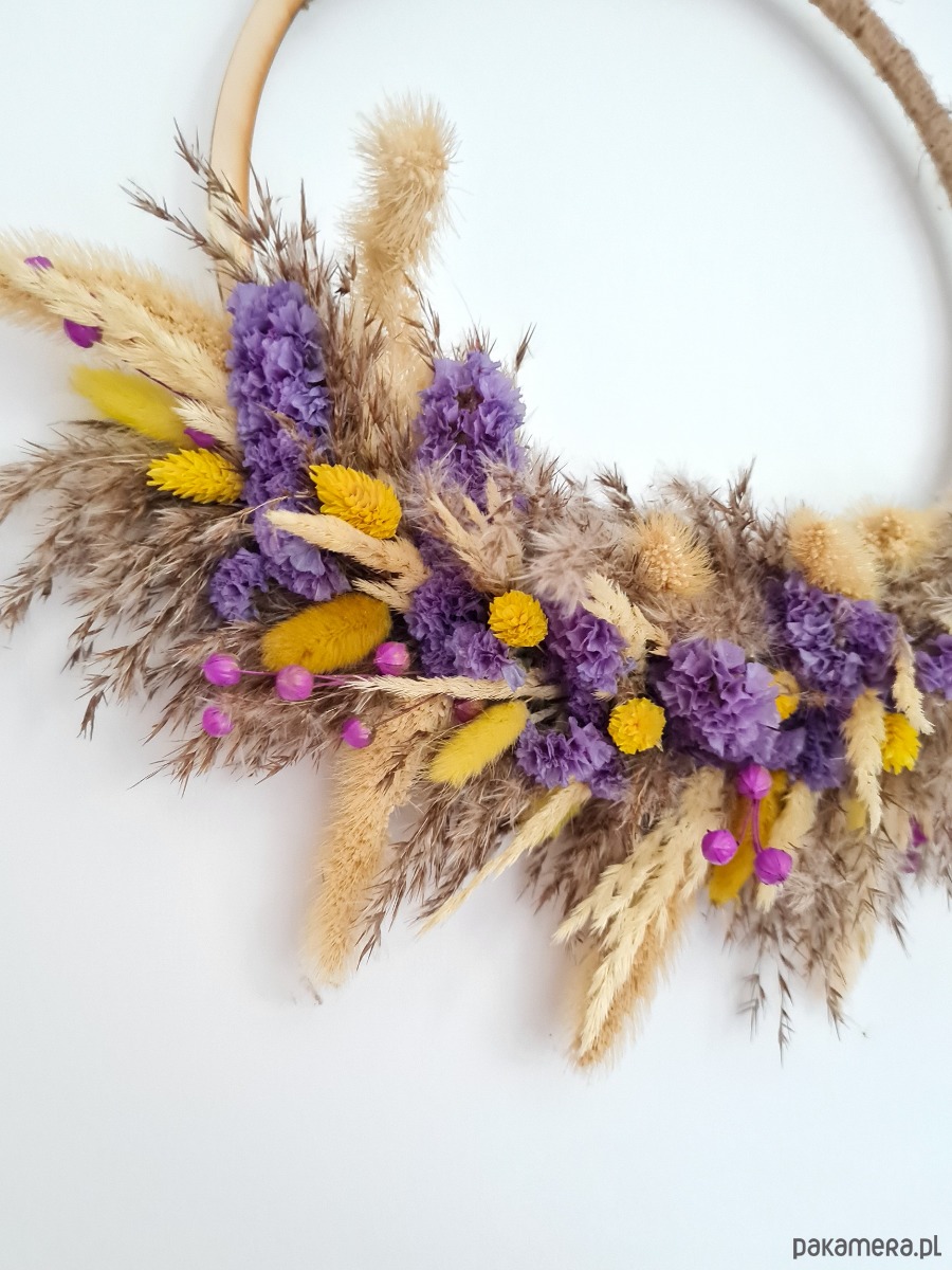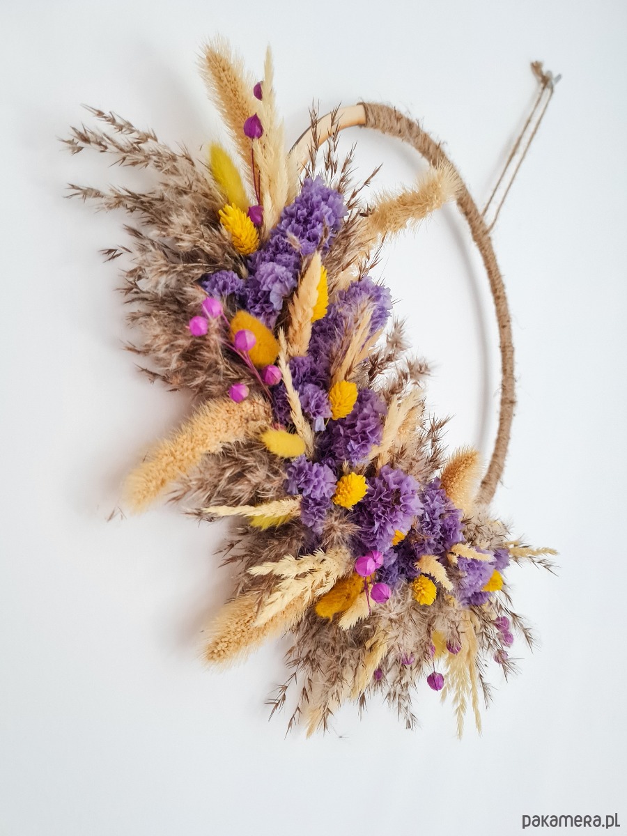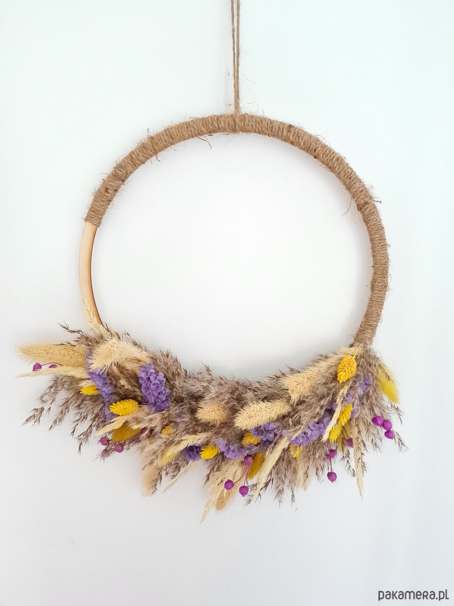 Materiał: drewniana obręcz, suszone kwiaty, konopny sznurek
