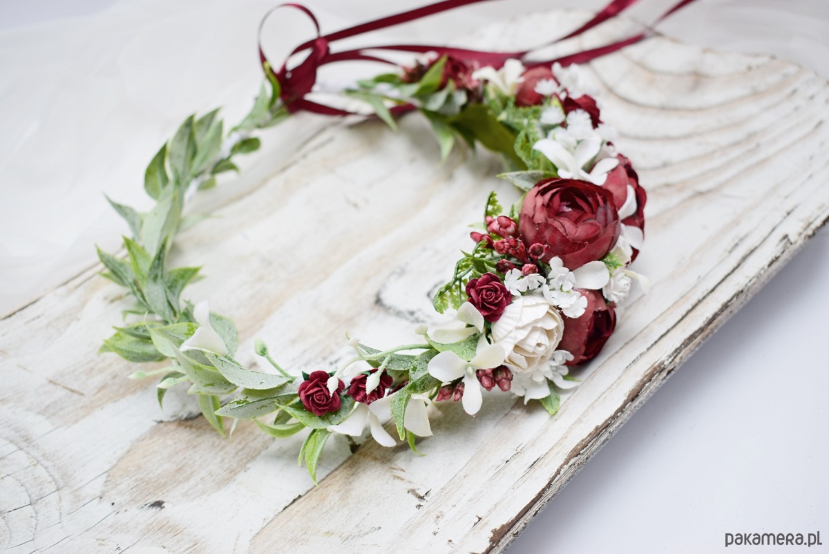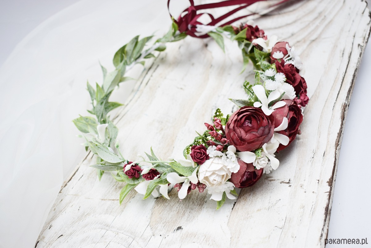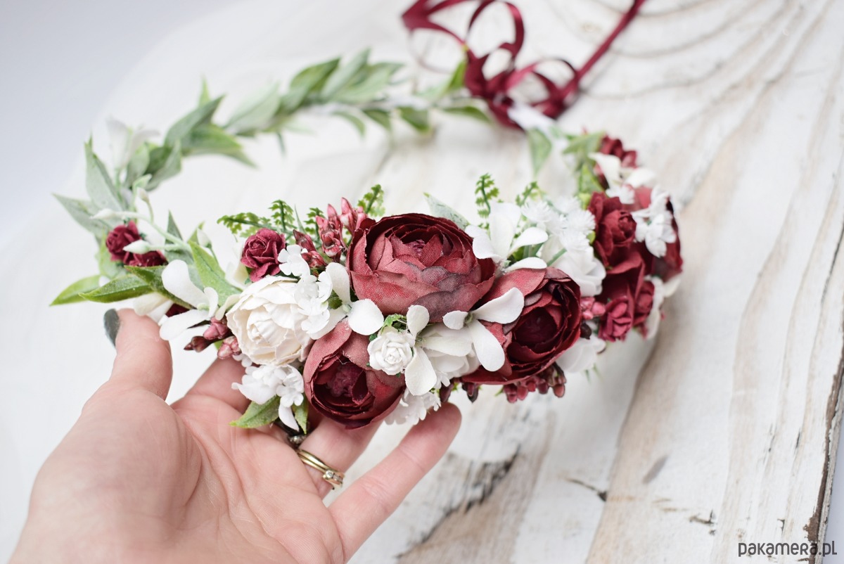 Wianek ślubny w stylu boho, biel, bordo z dodatkiem kwiatów gipsówki.
