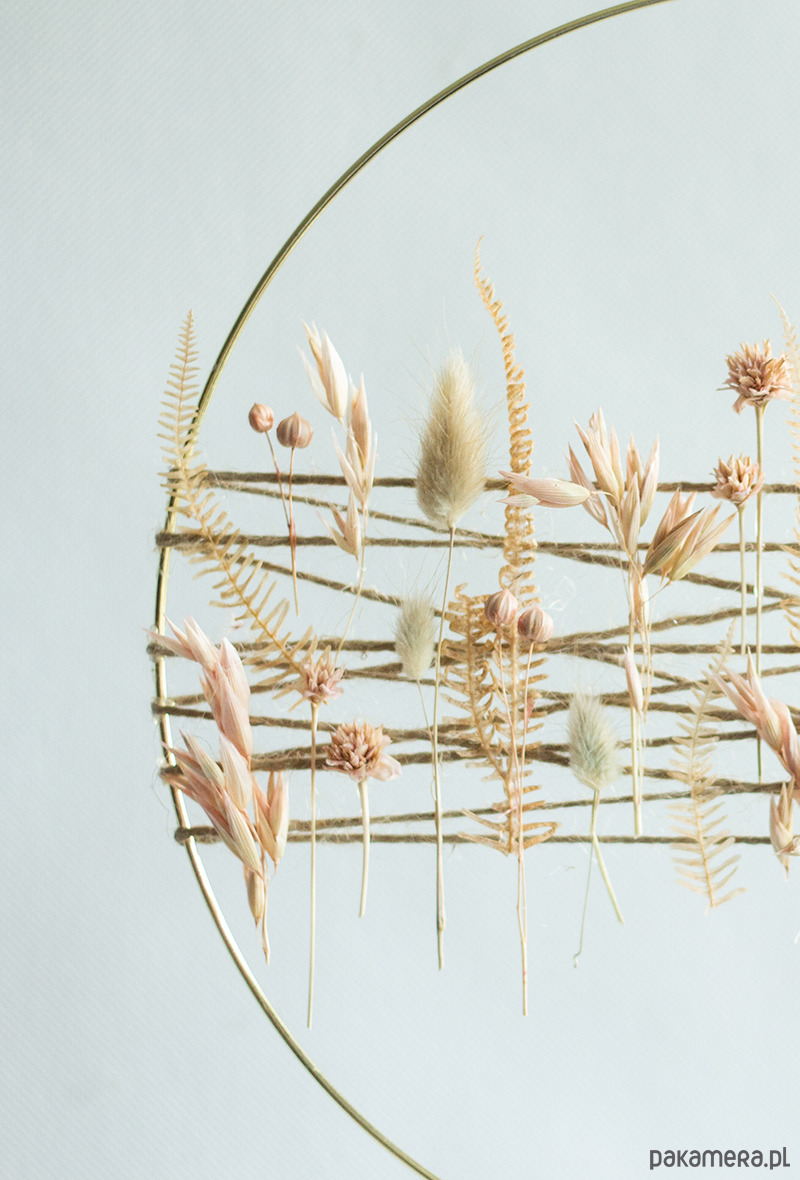 Nowoczesna forma wianka na złotej obręczy. Wykonany na sznurku jutowym z suszonymi roślinami w jasno brzoskwiniowym kolorze. Głównym elementem wianka jest suszony owiec oraz paproć helecho karmelowa. Wianek można powiesić jako dekoracja drzwi, okna lub na ścianie na przykład nad komodą. Nada wnętrzu charakteru.